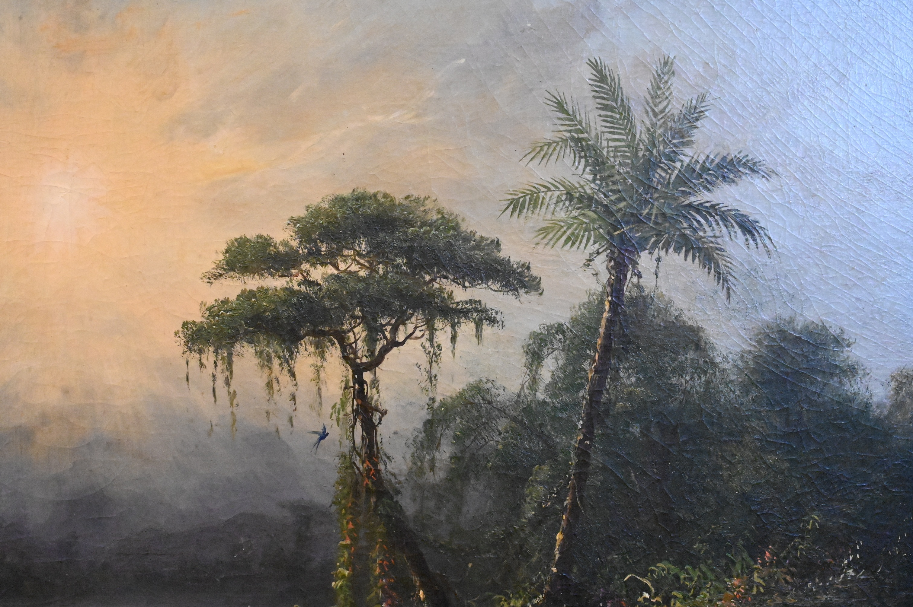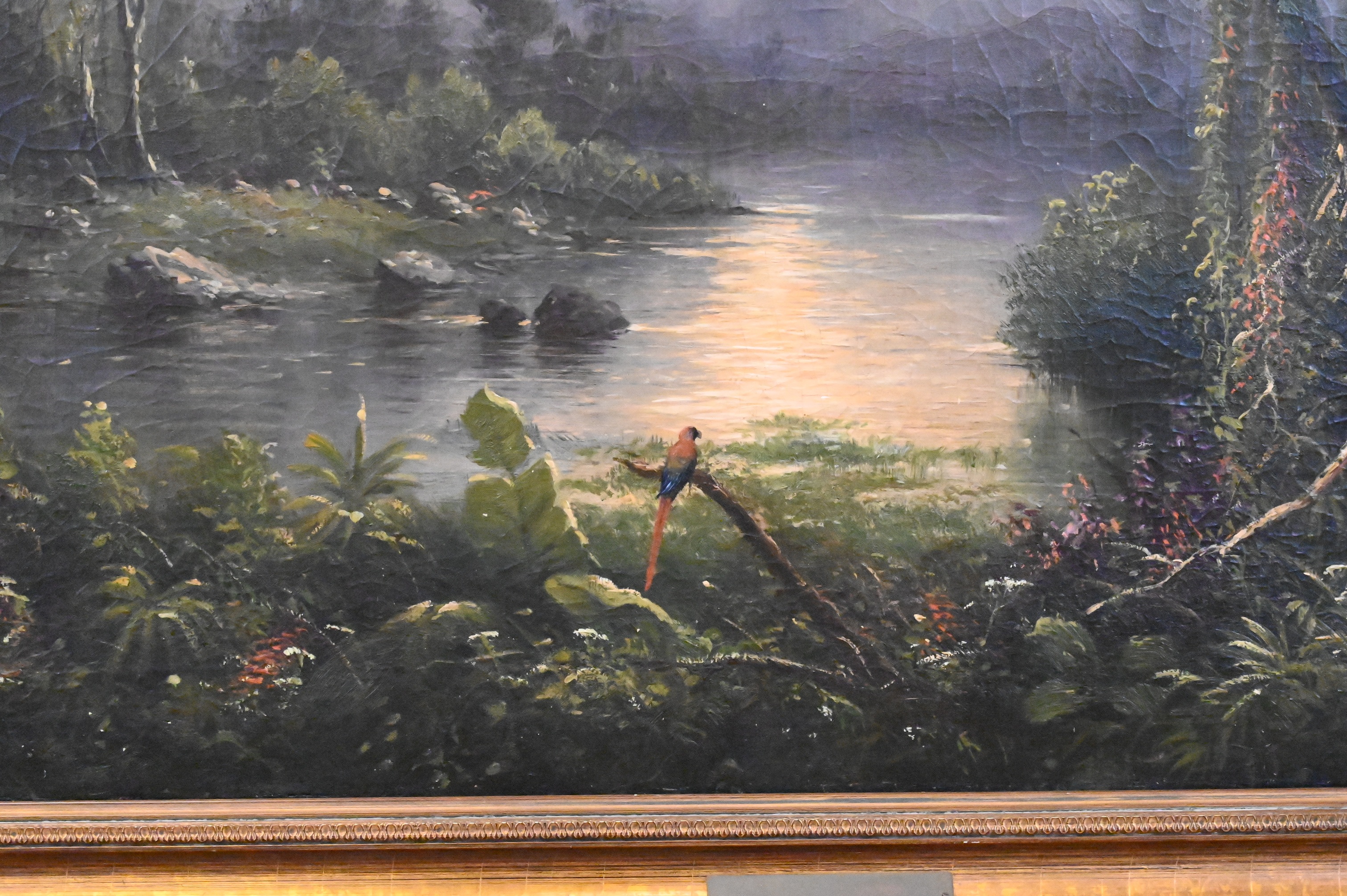 Lush and atmospheric tropical landscape depicting a radiant sunrise flooding the sky with gold and silver light, the brilliance reflected across a calm river that winds through dense, exotic foliage. Palm trees and heavily draped vines frame the composition at right, with rich foreground botanicals, rocks, and a brightly colored parrot perched near the water’s edge. The distant mountains dissolve into mist, creating strong depth and a dramatic interplay of light and shadow characteristic of 19th-century Romantic landscape painting