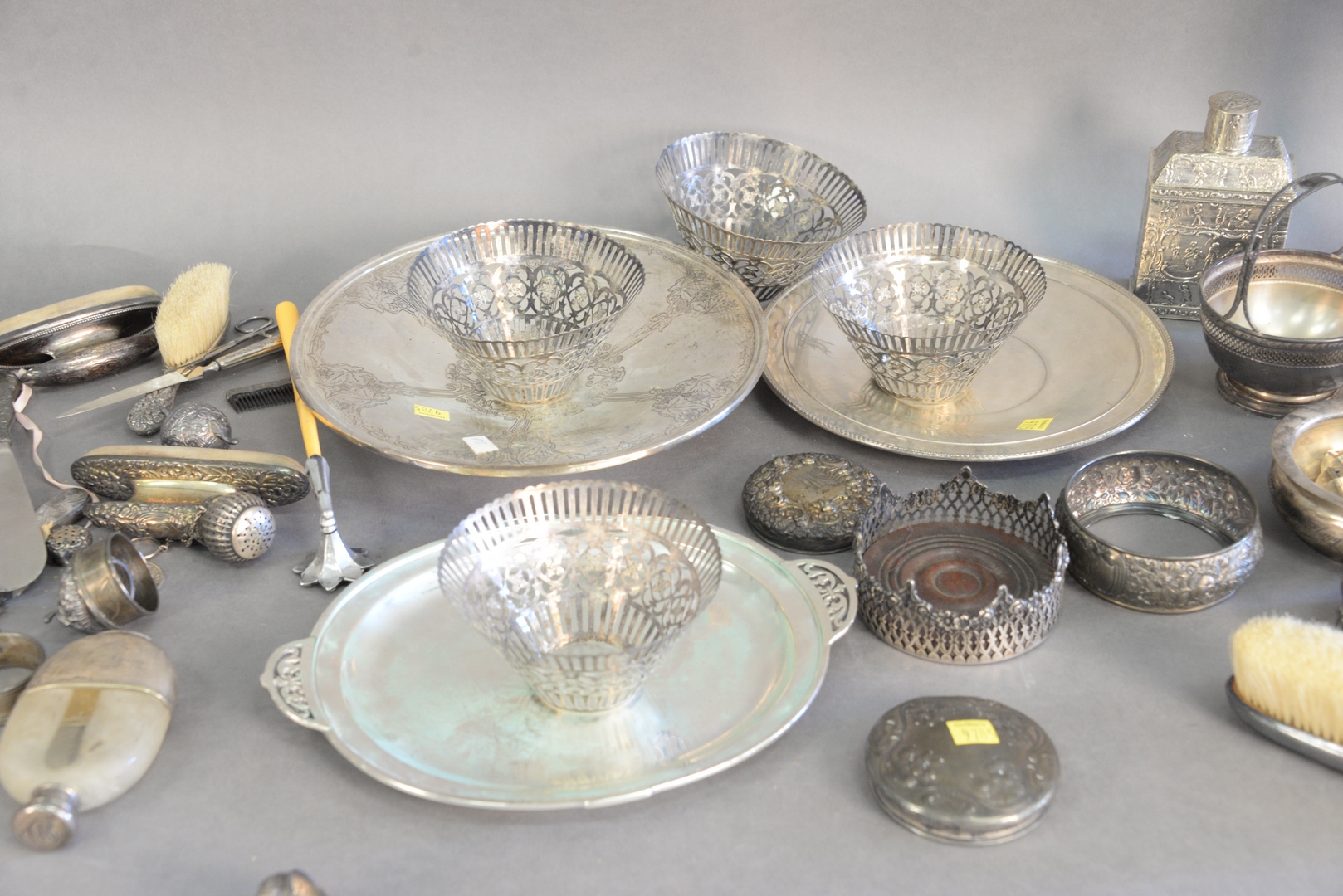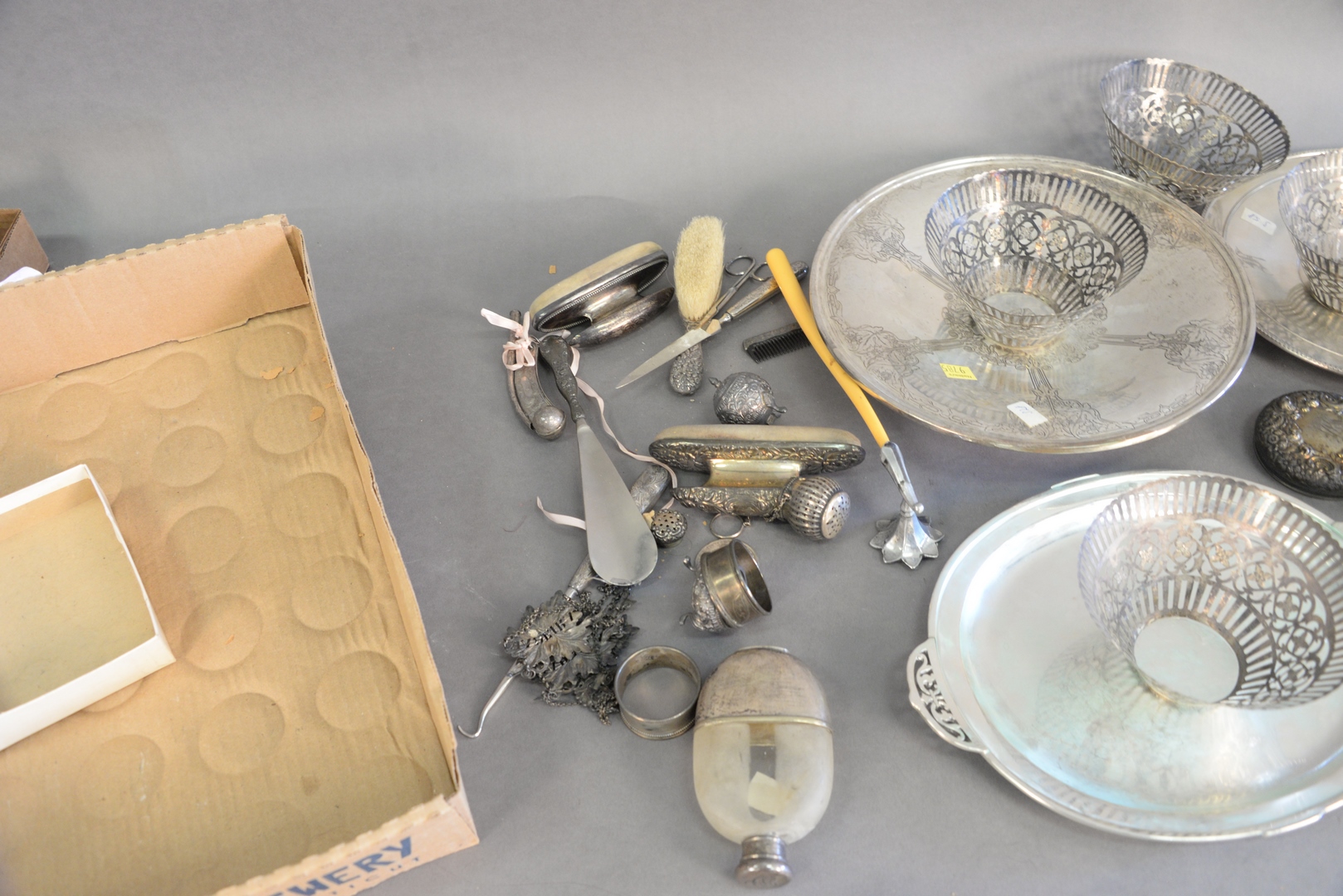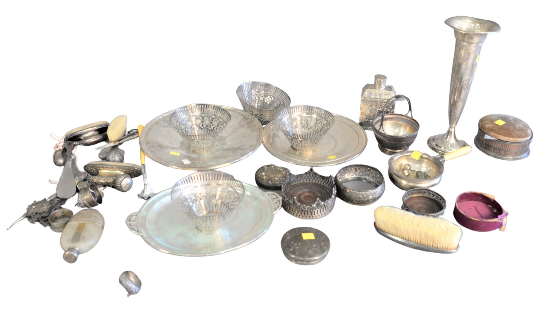 Lot 343: Sterling Silver Lot, to include stone tray; four leafy white labels; Continental silver covered container; tea ball; baby rattles; two plates; covers; four shades and with several weighted items, coaster, etc., 343 t.oz.