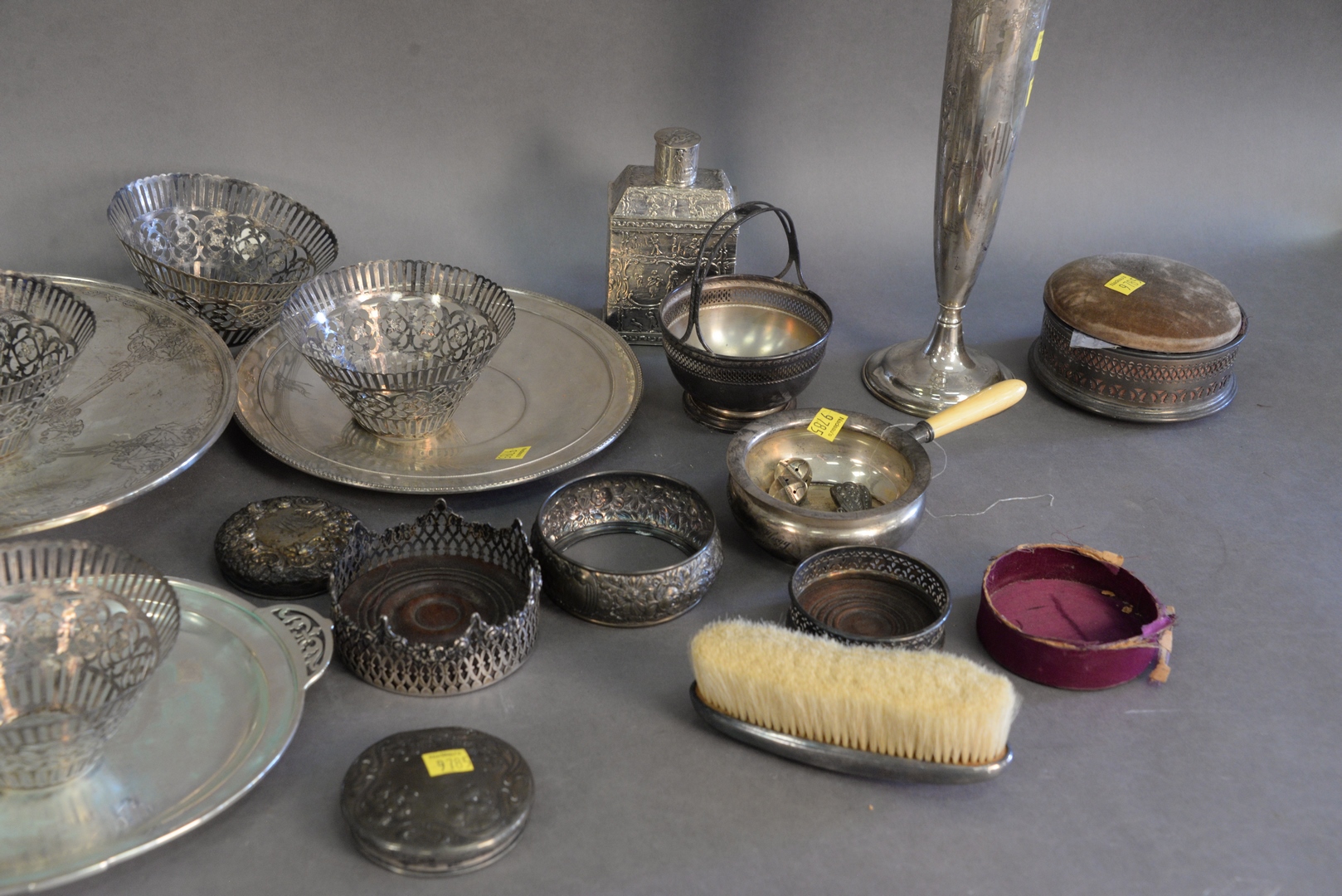 Sterling Silver Lot, to include stone tray; four leafy white labels; Continental silver covered container; tea ball; baby rattles; two plates; covers; four shades and with several weighted items, coaster, etc., 343 t.oz.