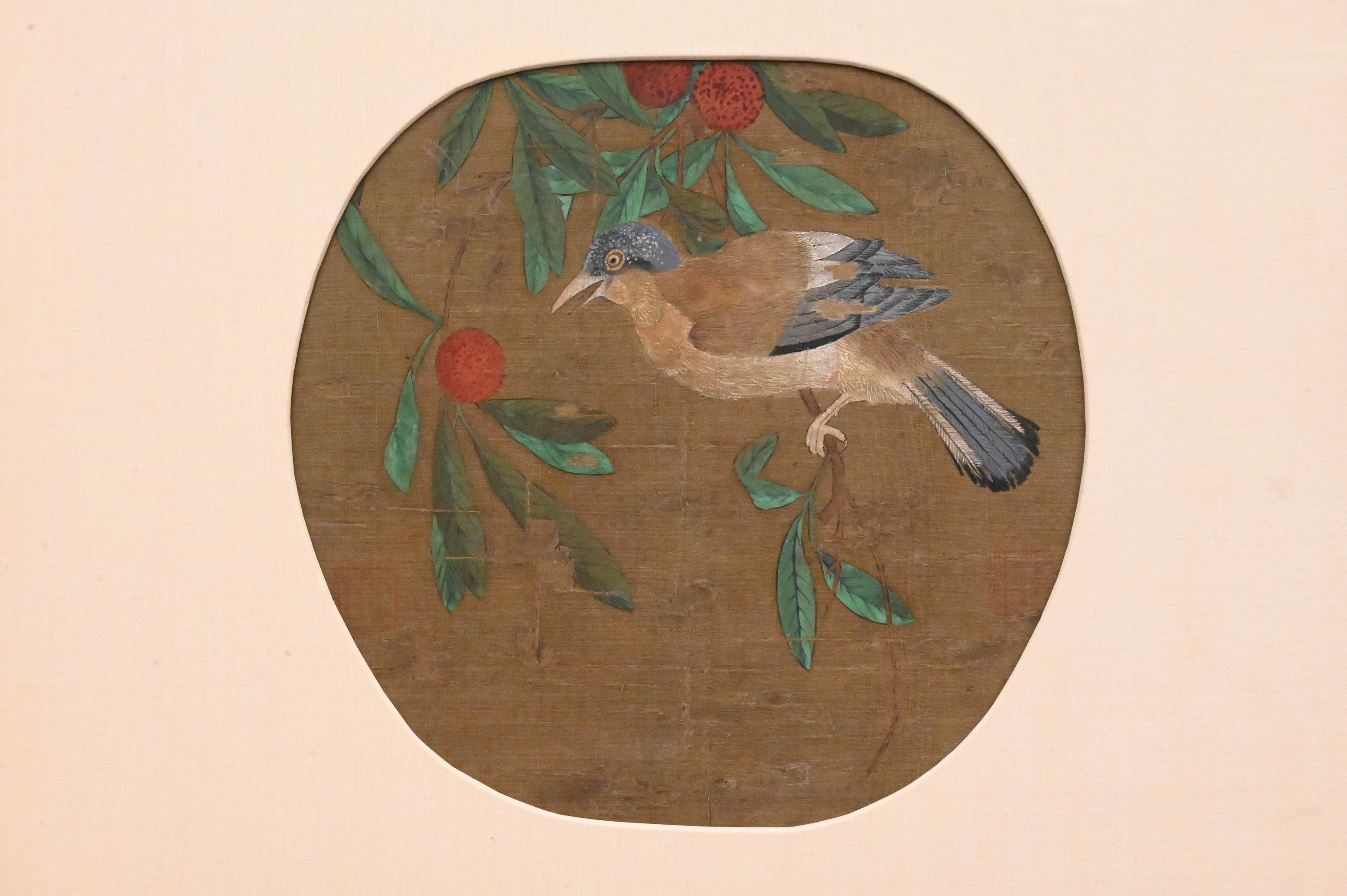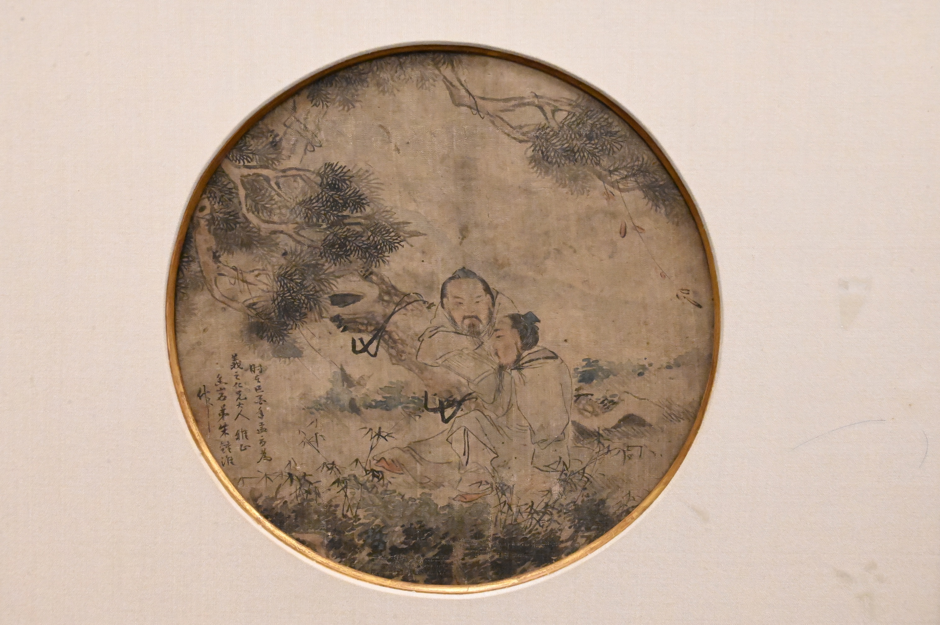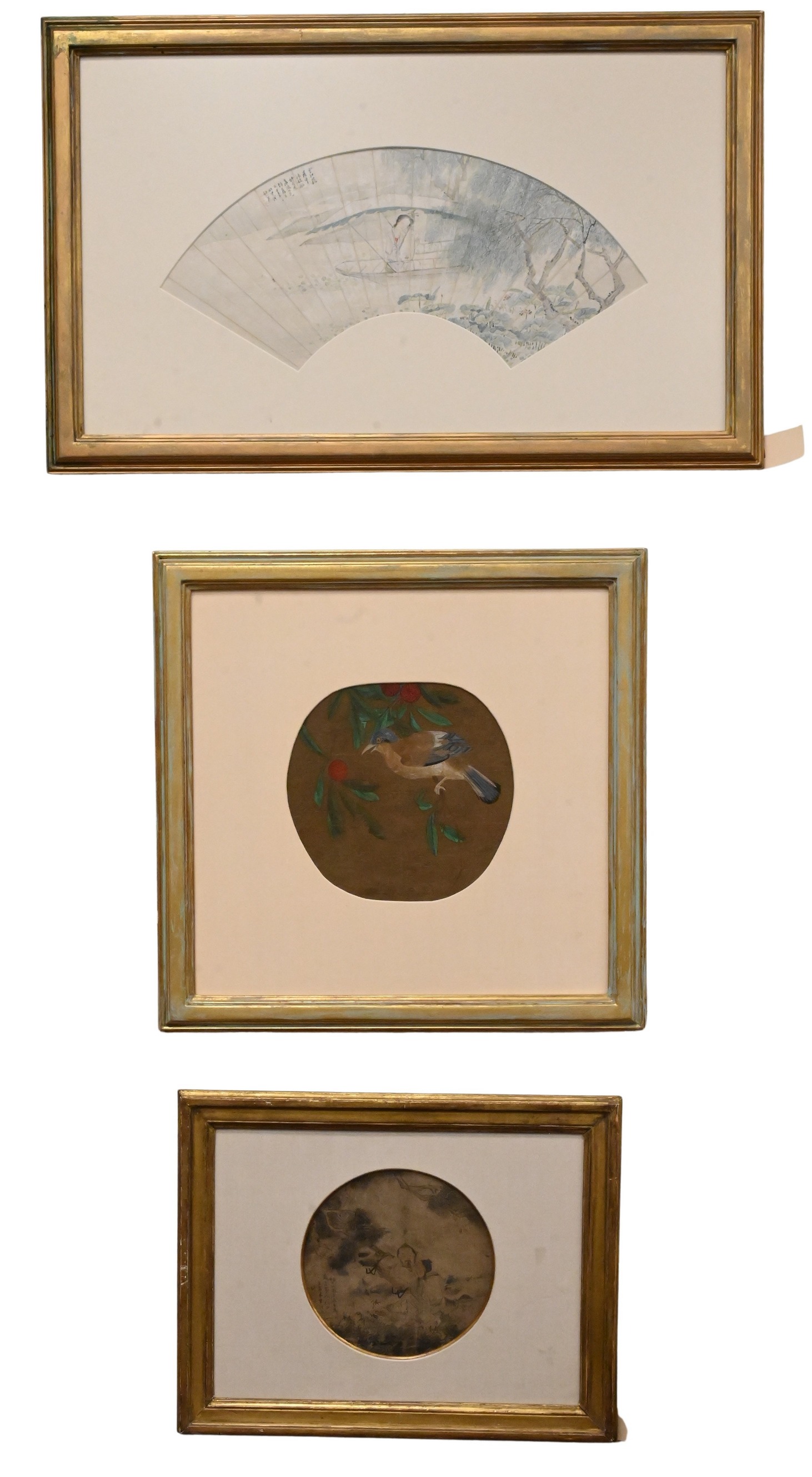 including a circular silk panel depicting a bird perched on a leafy branch bearing red fruit, and a circular silk panel depicting two scholars seated beneath a pine tree with calligraphic inscription, both executed in ink and color on silk, each mounted and framed along with shaped watercolor depicting a lady seated in a boat within a riverside landscape with willow tree and inscription