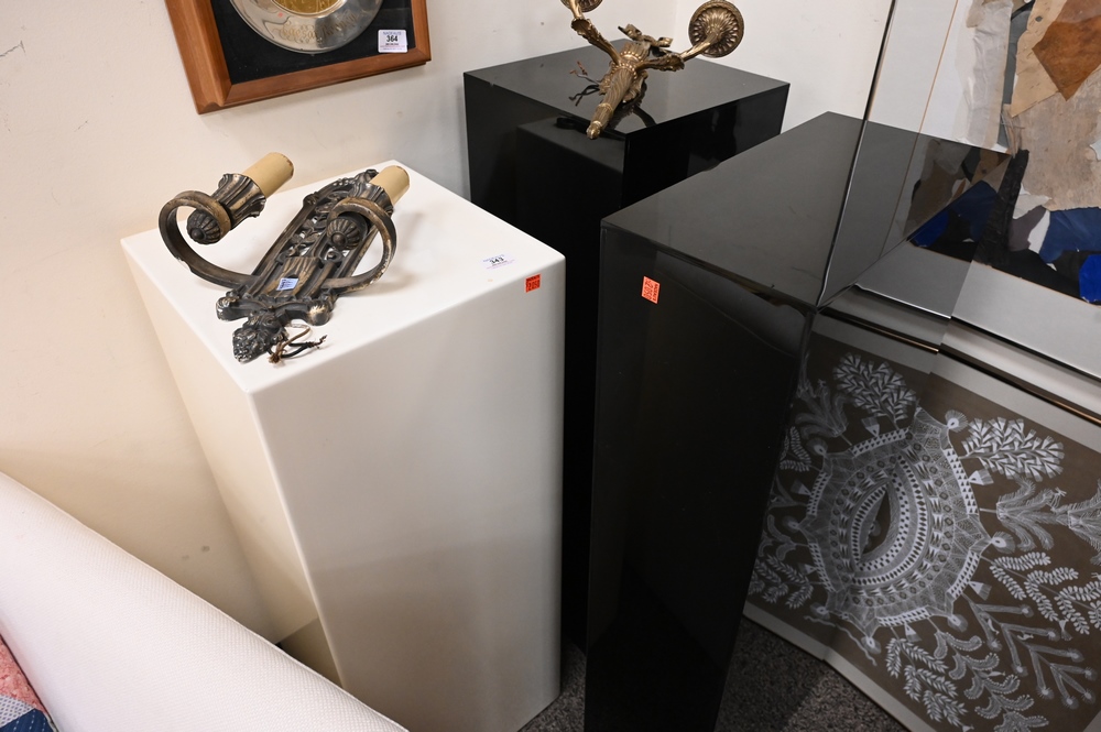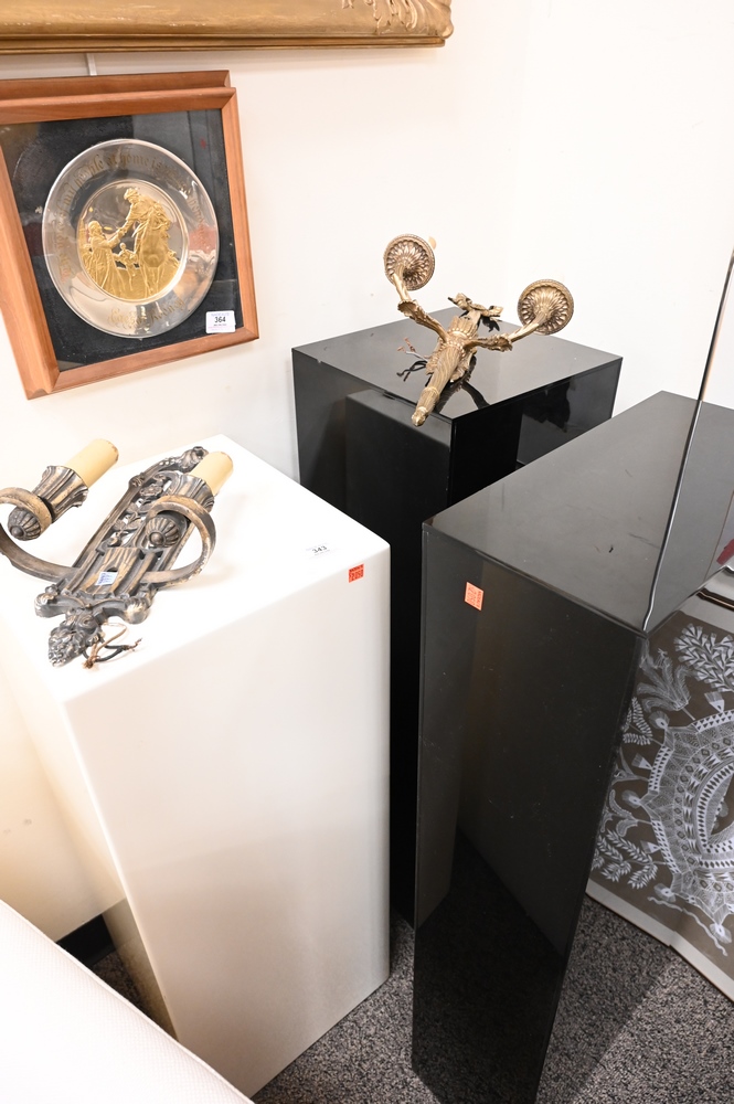 Lot 343: Three Pedestals, to include one white lacquered, along with two black plexiglass pedestals, white height 36 inches, top 14″ x 14″.