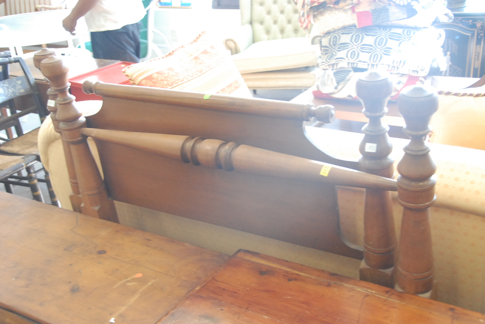 Three piece lot primitive rope bed, teak coffee table and primitive candlestand.