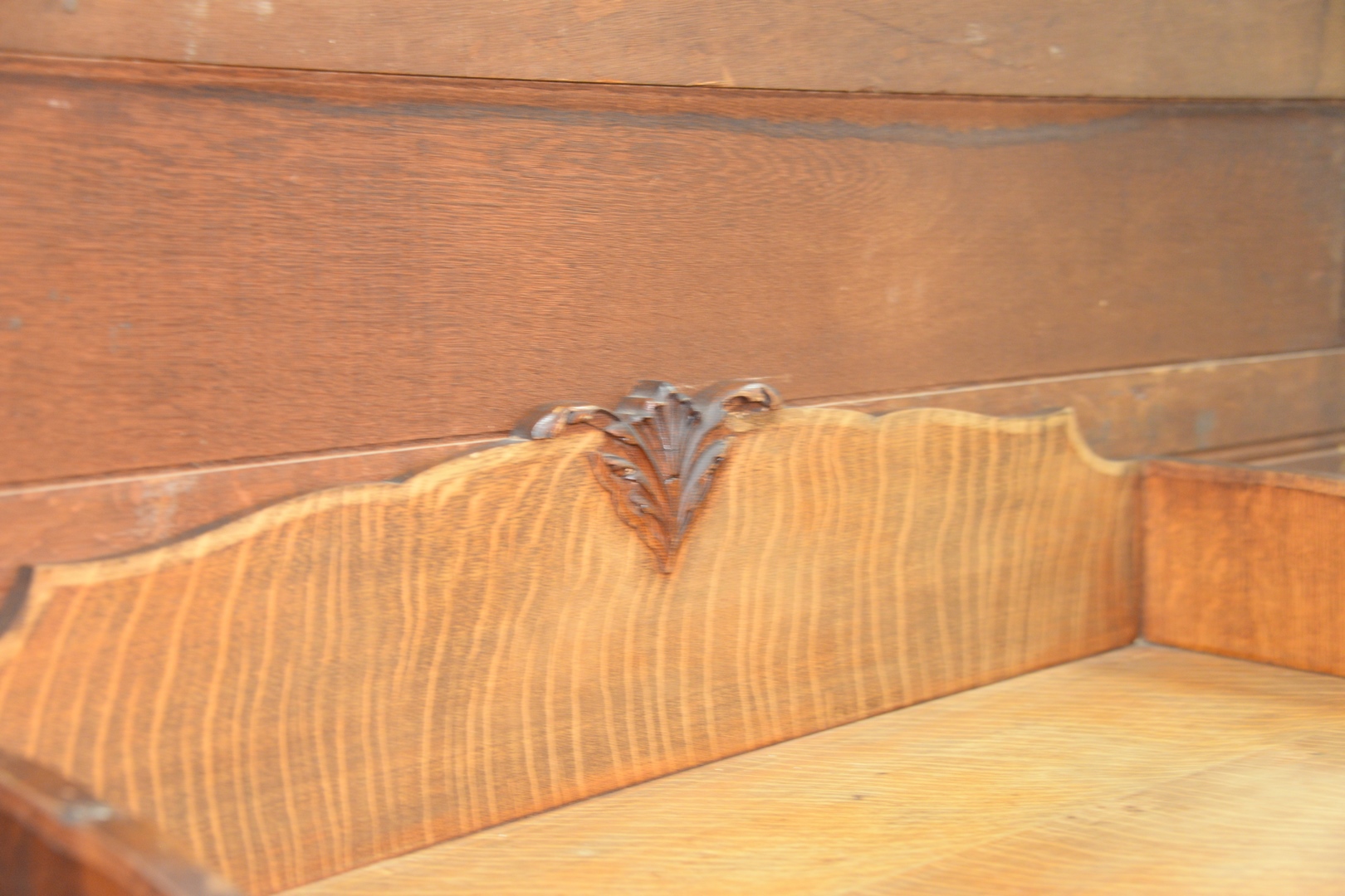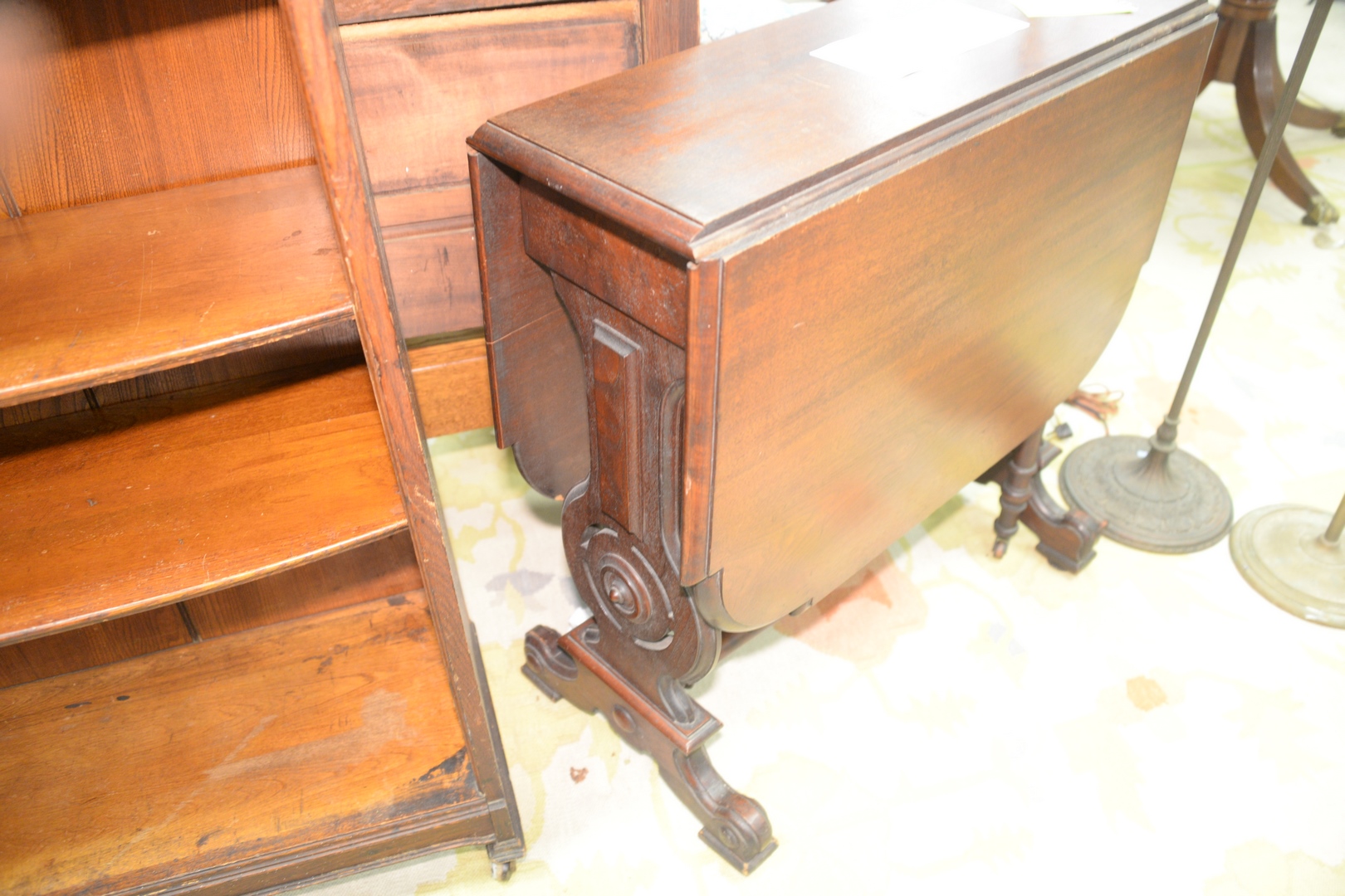 Lot 344: 4 piece Victorian lot, oak bookcase, Victorian walnut drop-leaf table, chestnut chest and high back bed Height 46, top 19 x 39-1…