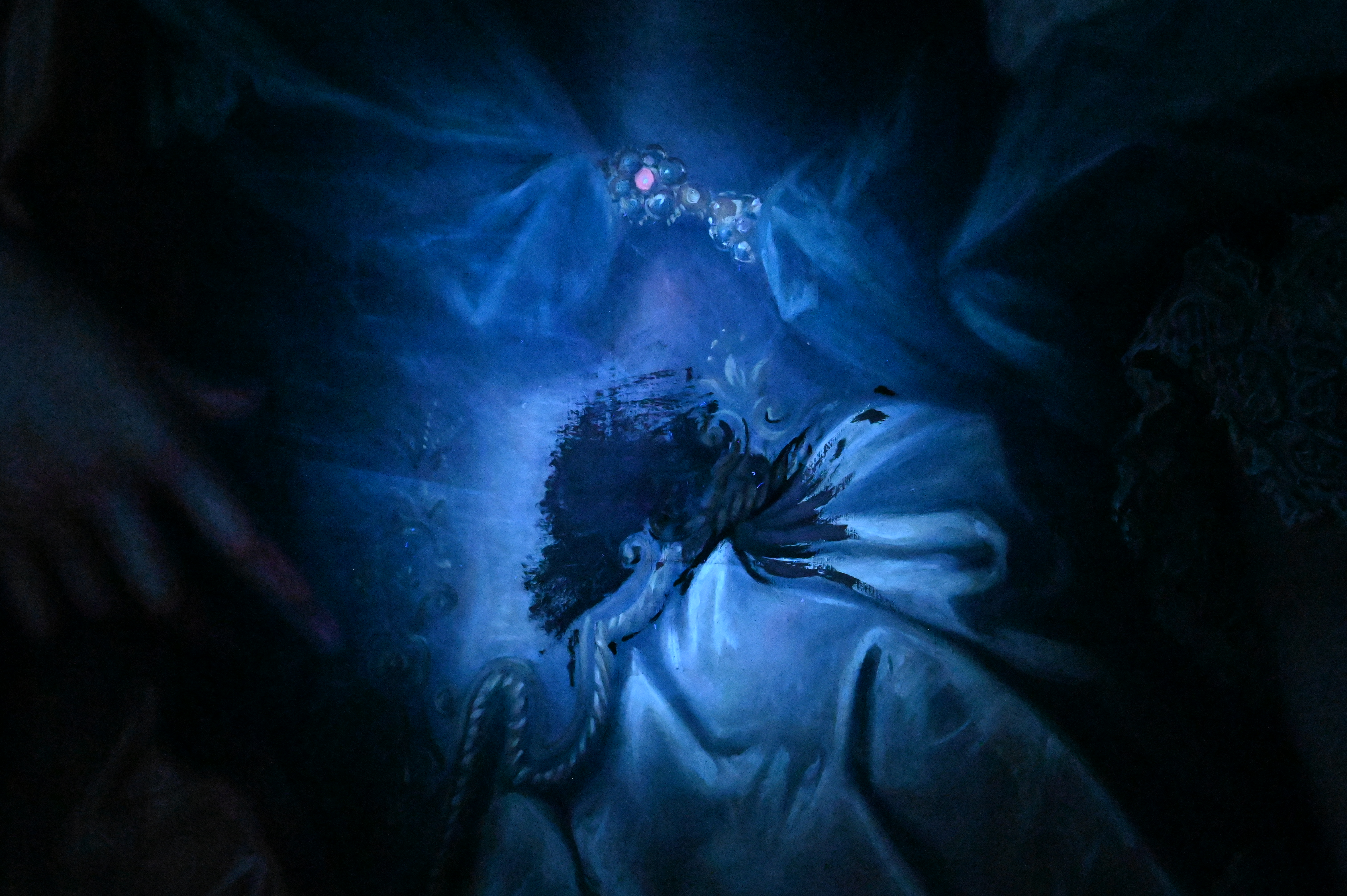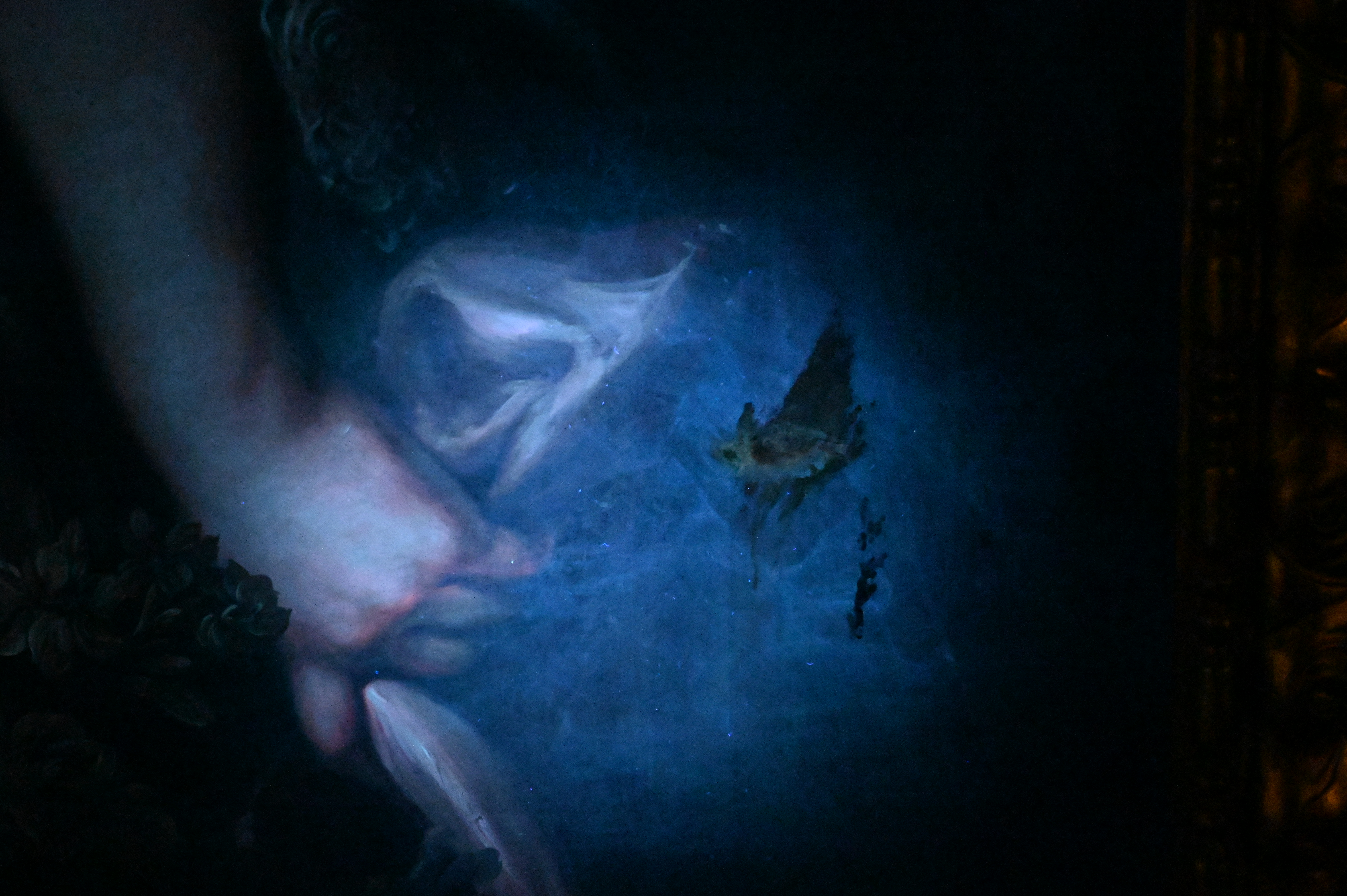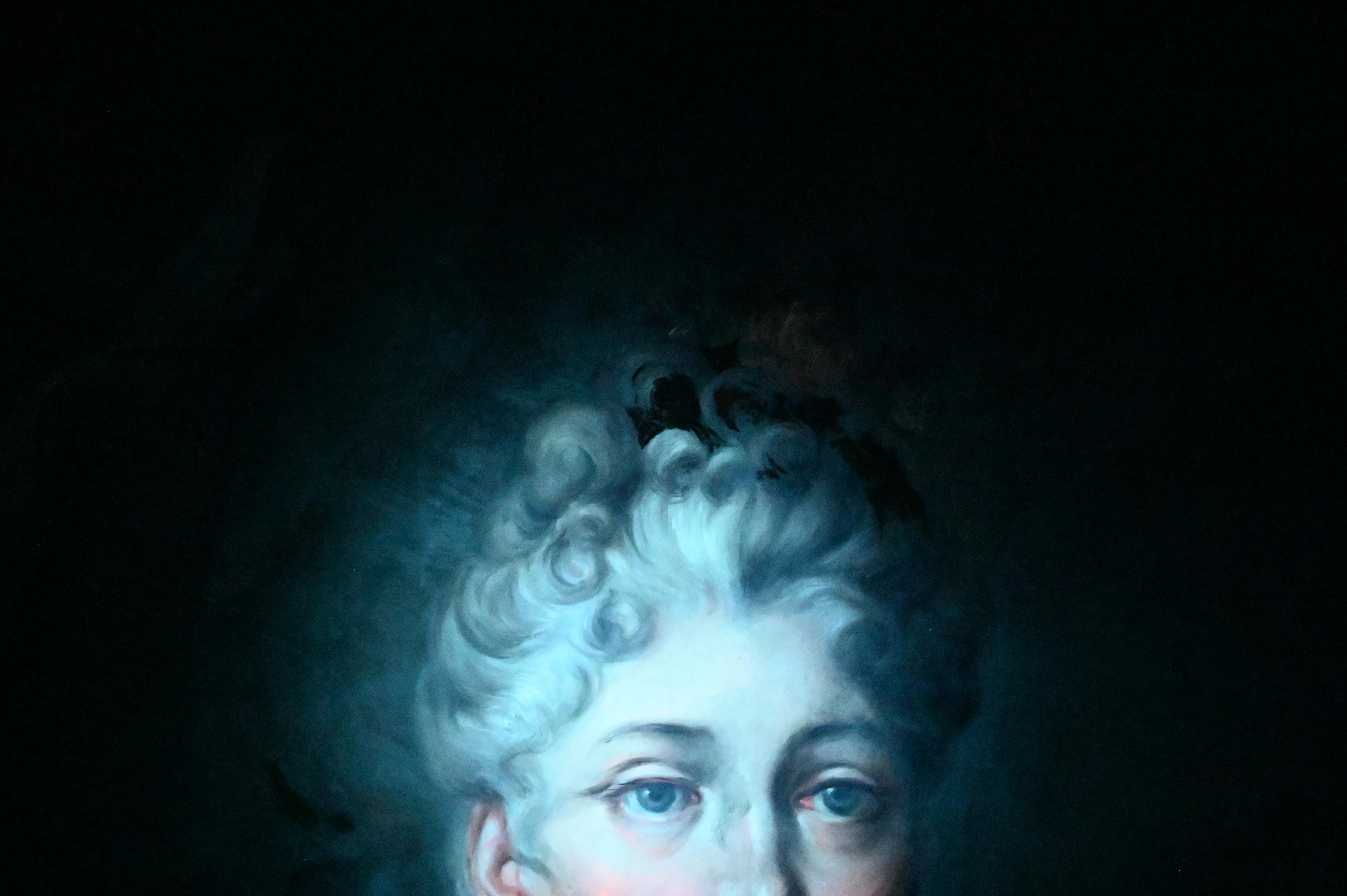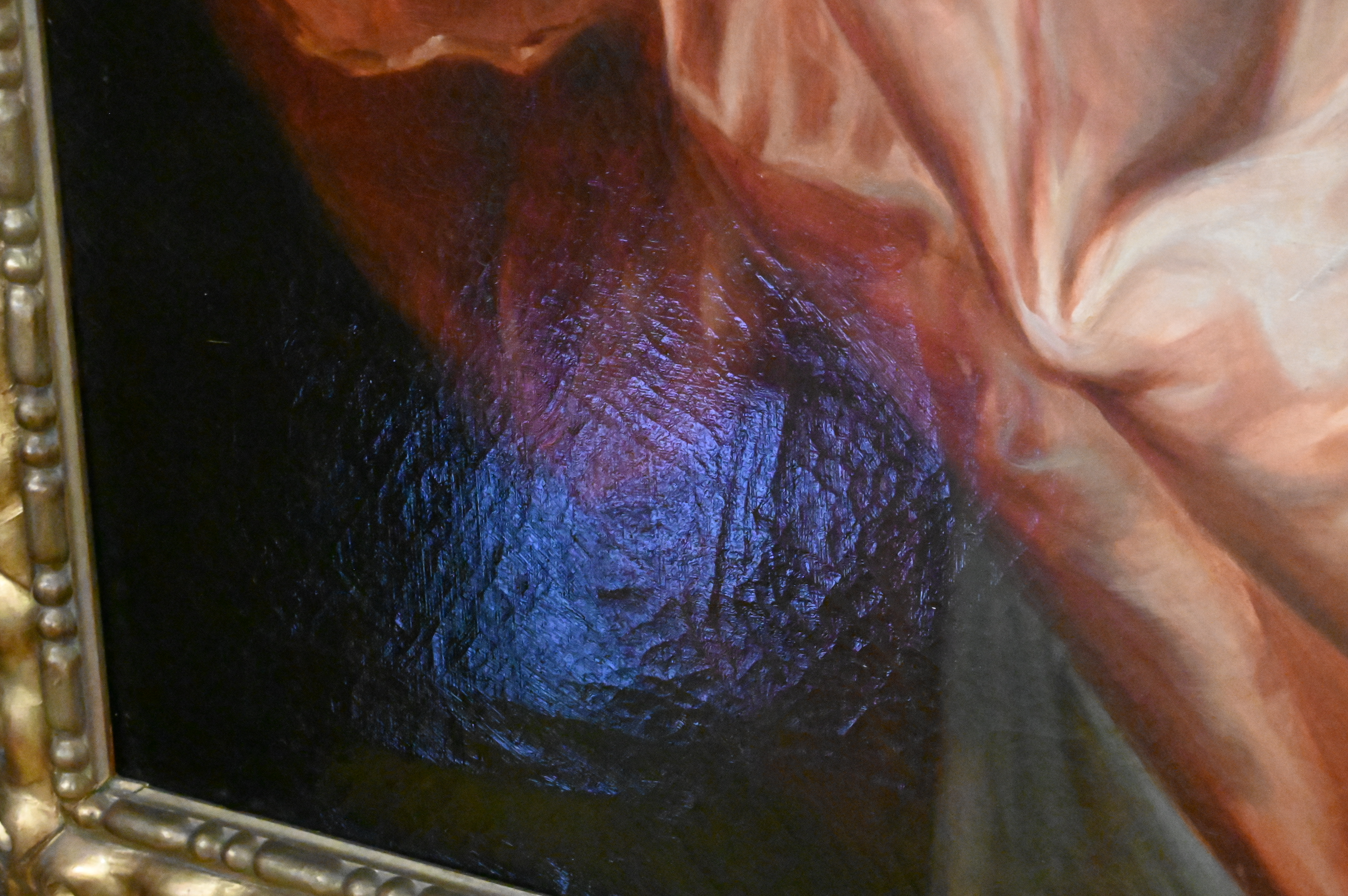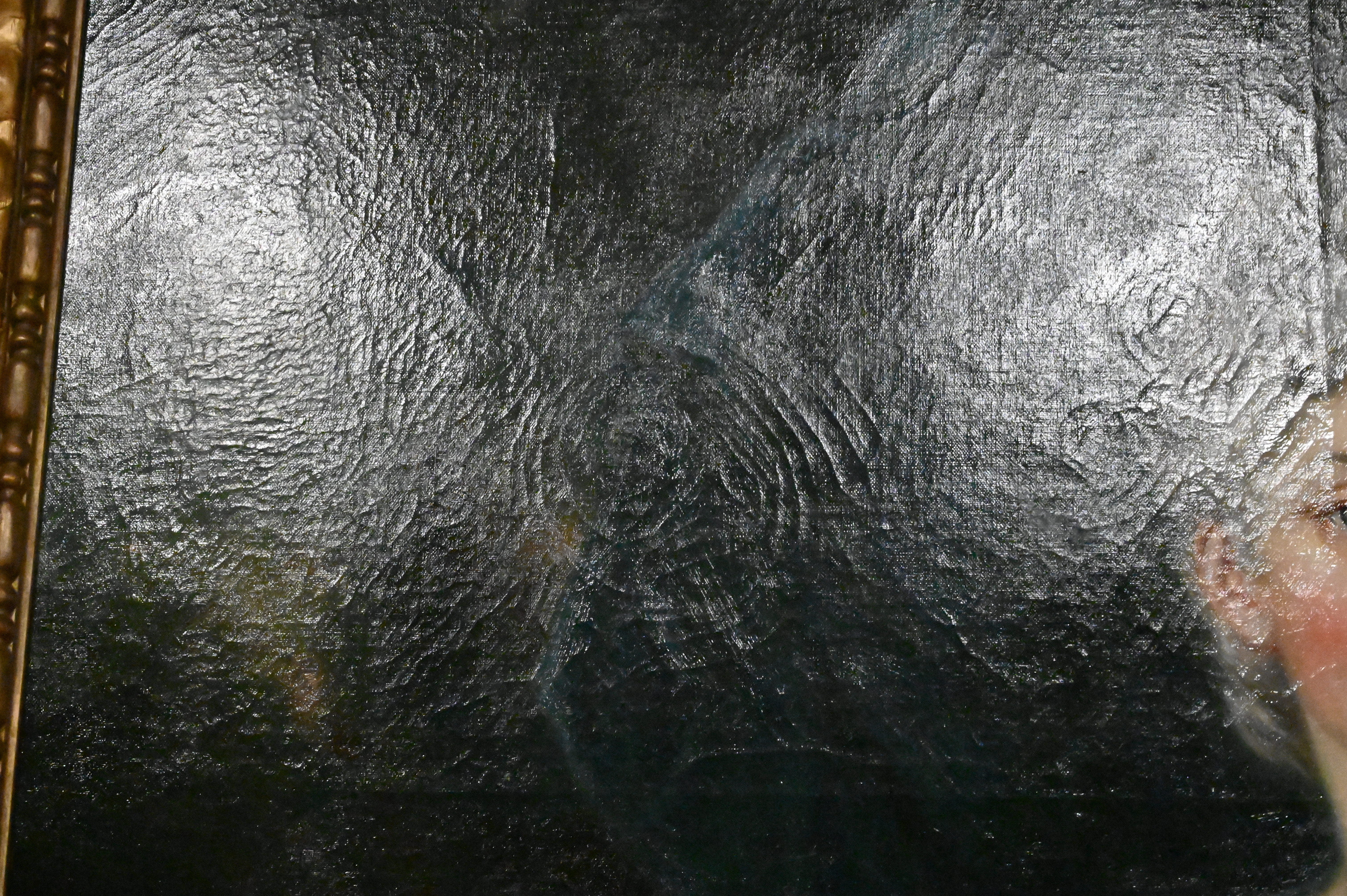 Canvas relined and restretched, stretcher marks to center. craquelure. inpainting, ie. top left corner, hair, bottom right near hand, center to dress and fabric, etc… . possible Pentimento visible to right side of figure.