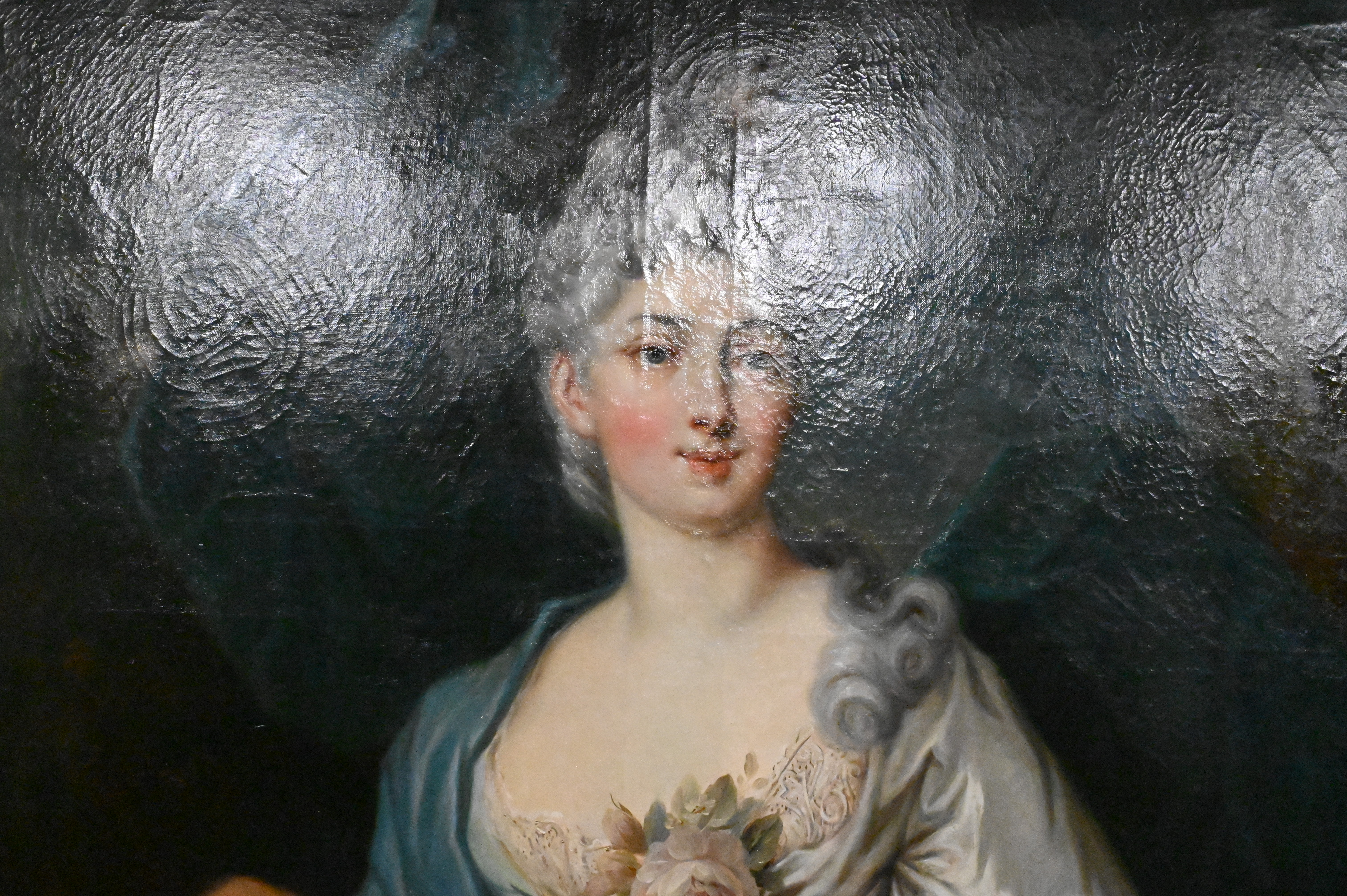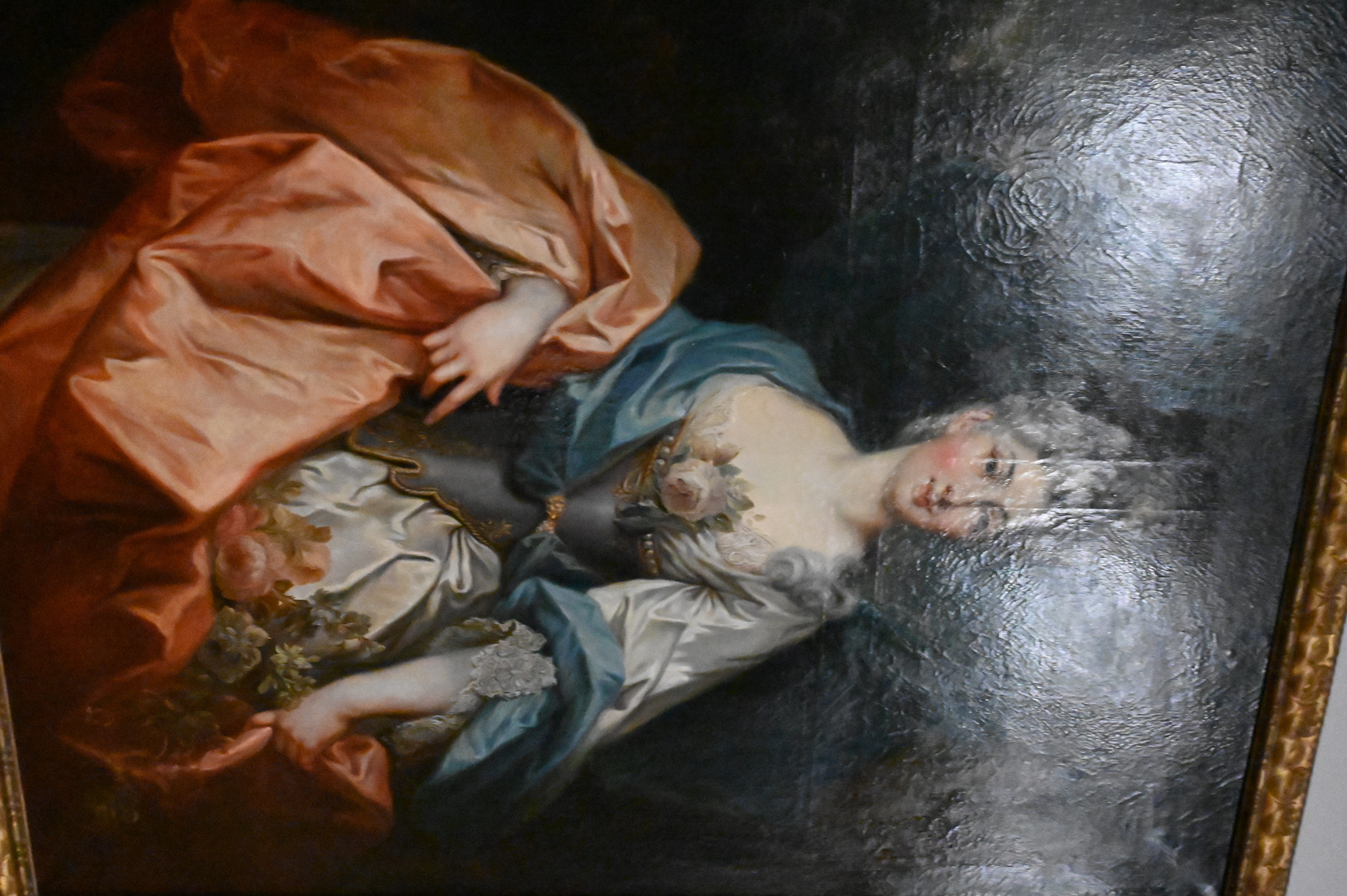Three-quarter-length portrait of a noblewoman seated before a landscape, wearing a silver satin gown with lace cuffs, a blue mantle, and voluminous rose-colored drapery gathered at her waist, a bouquet of flowers rests in her lap, with additional floral adornments at her bodice, the sitter’s powdered hair is styled high in the late 17th–early 18th century manner; painted with rich, smooth modeling characteristic of works after Largillière, whose studio and followers frequently produced courtly portraits of this type