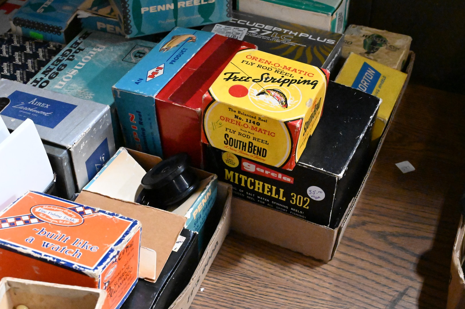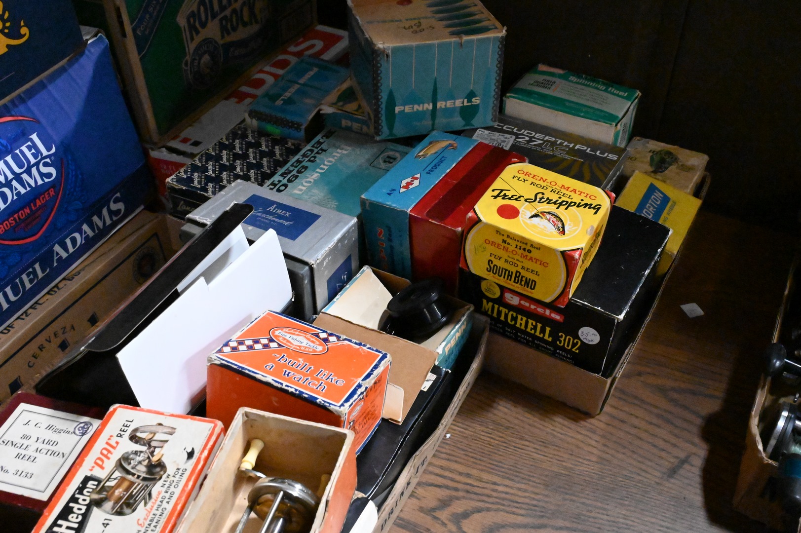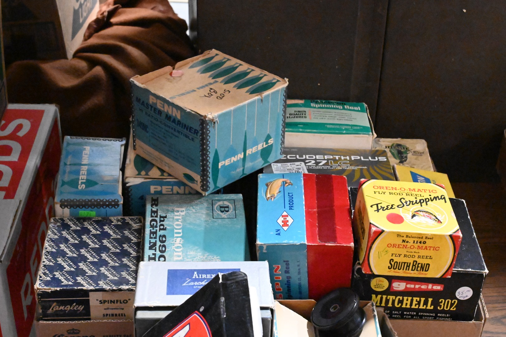 Box Lot of Assorted Fishing Reels, along with original boxes, brands include Penn, Airrex, Heddon and Norton. Provenance: Estate of Peter Tillou, Litchfield, Connecticut.