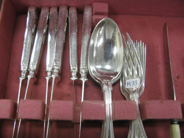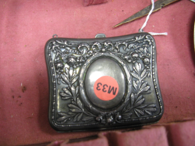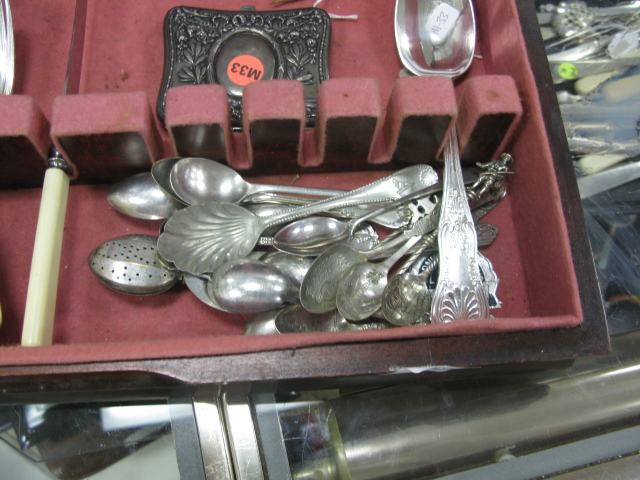 Box lot of mostly silver plate, a sterling silver purse, odd spoons and King pattern spoons, forks and knives.