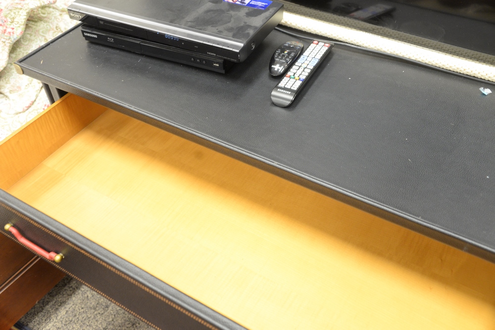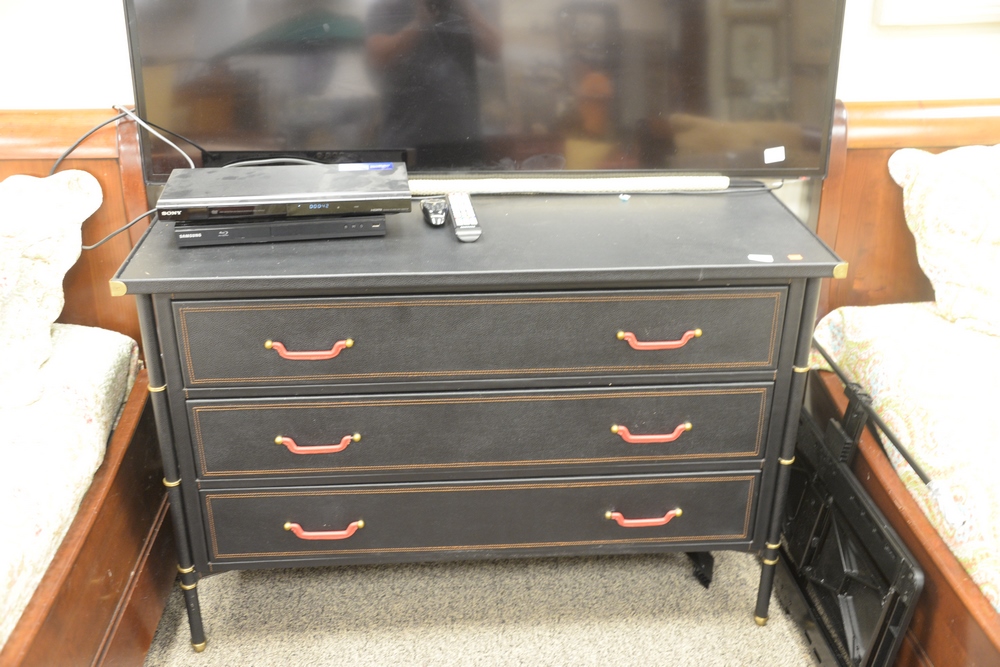 Lot 344: Faux Leather Three Drawer Dresser, having red handle accents and brass hardware, height 32 inches, top 22″ x 47″, Provenance: David…