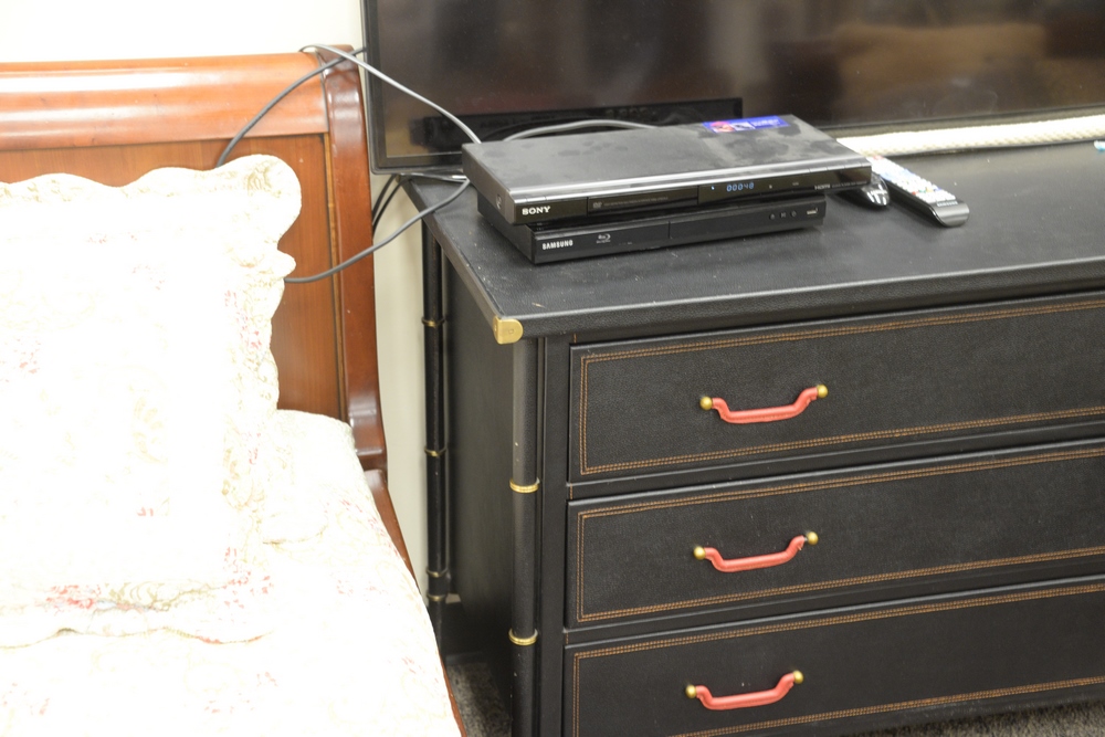 Faux Leather Three Drawer Dresser, having red handle accents and brass hardware, height 32 inches, top 22″ x 47″, Provenance: David and Cynthia Kim, 22 Stoney Wylde Lane, Greenwich, Connecticut. View home by visiting: https://www.zillow.com/homedetails/22-Stoney-Wylde-Ln-Greenwich-CT-06830/177238281_zpid/.