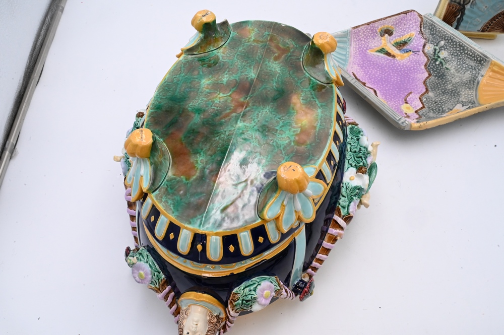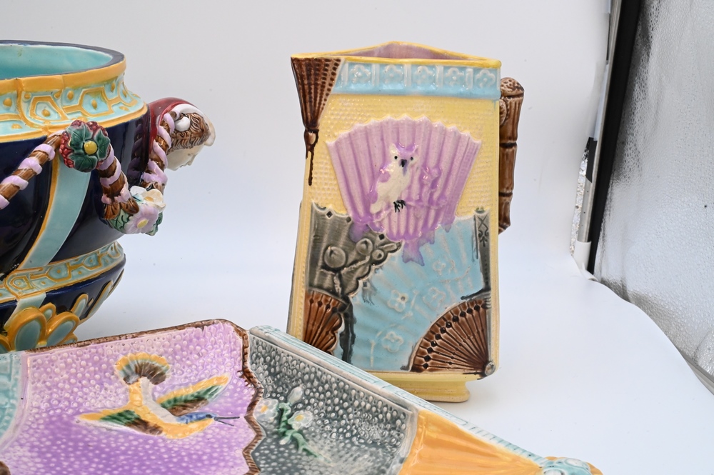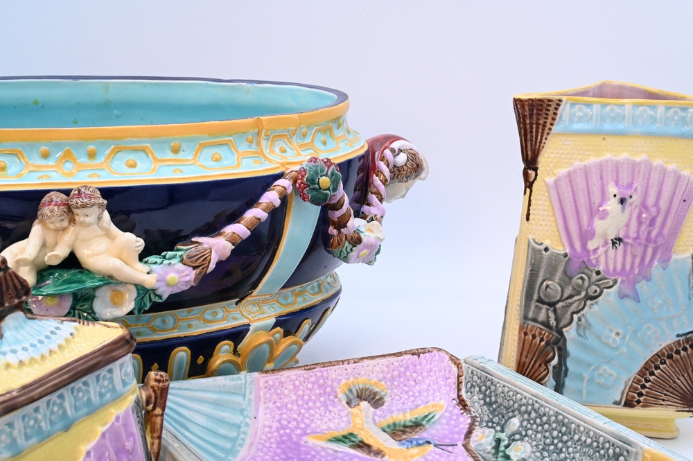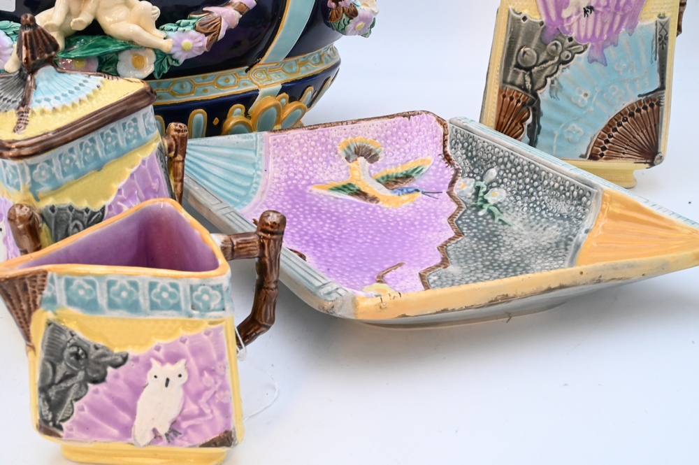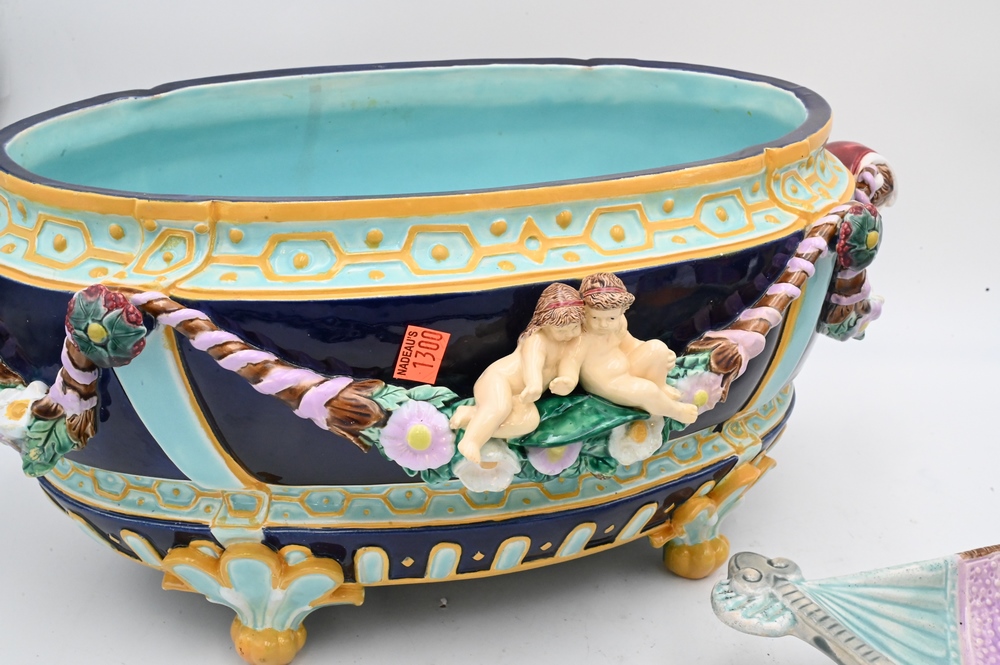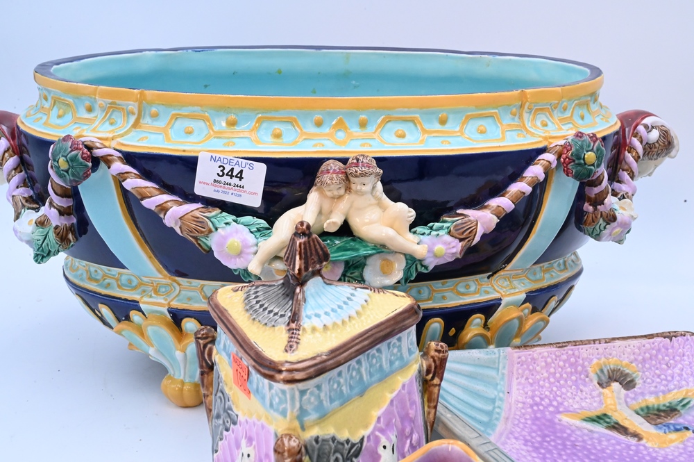Group of Majolica, to include large figural jardiniere having putti on the sides with bust handles, along with a Fant owl tea set, jardiniere 9″ x 14″, height 9 inches.