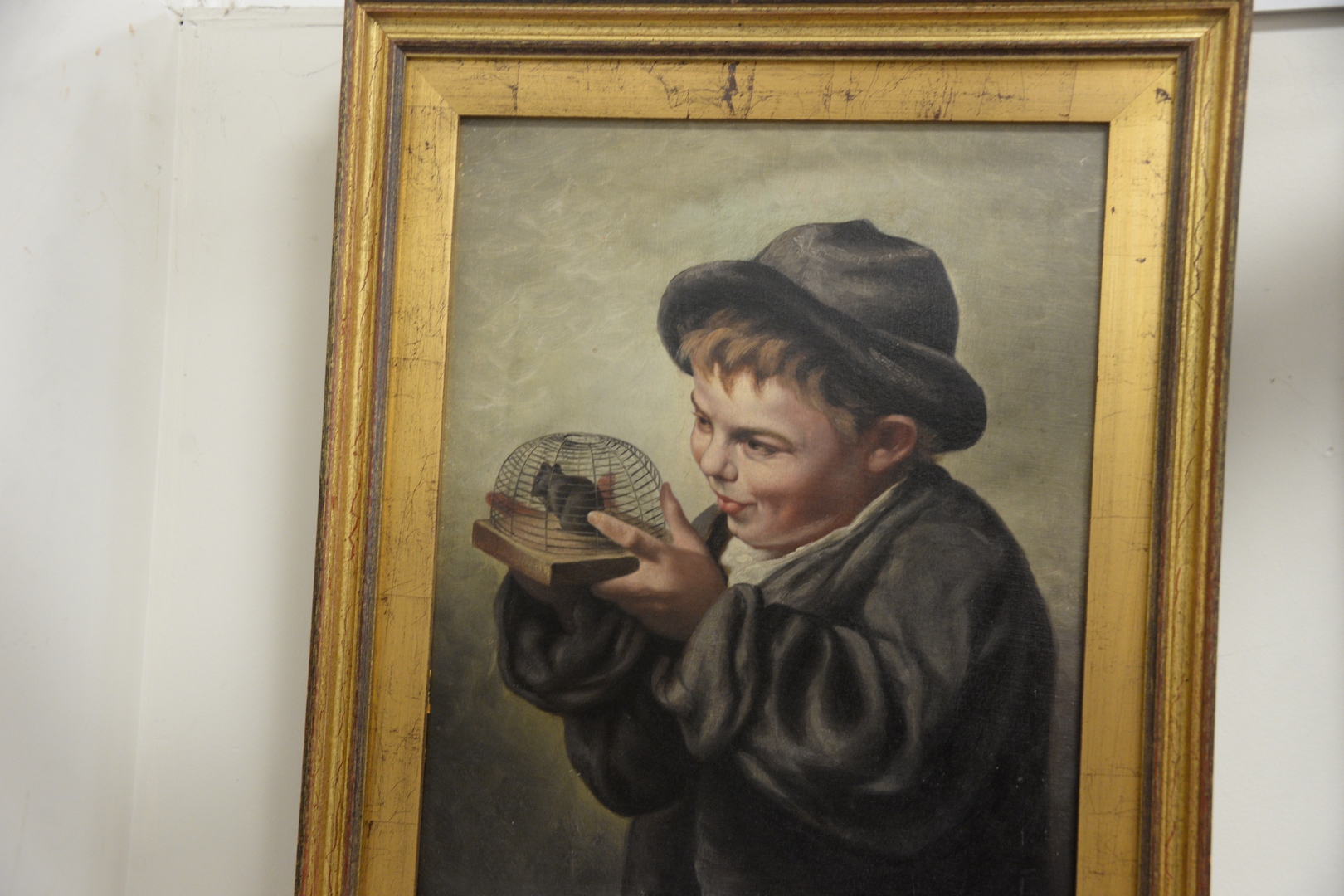 Hugo Possner (American, 1859 – 1933), boy with his pet mouse, oil on canvas, signed lower left “Hugo Possner”, 18 3/4″ x 15″. Provenance: Estate of James Wadhams