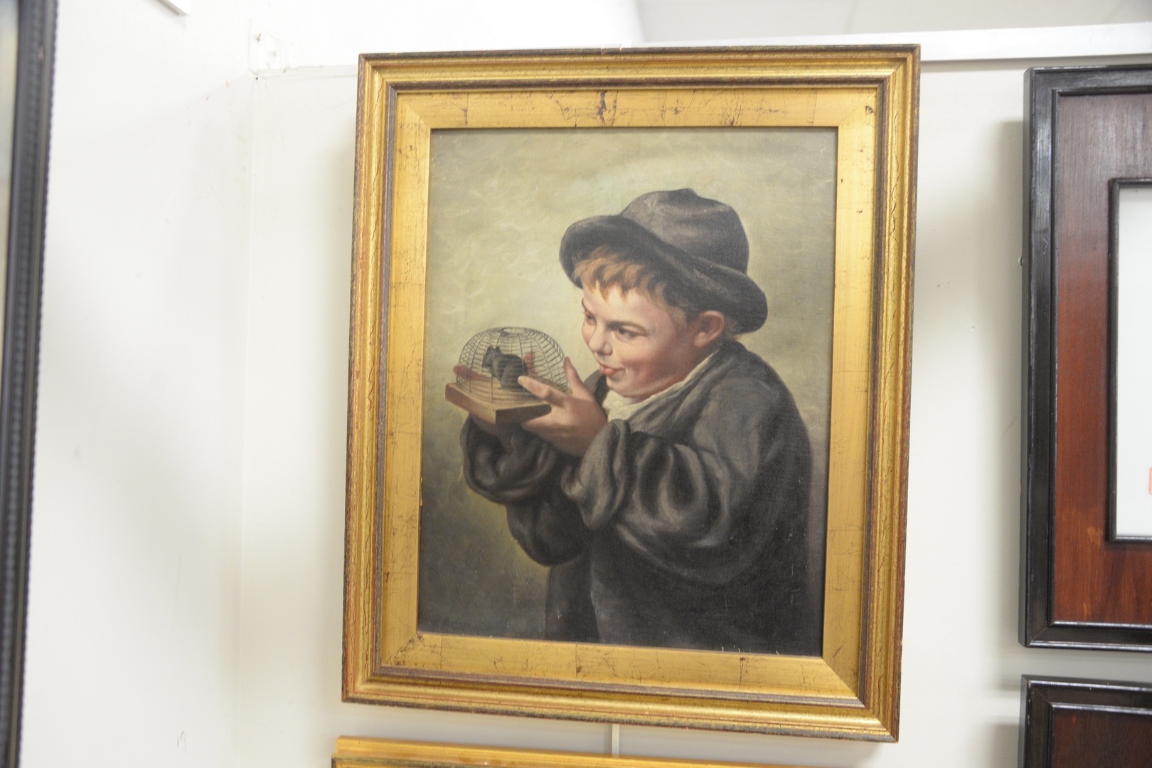 Lot 344: Hugo Possner (American, 1859 – 1933), boy with his pet mouse, oil on canvas, signed lower left “Hugo Possner”, 18 3/4″ x 15″. Provenance: Estate of James Wadhams