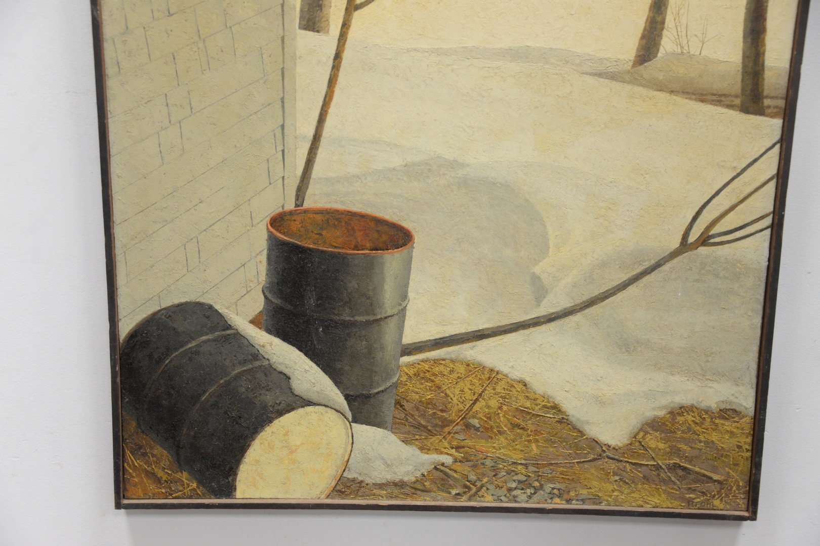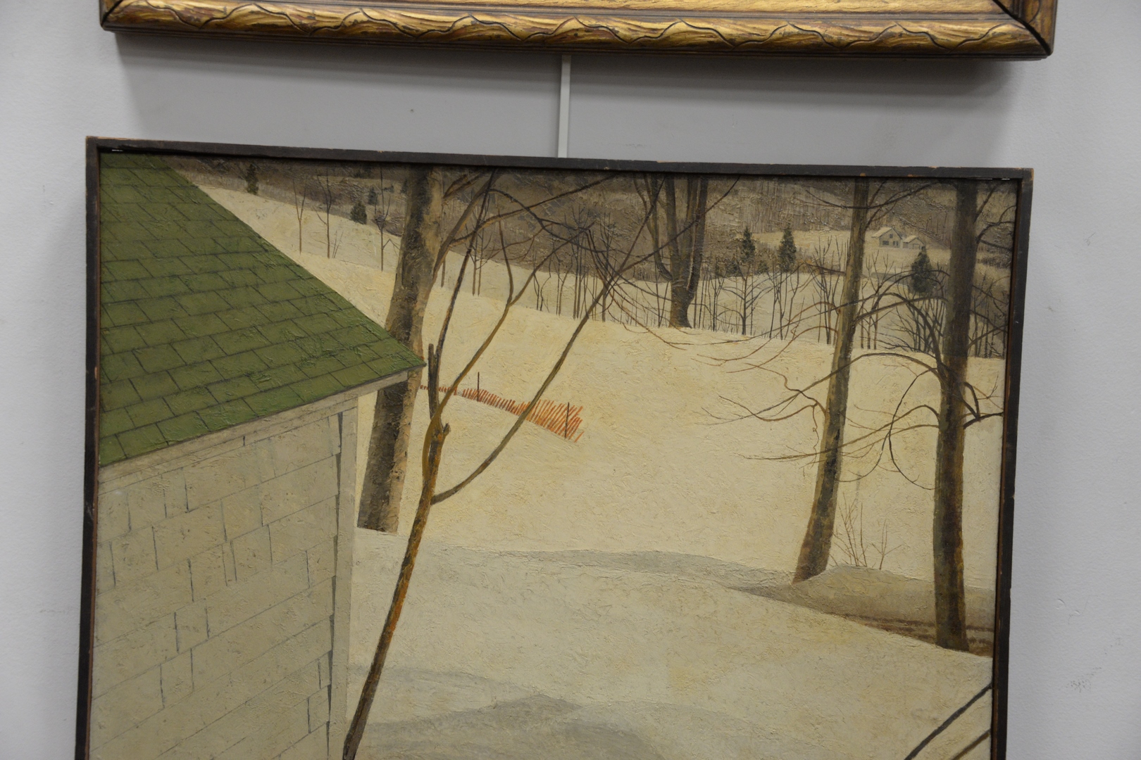 Lot 344: Jerry Pfohl American, 1929 – 2010, March, oil on Masonite, signed lower right Pfohl, signed and titled on the reverse: March/Jerry Pfohl 28 x 24, having a partial Janet Nessler Gallery label adhered to the stretcher bar.