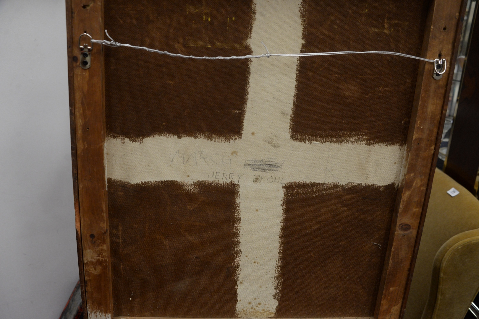 Jerry Pfohl American, 1929 – 2010, March, oil on Masonite, signed lower right Pfohl, signed and titled on the reverse: March/Jerry Pfohl 28 x 24, having a partial Janet Nessler Gallery label adhered to the stretcher bar.