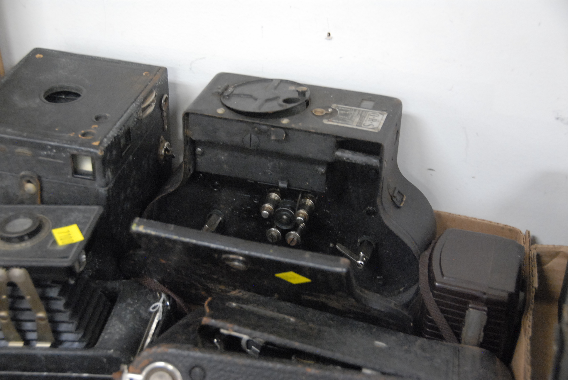 Large group of cameras in two boxes.