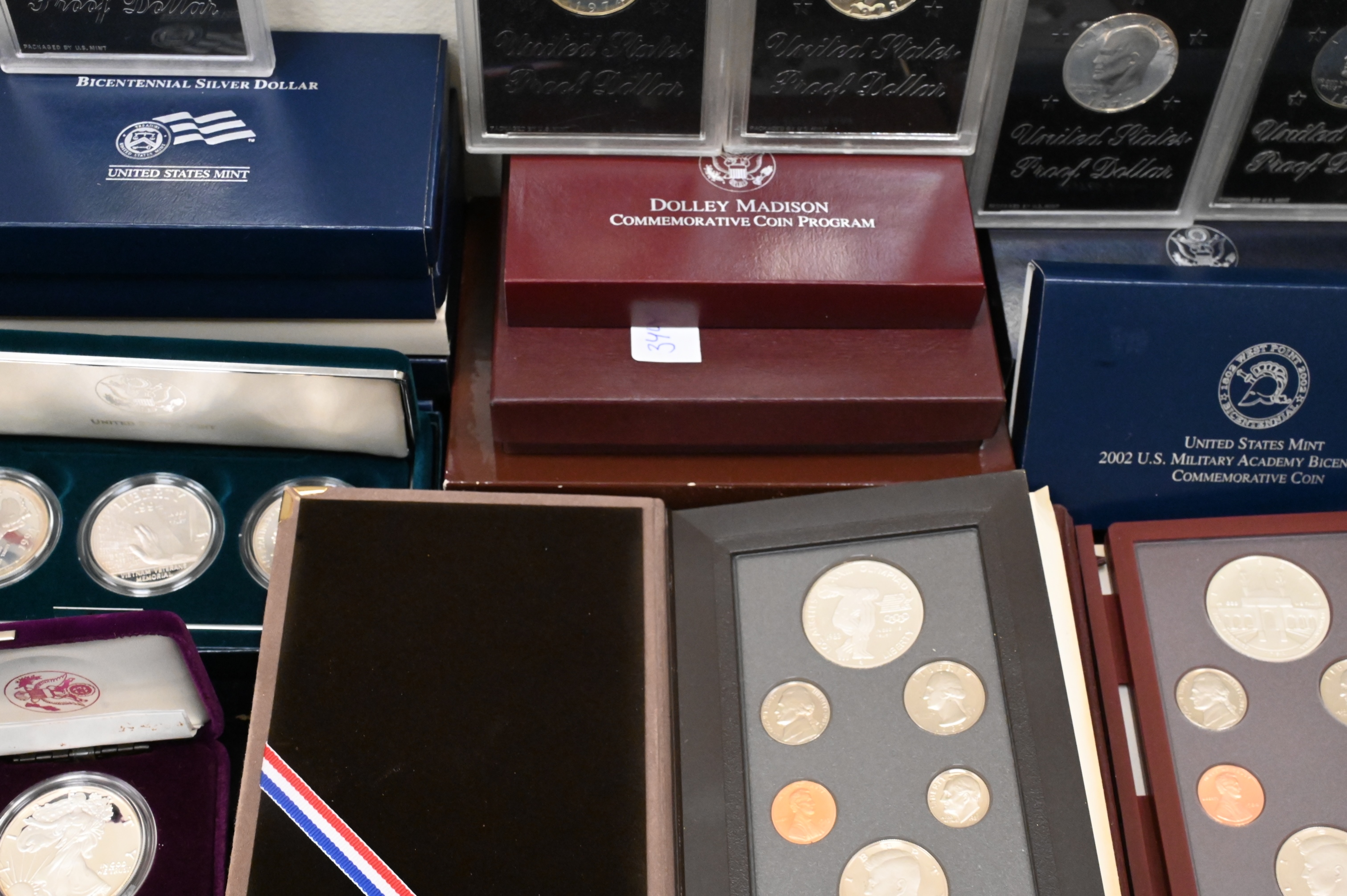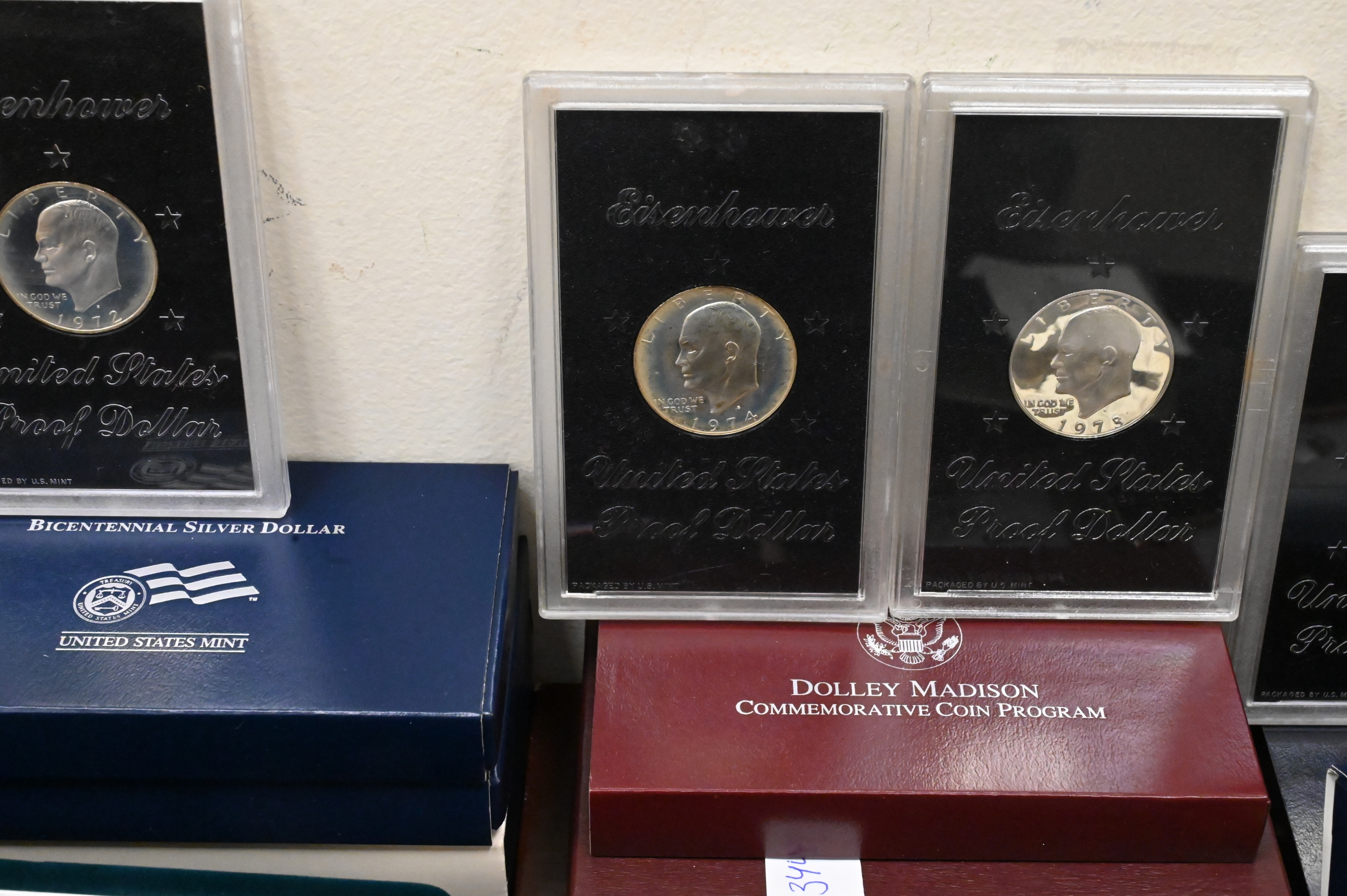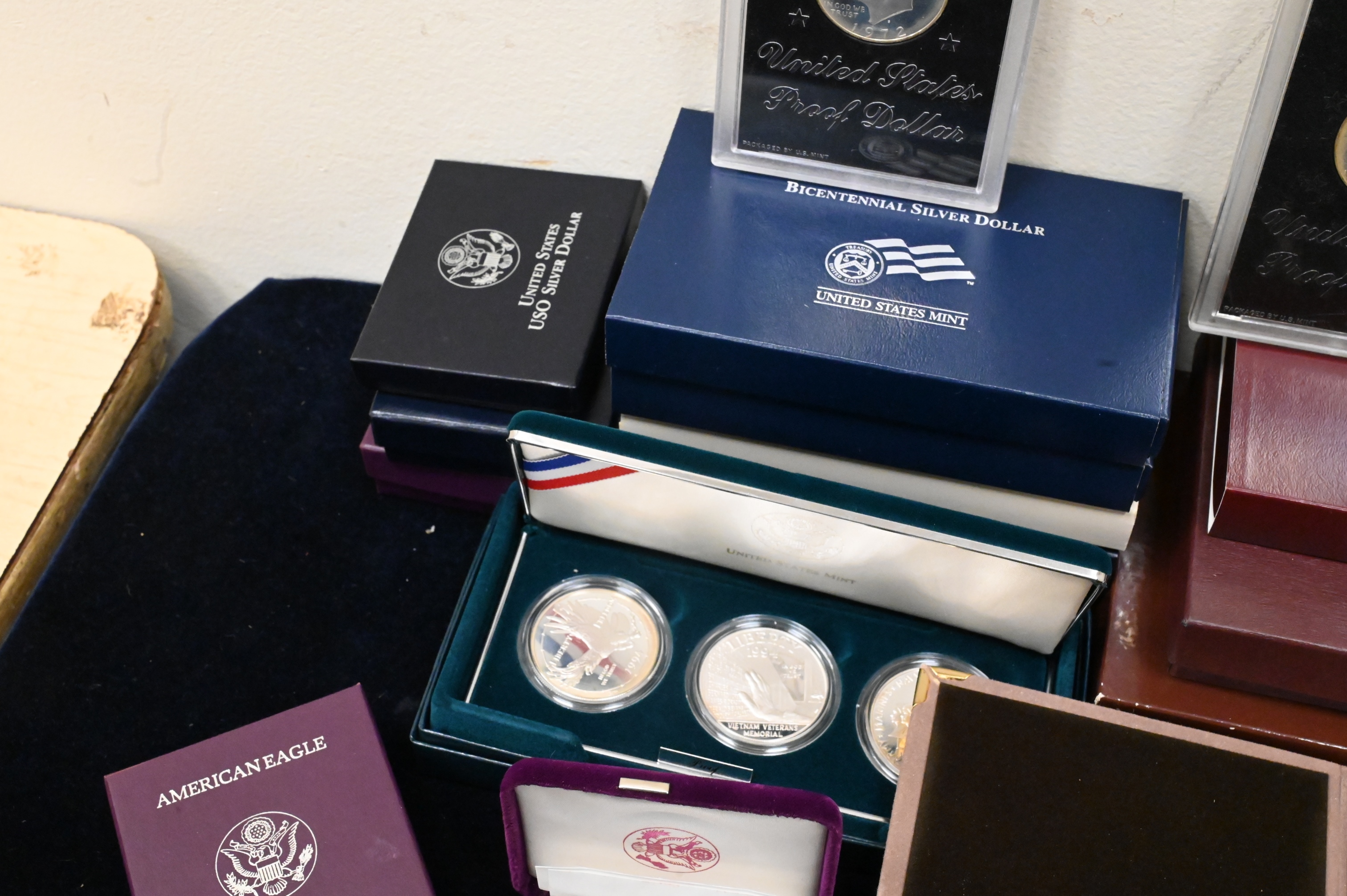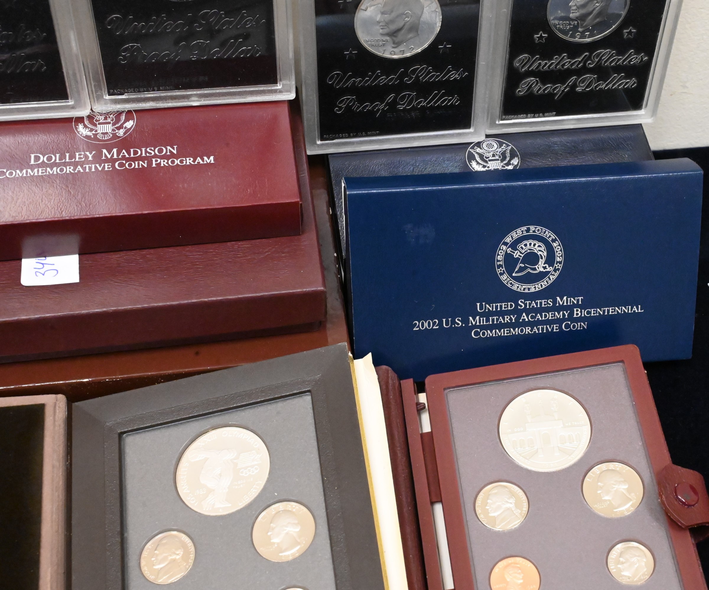 Large Lot of Silver Modern Commemoratives, to include u.s. military, two coins proofs ericson, one lewis and clark, three coin set of u s veterans, two coin set of dolly Madison two 1984 prestige set zone 1983 6 coin Olympic set one Korean $1, one Capital $1, one uso $1 marine $1, one 1993 American Eagle proof, two 1986 american Eagle proofs, one 1995 american Eagle proof, one uso $1 in unc, and seven ike proof dollars.