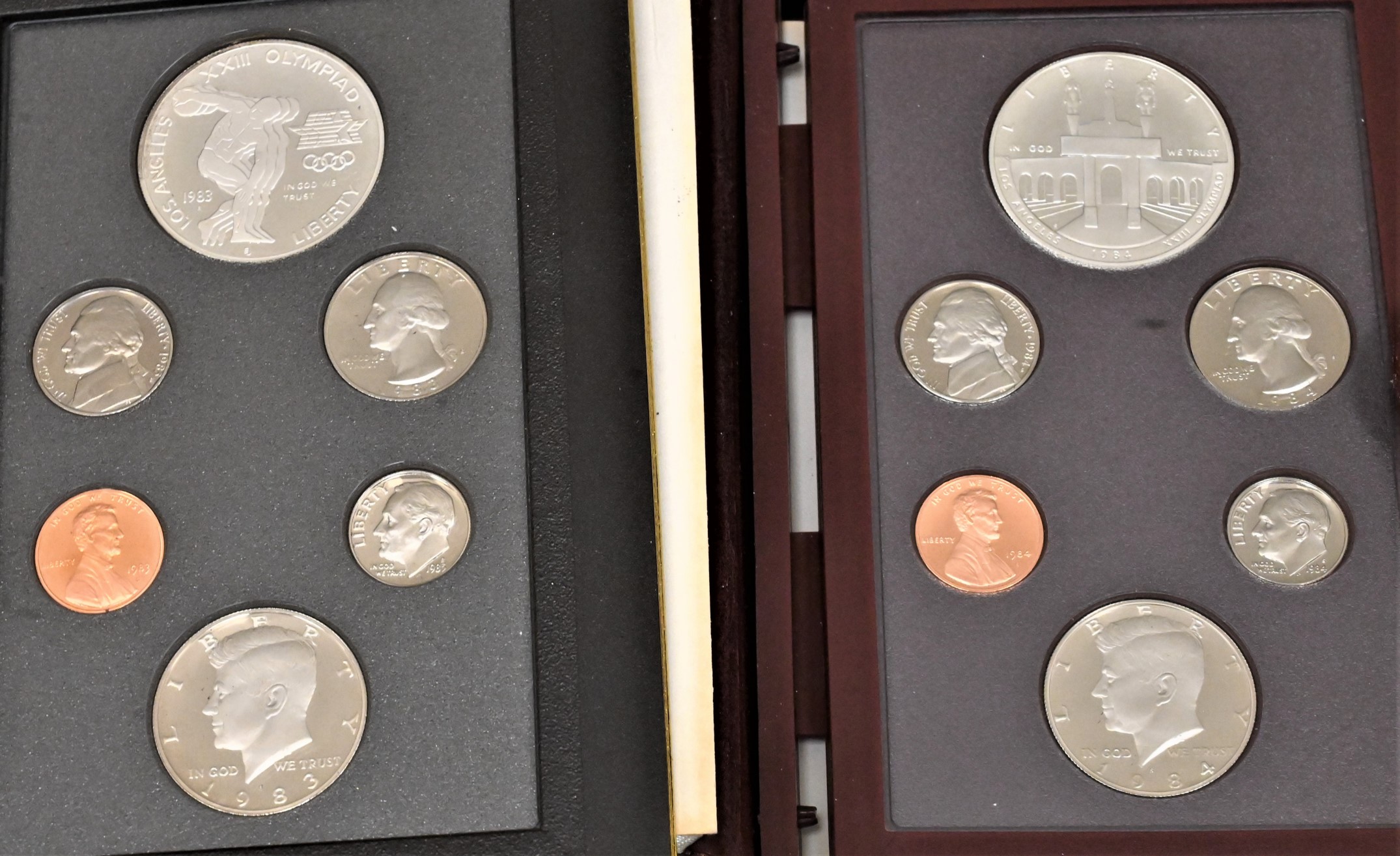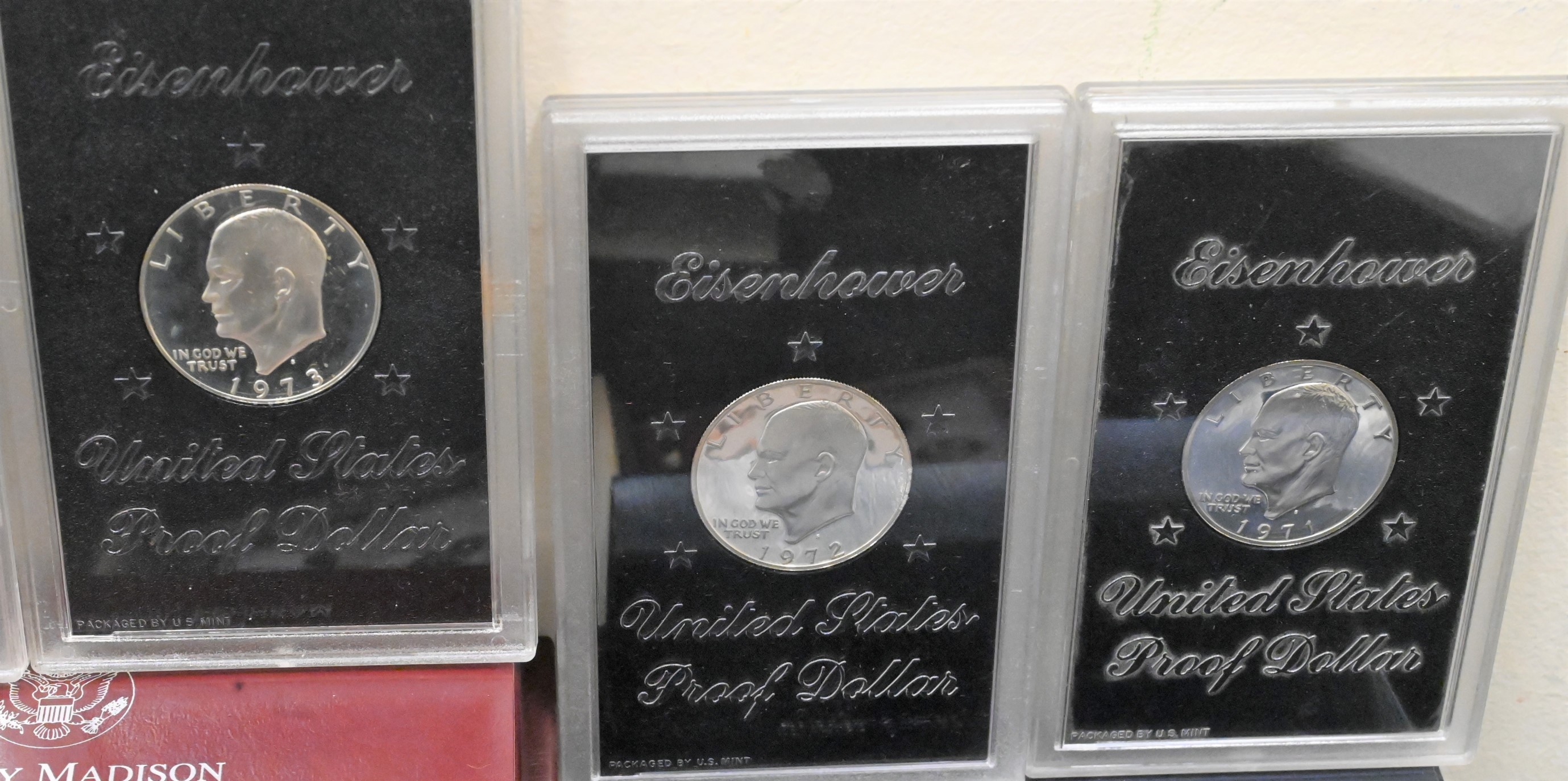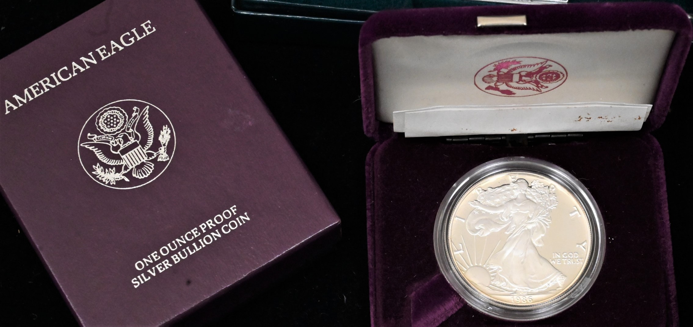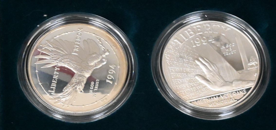 Large Lot of Silver Modern Commemoratives, to include u.s. military, two coins proofs ericson, one lewis and clark, three coin set of u s veterans, two coin set of dolly Madison two 1984 prestige set zone 1983 6 coin Olympic set one Korean $1, one Capital $1, one uso $1 marine $1, one 1993 American Eagle proof, two 1986 american Eagle proofs, one 1995 american Eagle proof, one uso $1 in unc, and seven ike proof dollars.