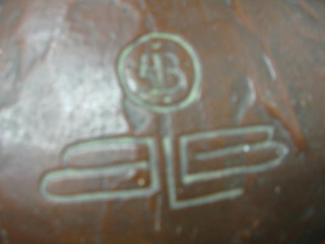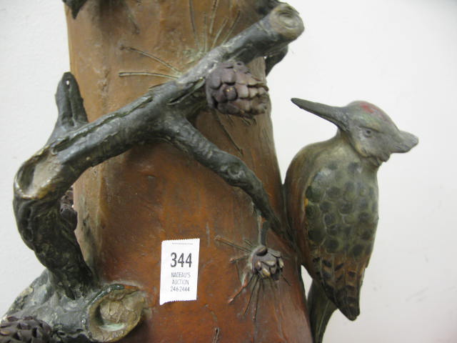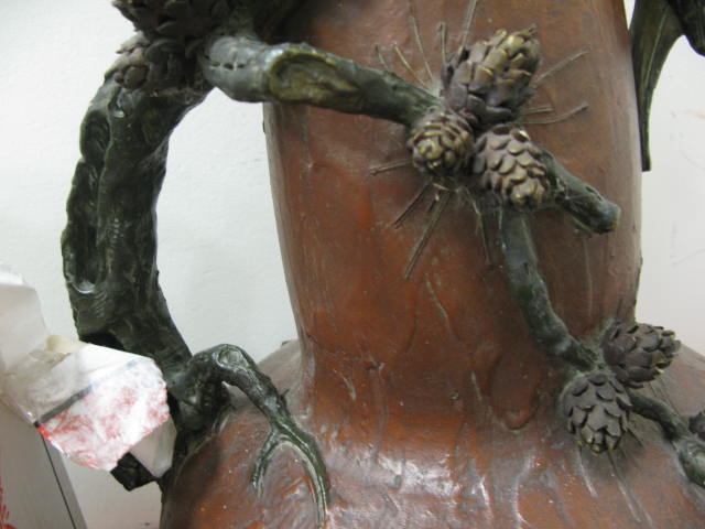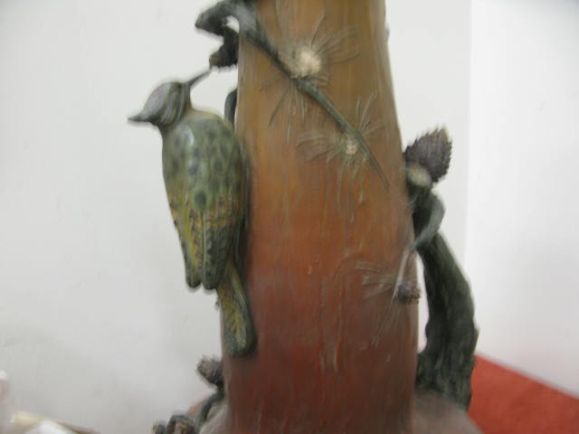 Large pottery vase with branches, pine cones and woodpecker, some pieces missing