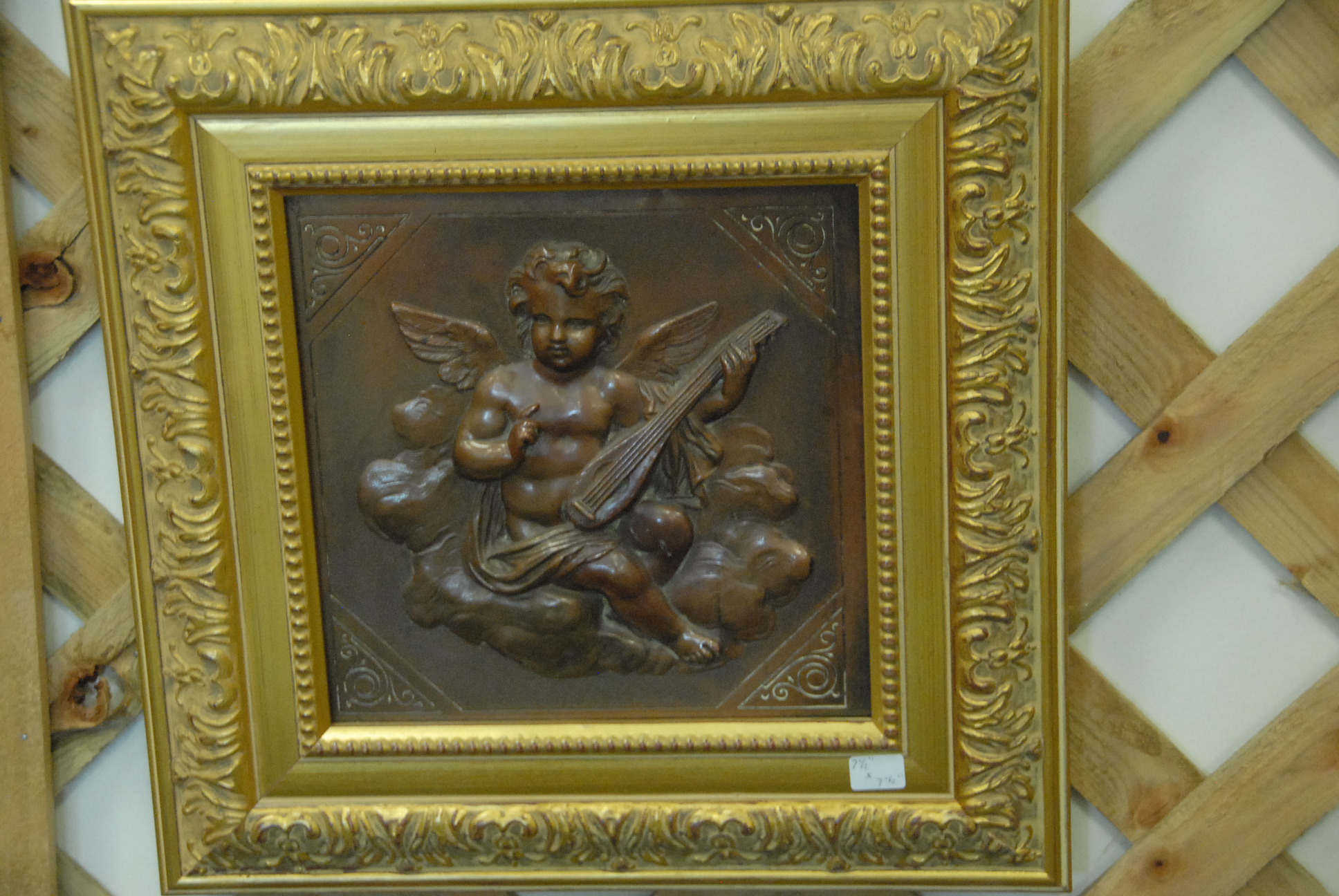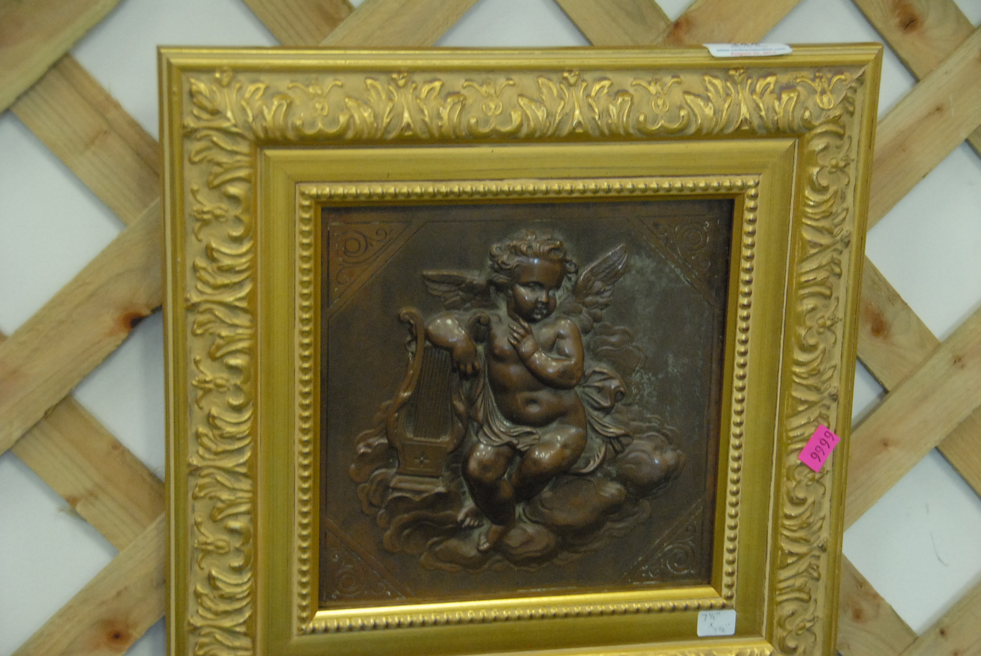 Lot 344: Pair of gold framed copper plaques of cherubs, copper plaque 7 1/2 x 7 1/2.