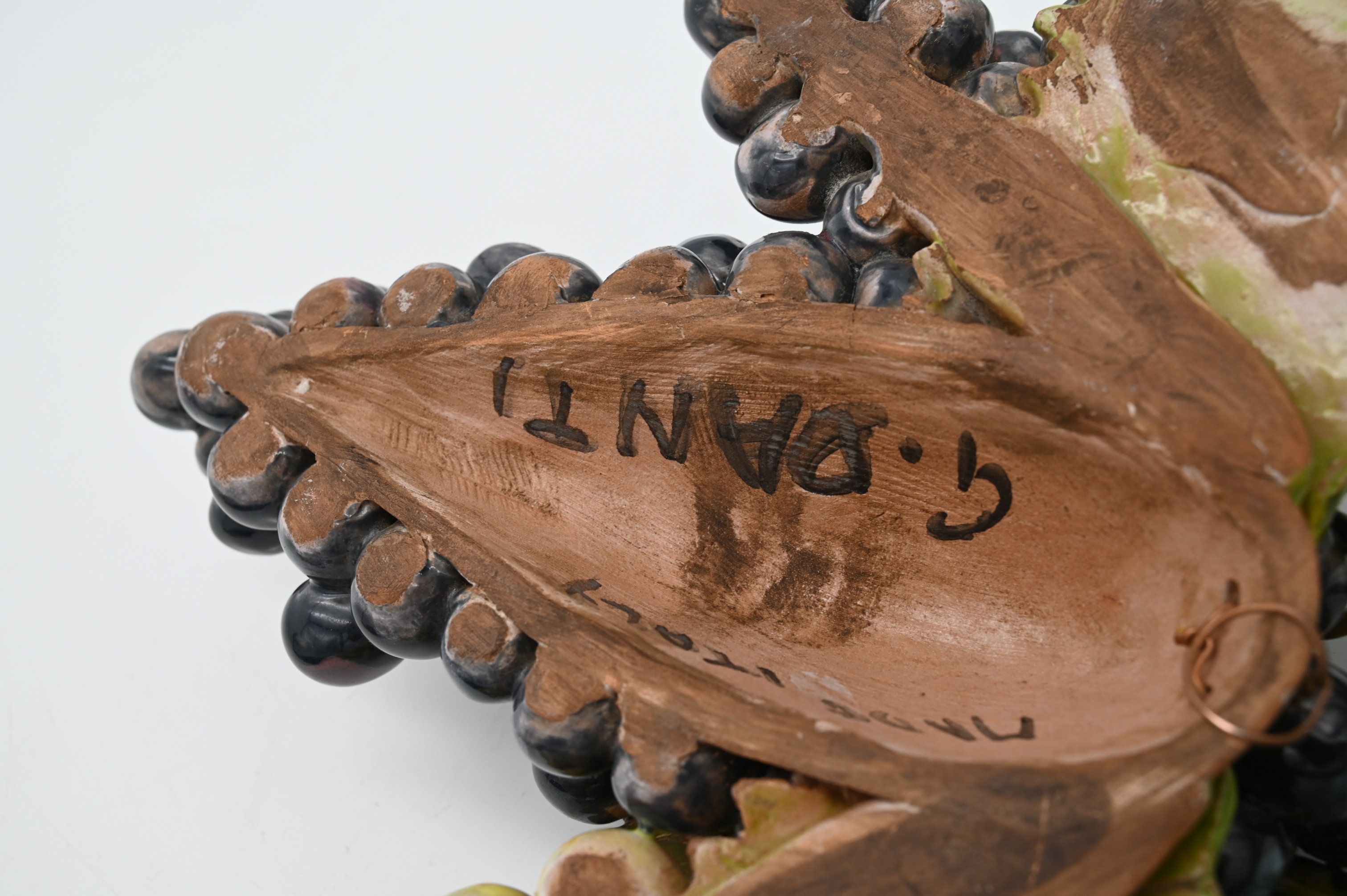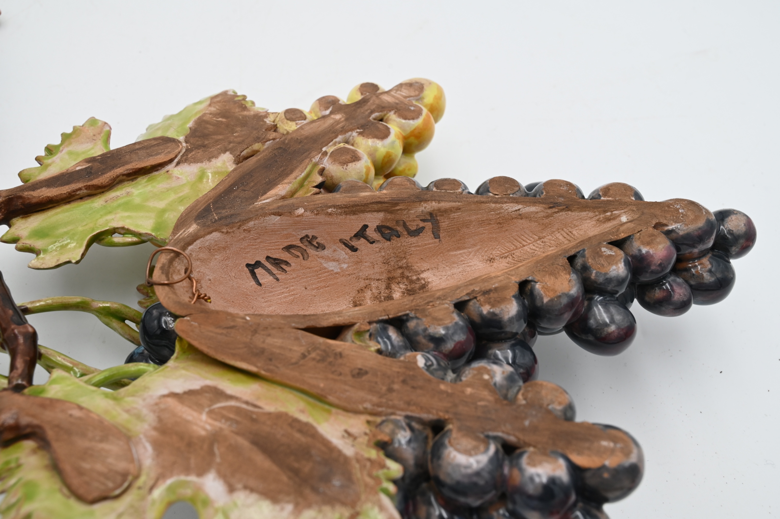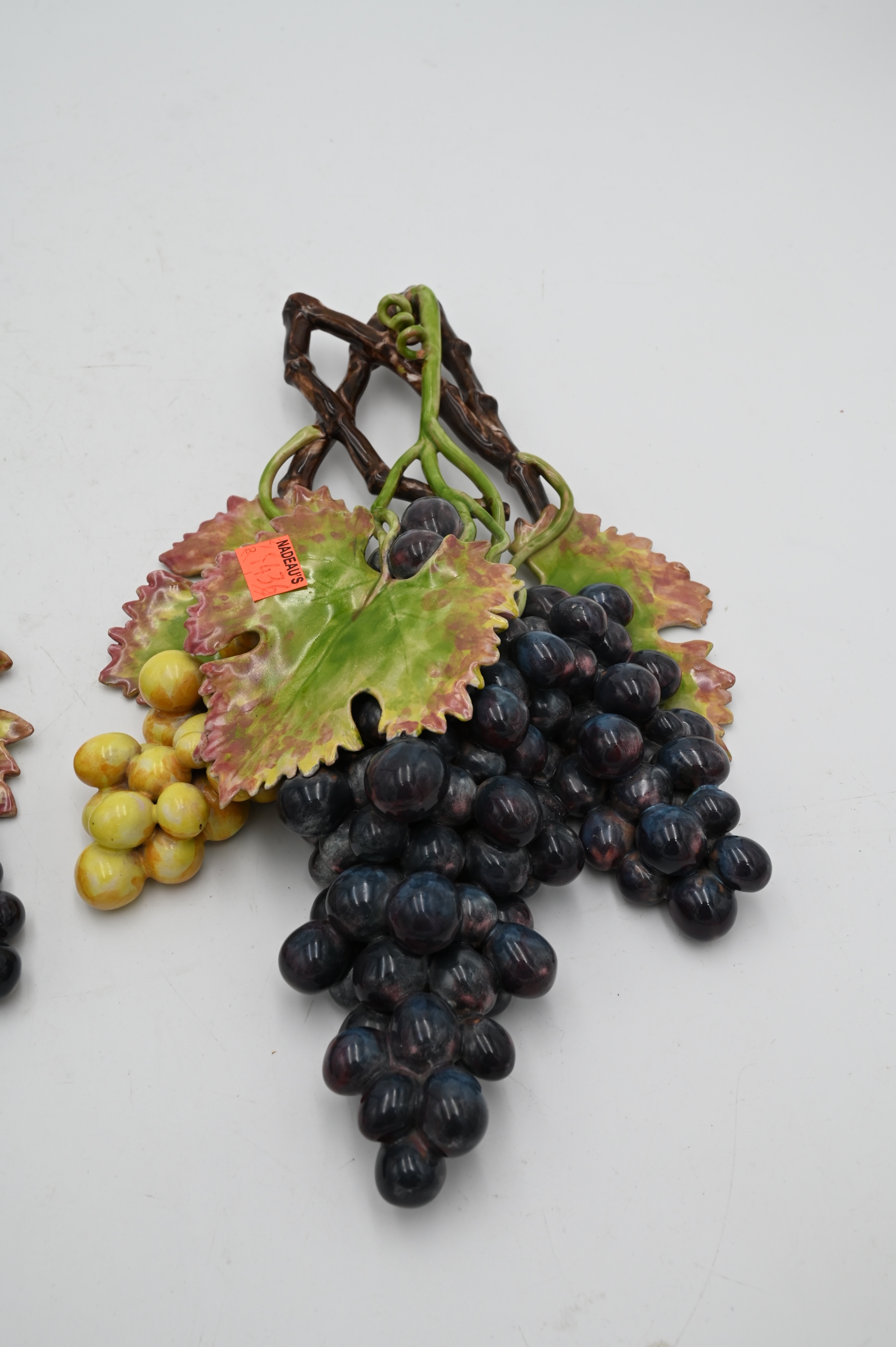 Pair of Italian Majolica Wall Hangings, to include bunches of grapes, along with sterling plate spoons and gravy boat, height 13 inches.