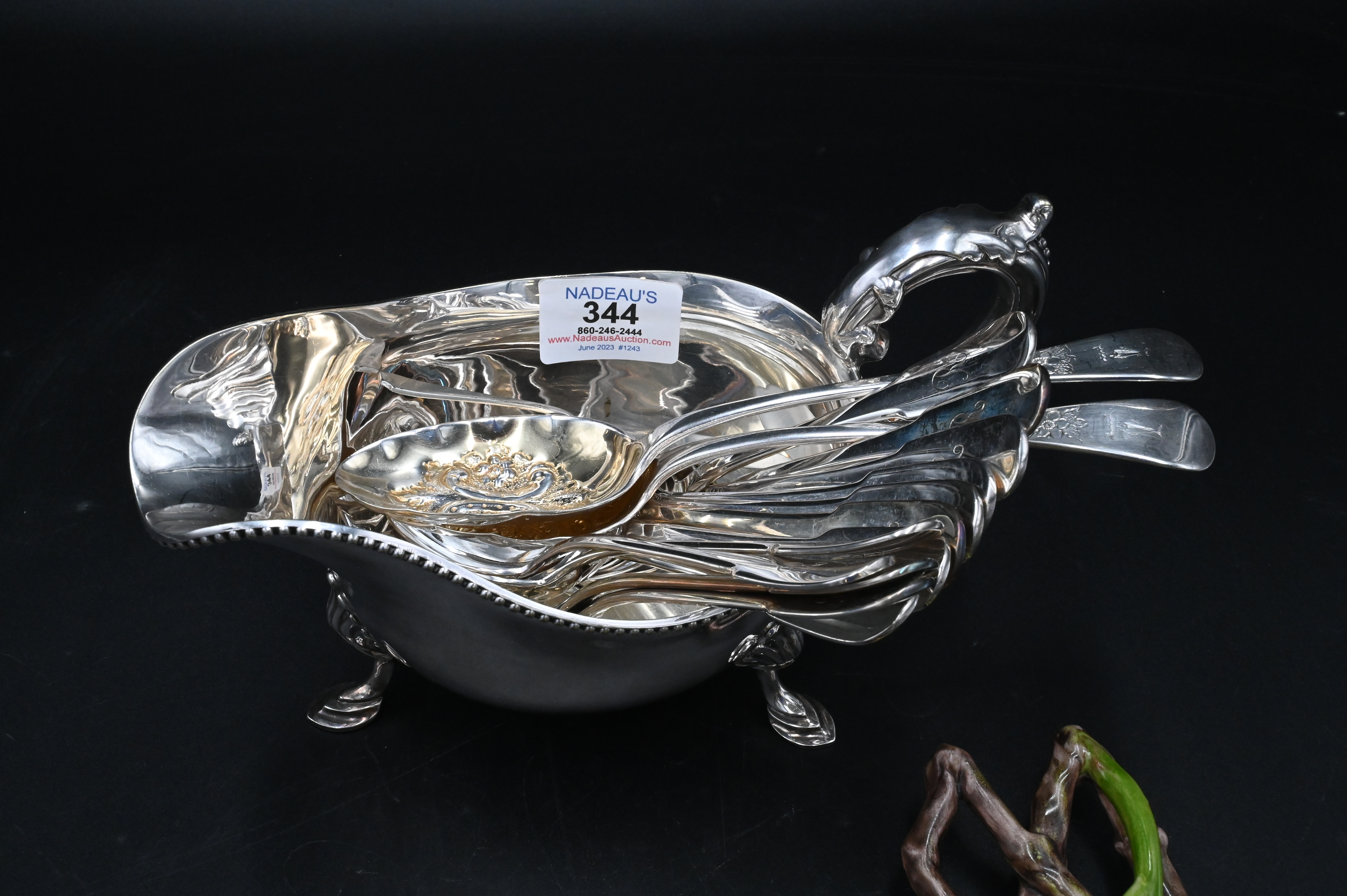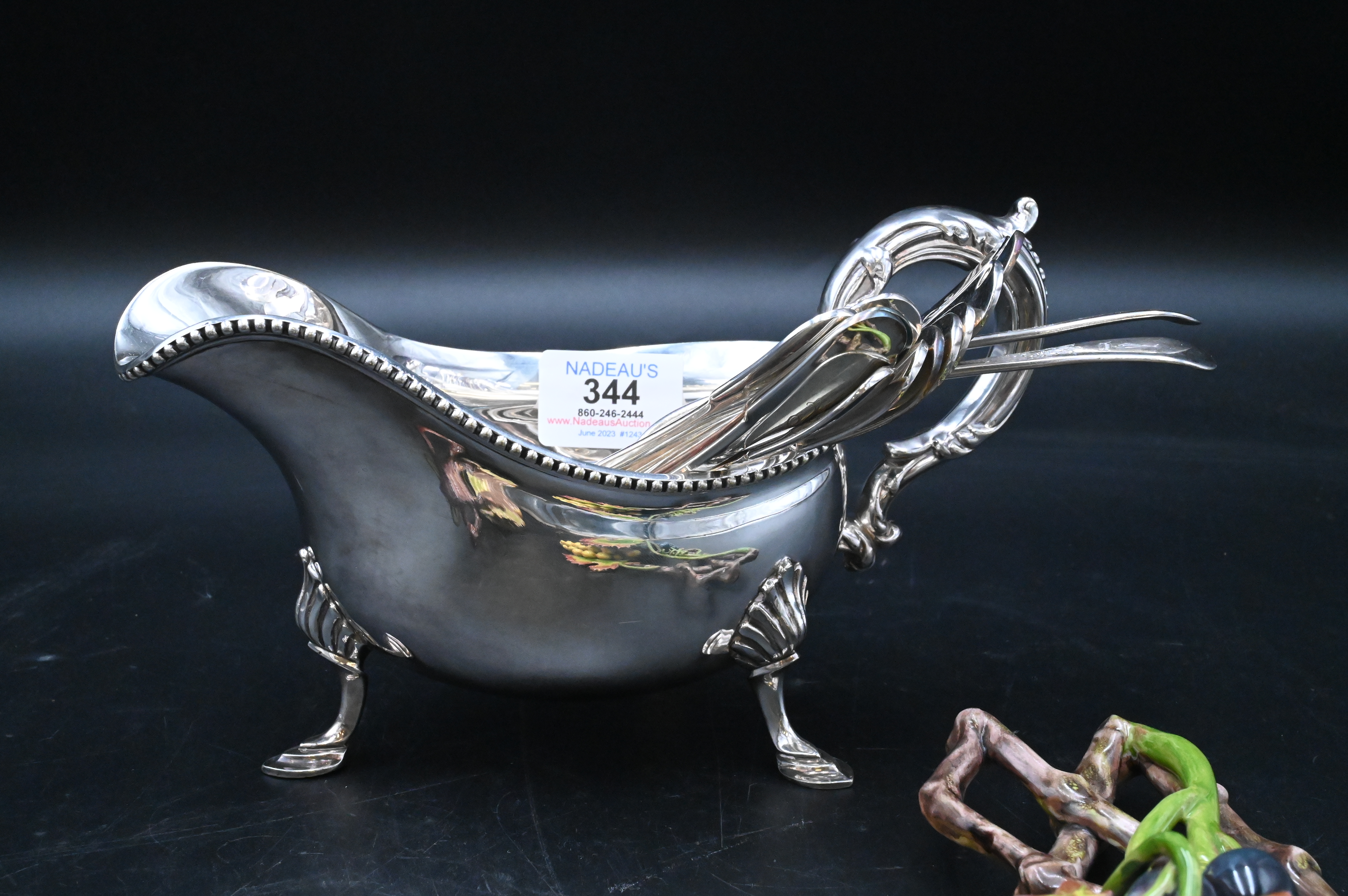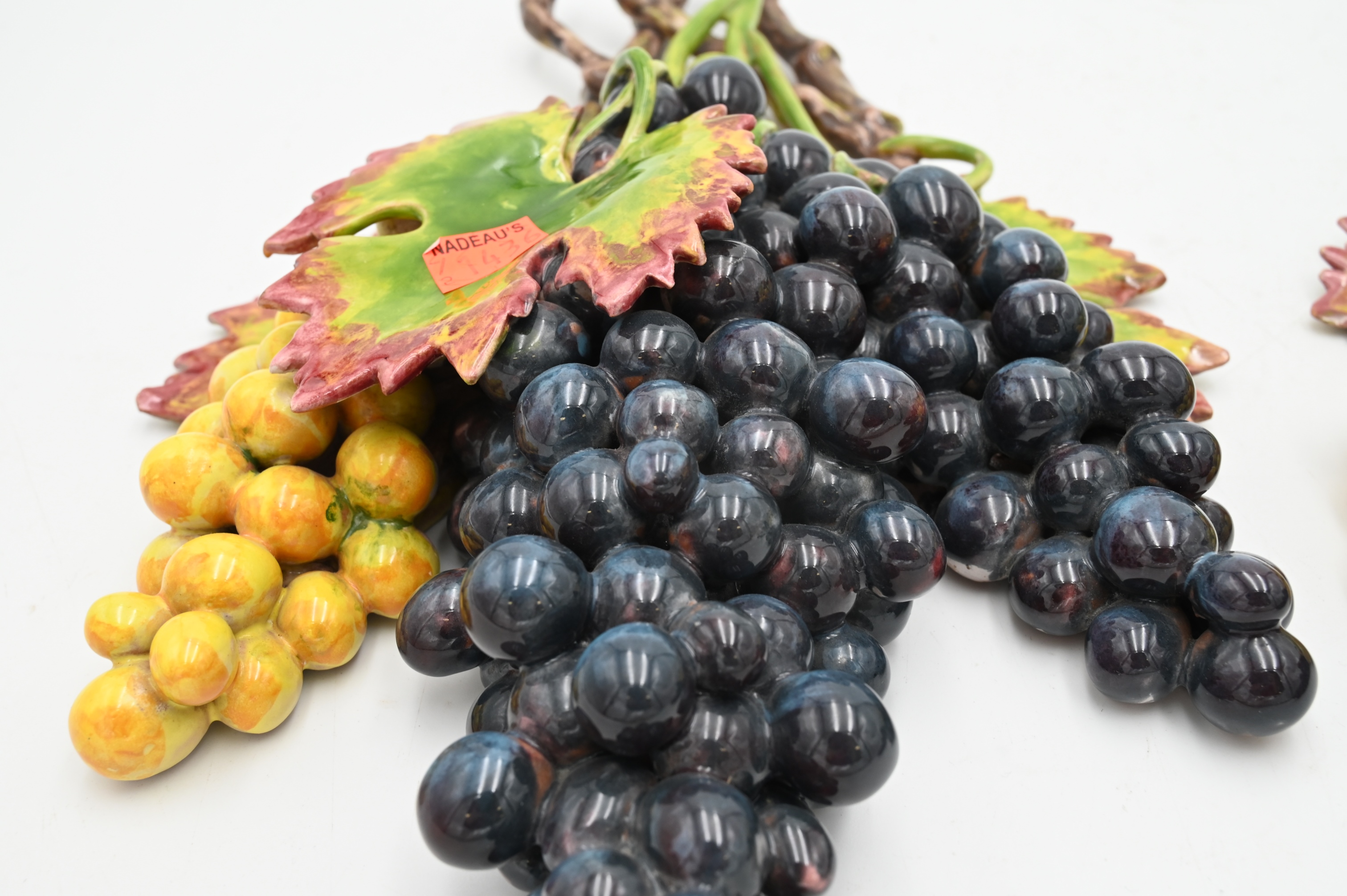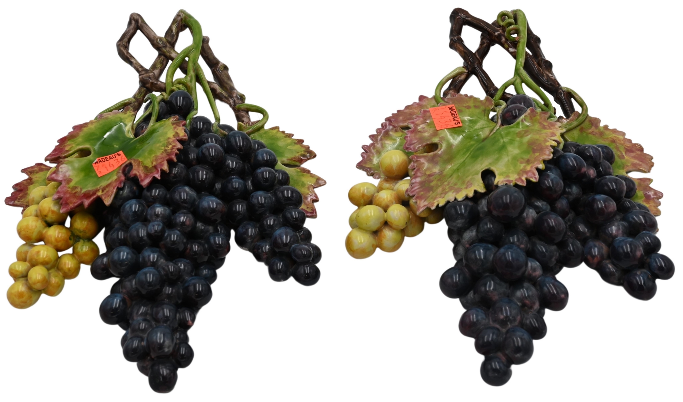 Pair of Italian Majolica Wall Hangings, to include bunches of grapes, along with sterling plate spoons and gravy boat, height 13 inches.