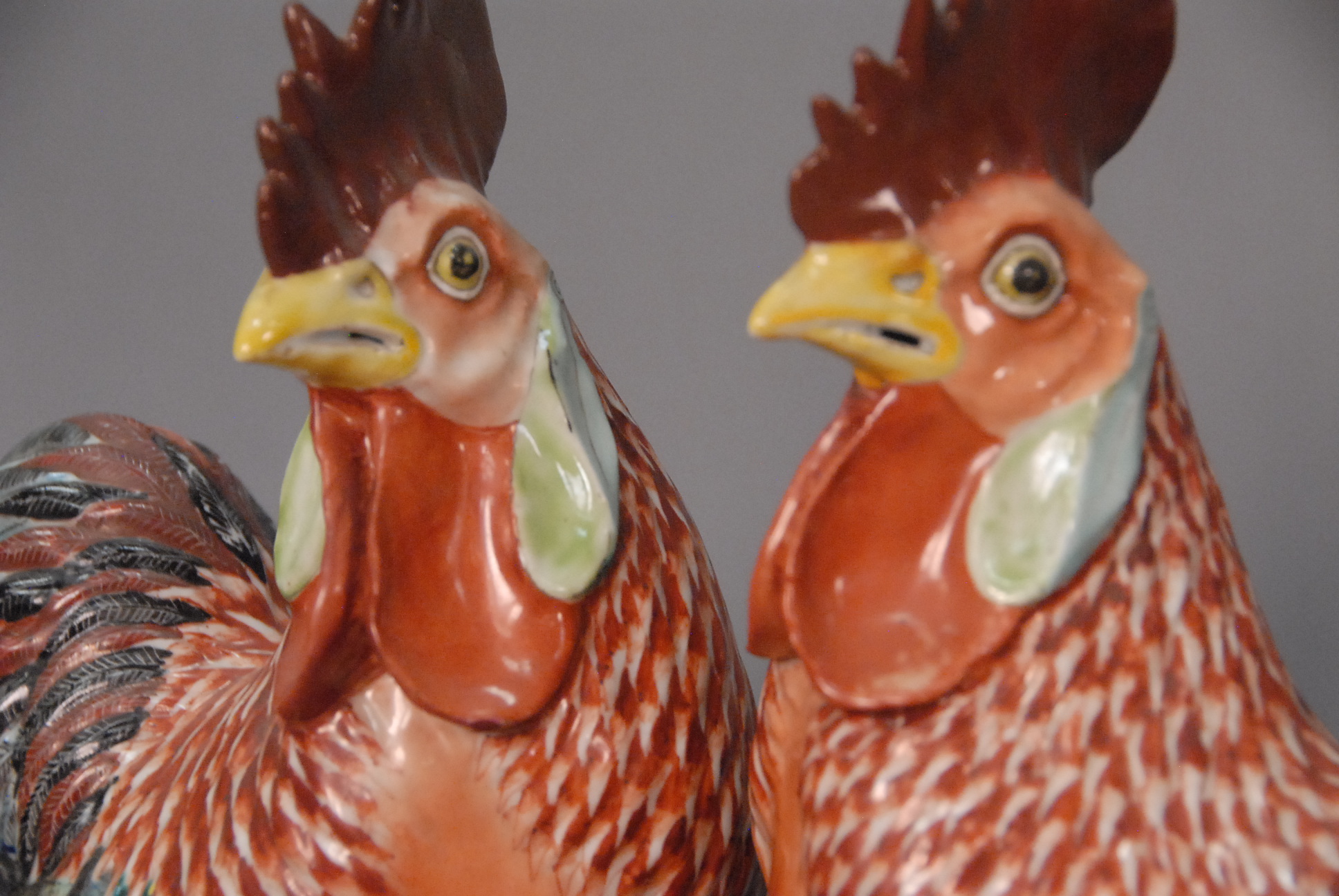 Pair of large porcelain cockerels decorated in famille verte colors, China, 20th century. ht. 14in.