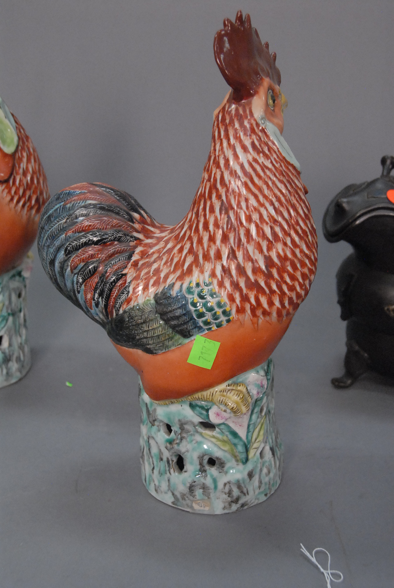 Lot 344: Pair of large porcelain cockerels decorated in famille verte colors, China, 20th century. ht. 14in.