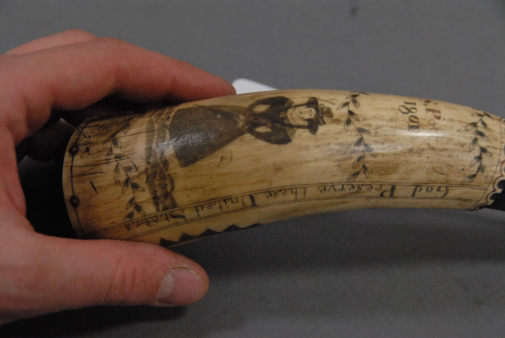 S. Potts 1801 signed powder horn with an eagle and woman in a bonnet.