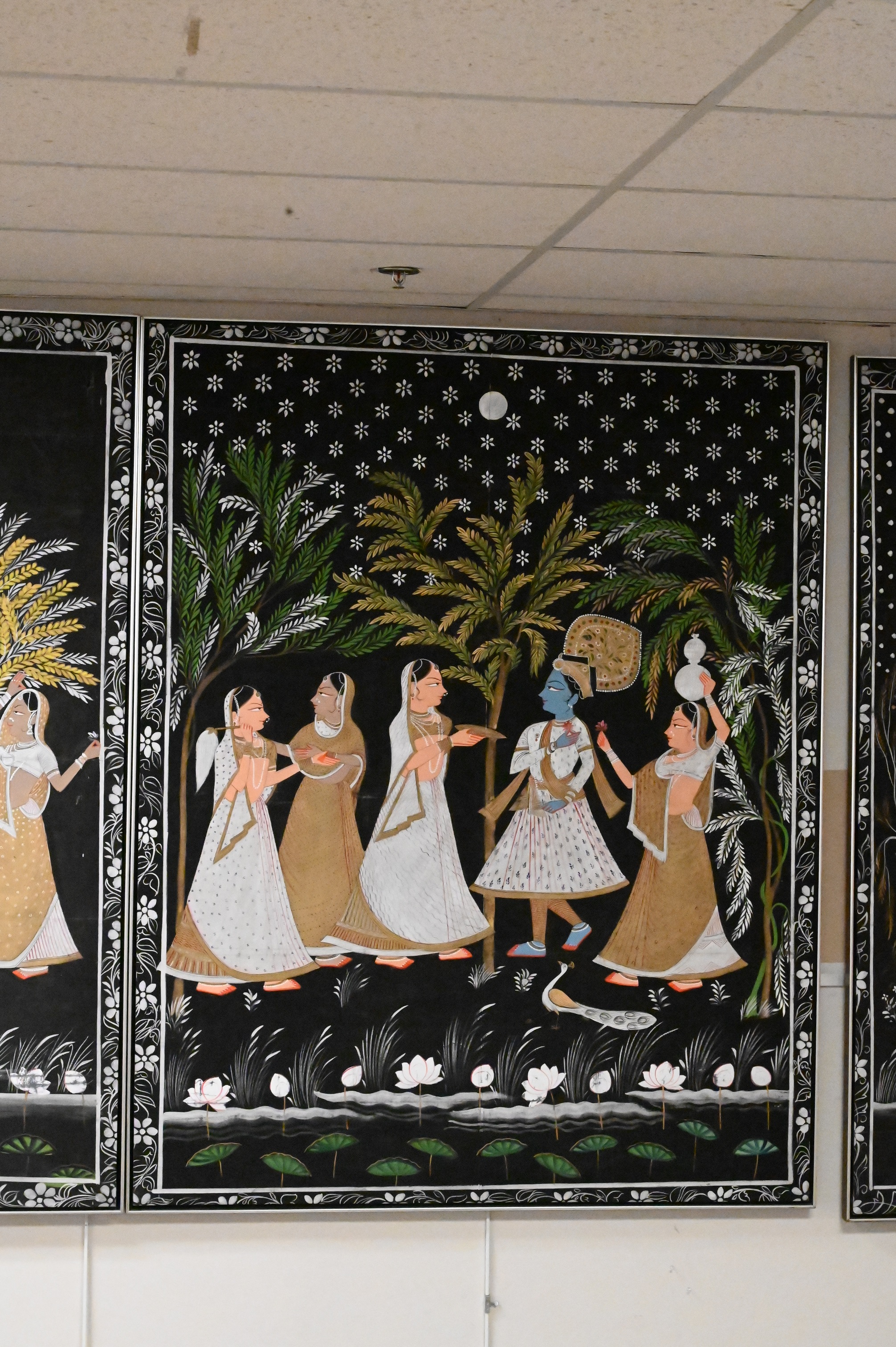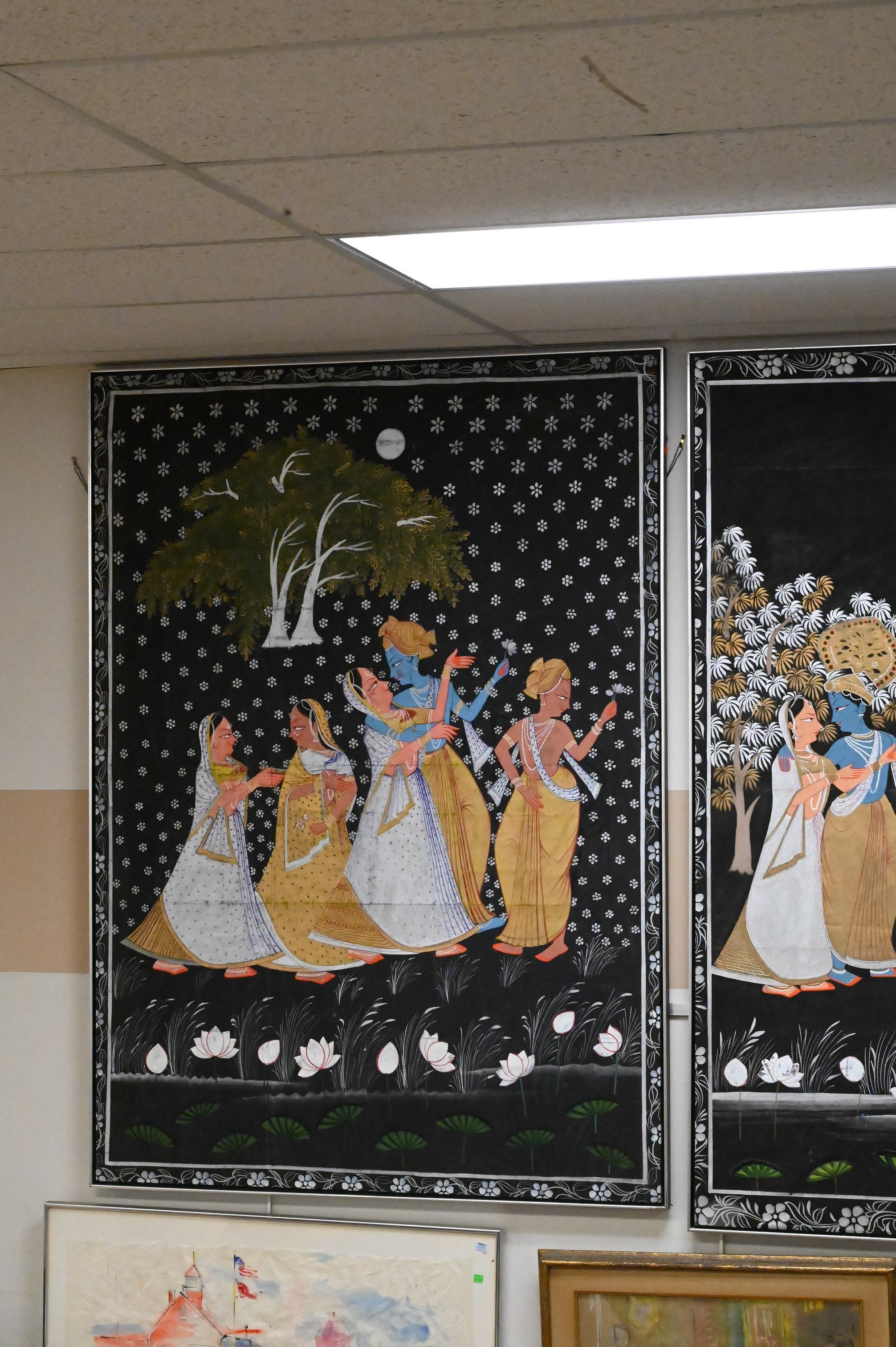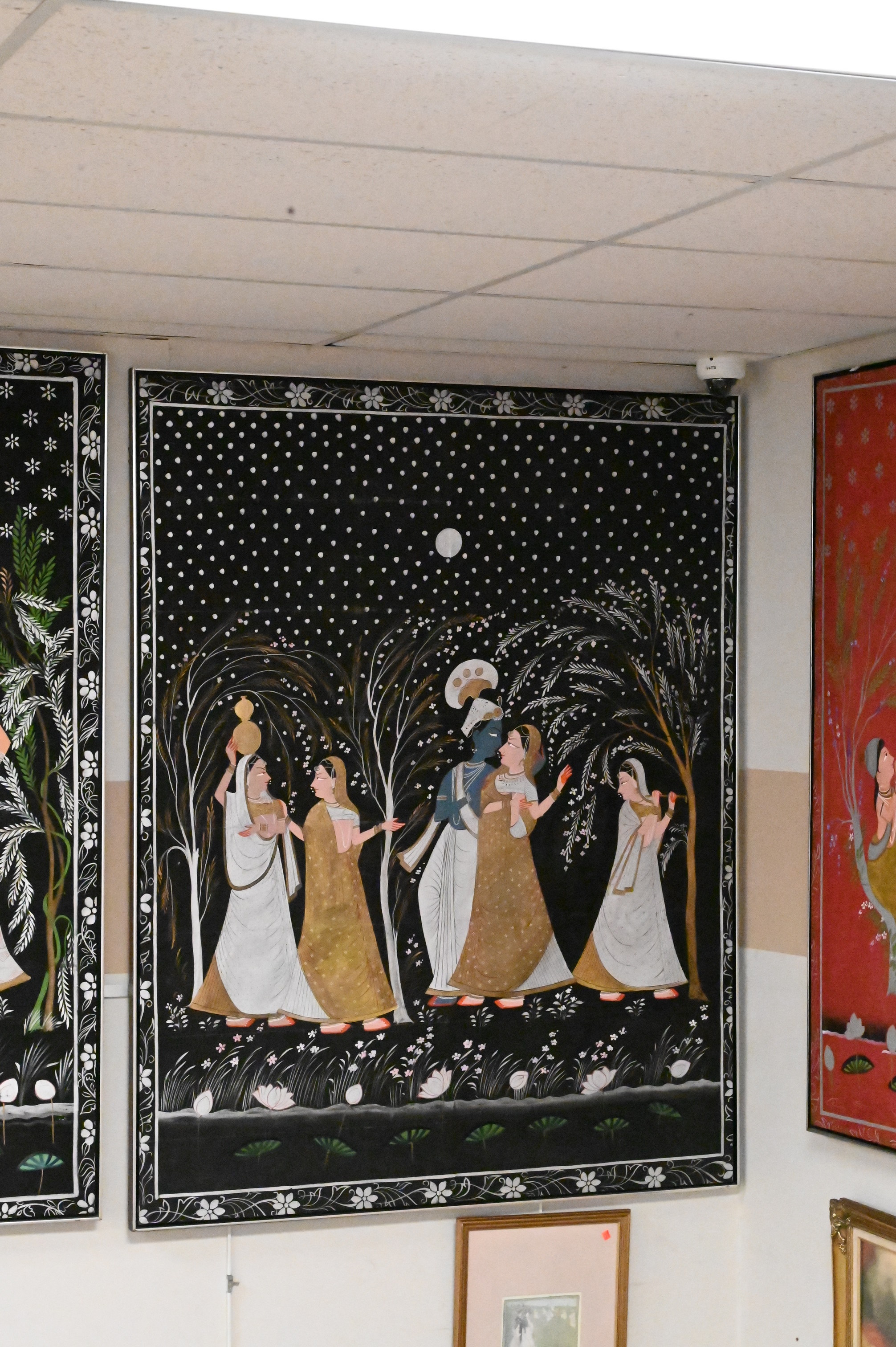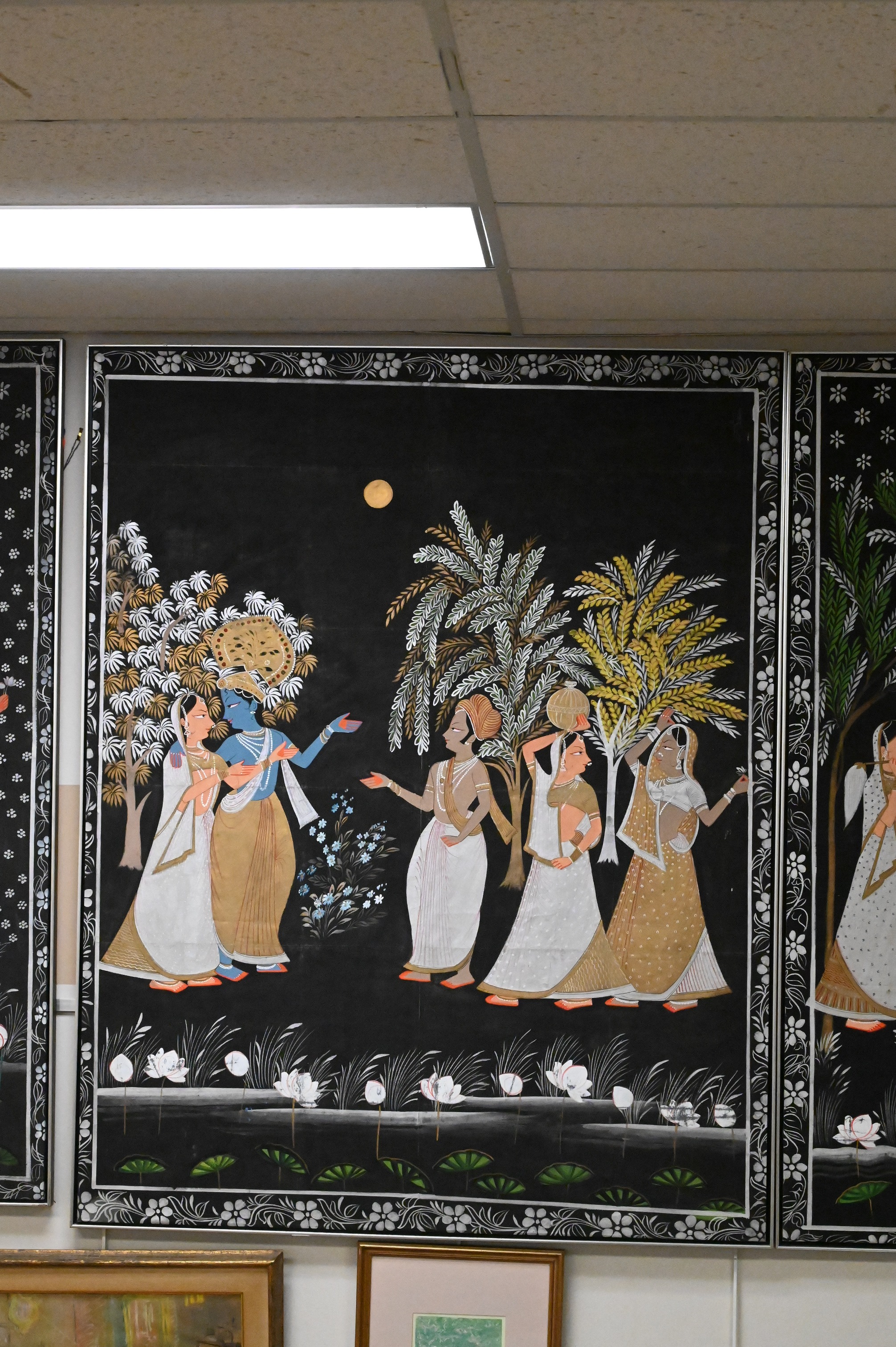 Set of Four Indian Scenes, acrylic on canvas, unknown artist, having black ground with figures and trees, canvas put together in pieces, three are 75″ x 54″, one is 70″ x 50″. Provenance: Property from a private New York collection sold to benefit charitable foundations.