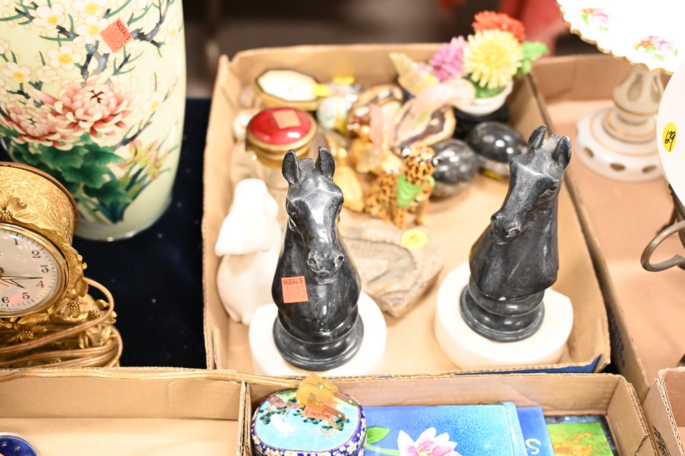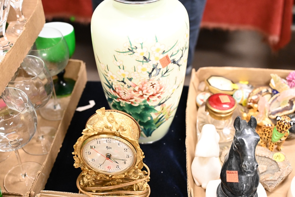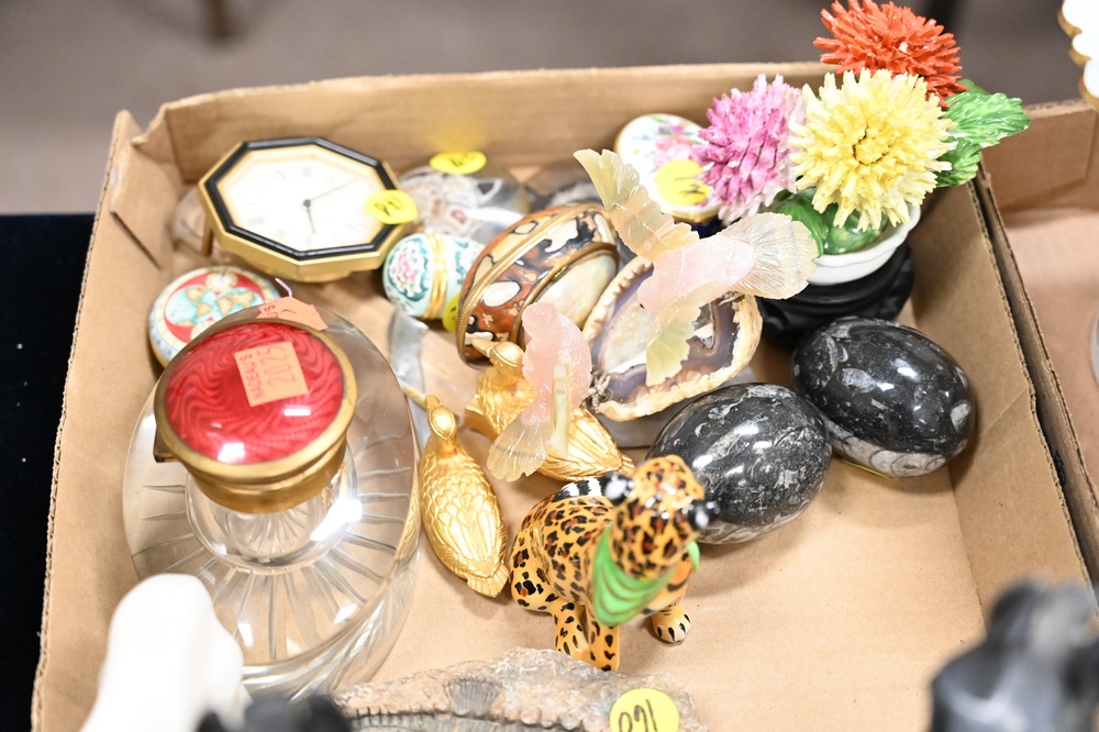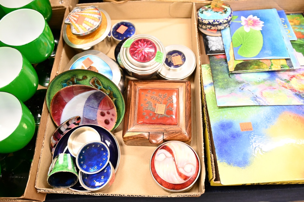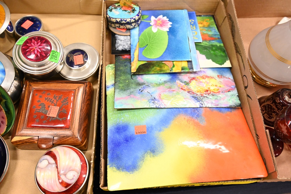 Lot 344: Three Tray Lots of Enameled Items, to include Joanne Conant enameled covered boxes, perfume bottle with brass enameled top, mother of pearl box, large enameled vase, etc. Provenance: Waterfront Estate, Stamford, CT.