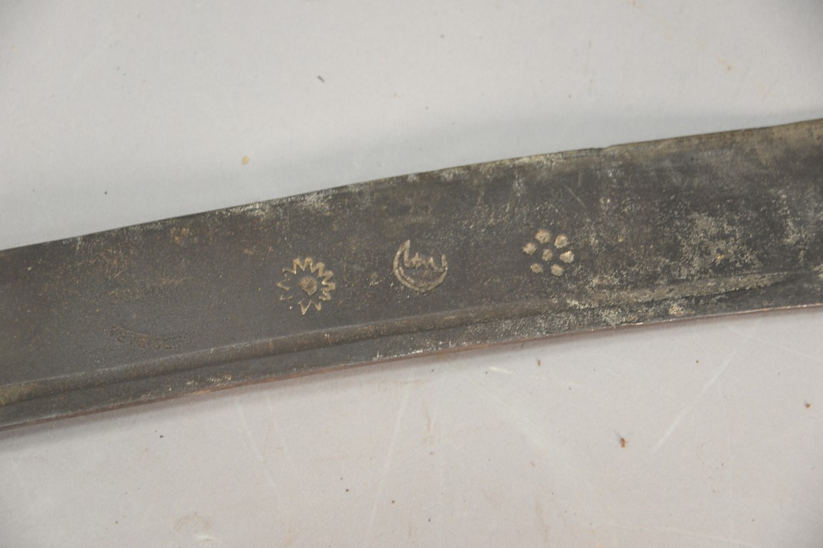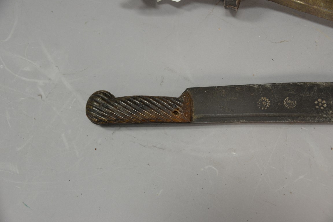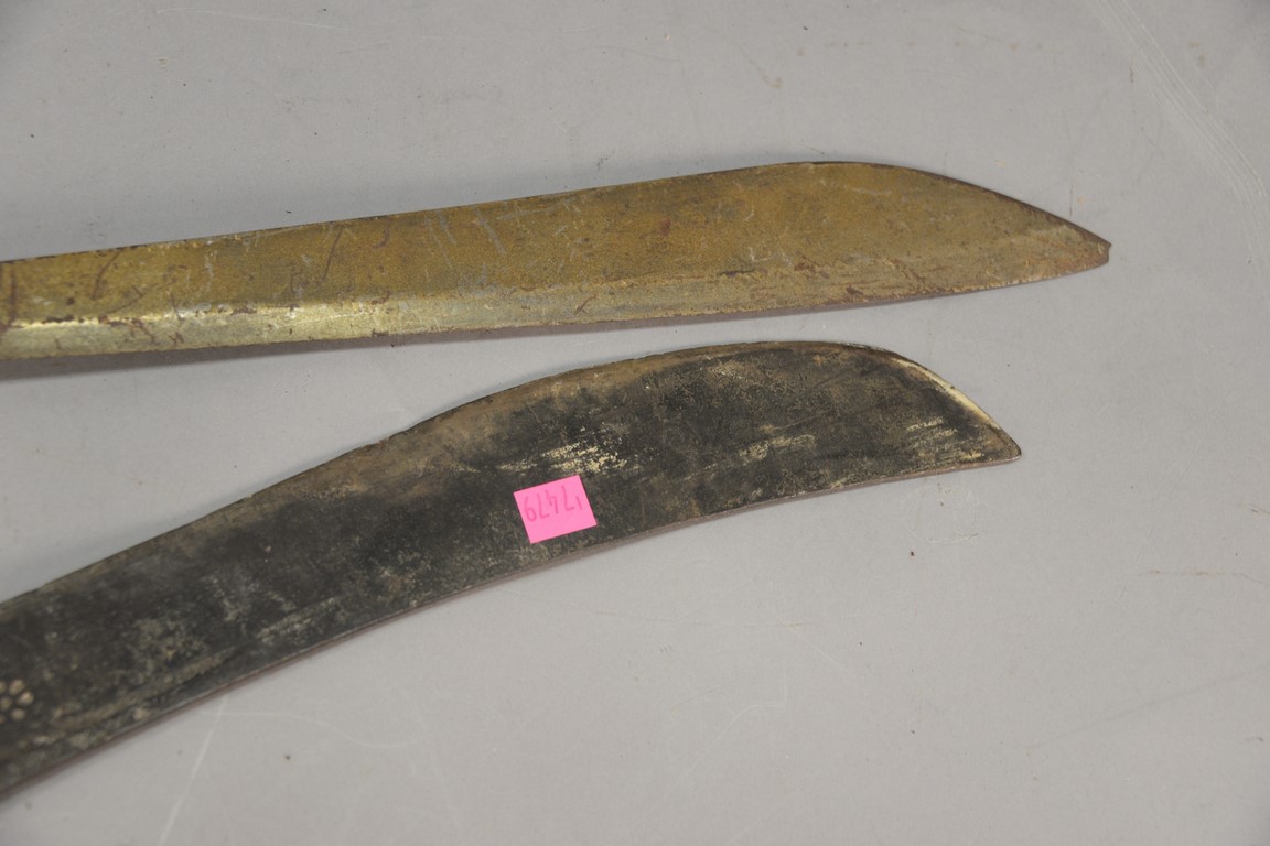 Two early wood handled machetes, one with carved face and silver mount face has chip. lg. 22in., lg. 24in.