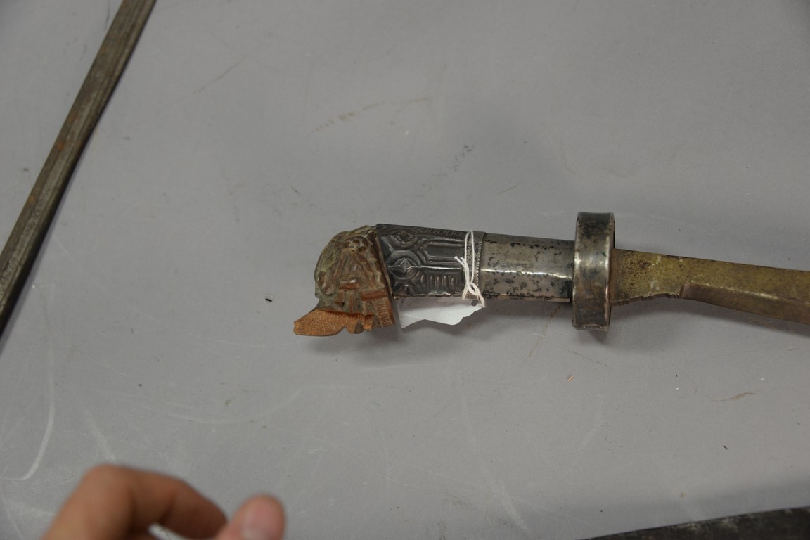 Lot 344: Two early wood handled machetes, one with carved face and silver mount face has chip. lg. 22in., lg. 24in.