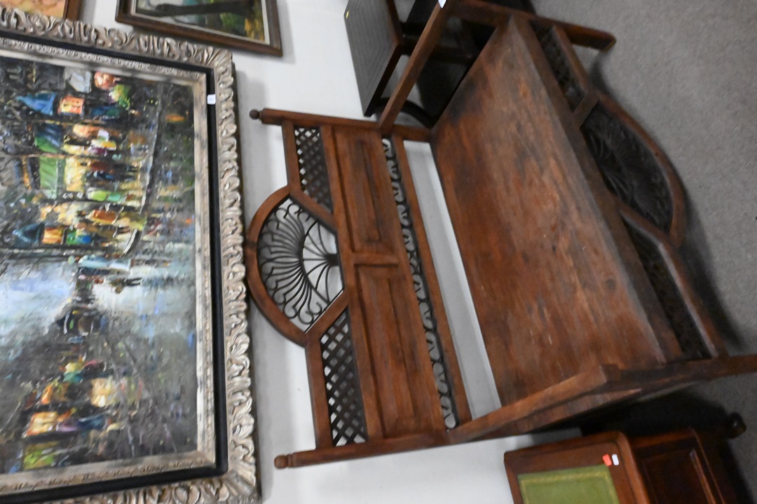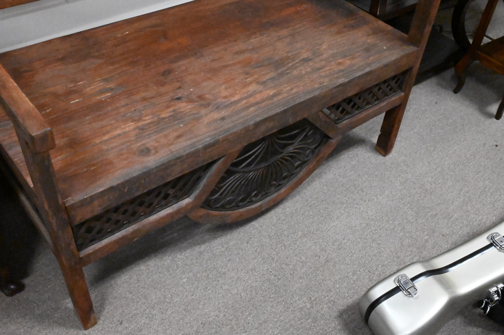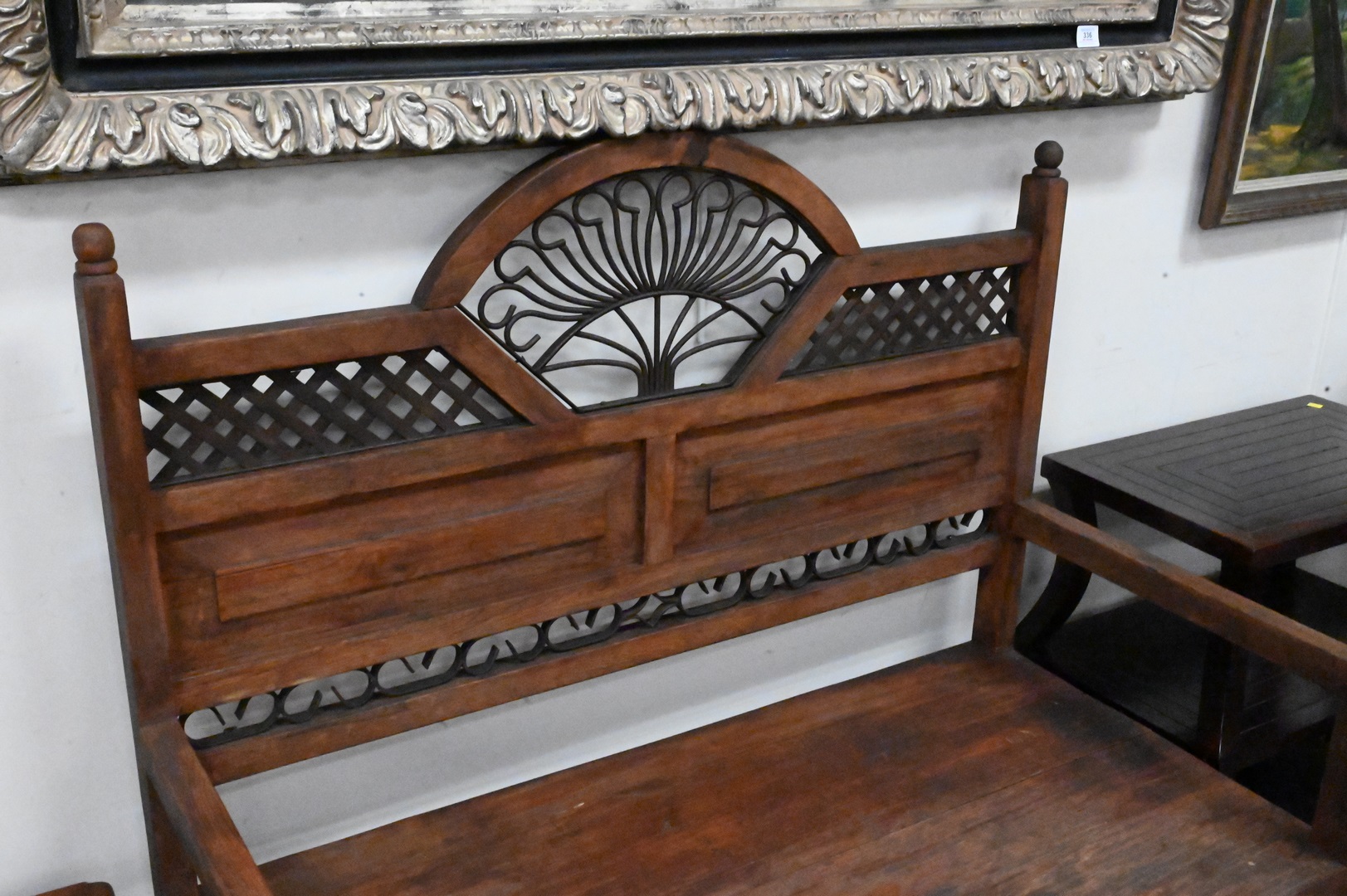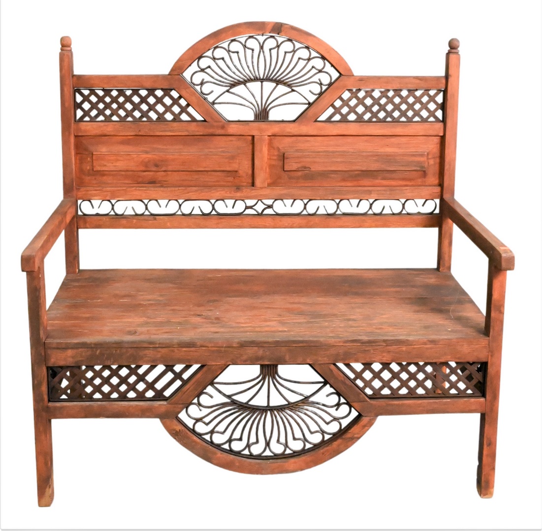 Wood and Iron Bench, having tree motif, height 46 inches, width 45 inches.