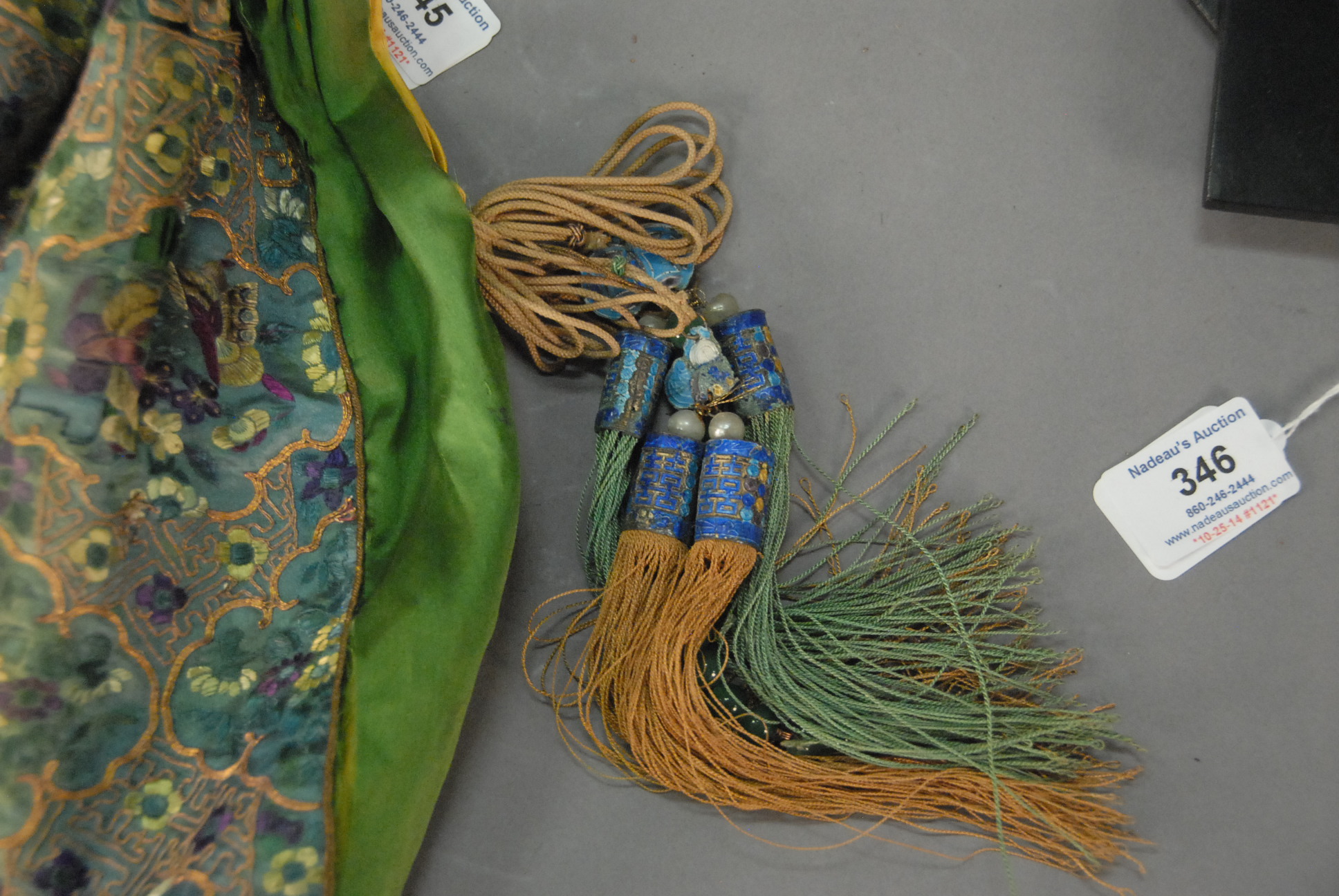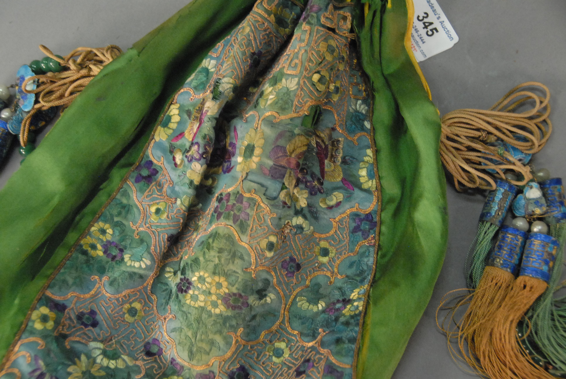 Lot 345: 19th Century silk bag pouch needlepoint decorated with silk and gold threads, handles made from twisted glass bracelets, bag decorated with enameled and jade tassels.