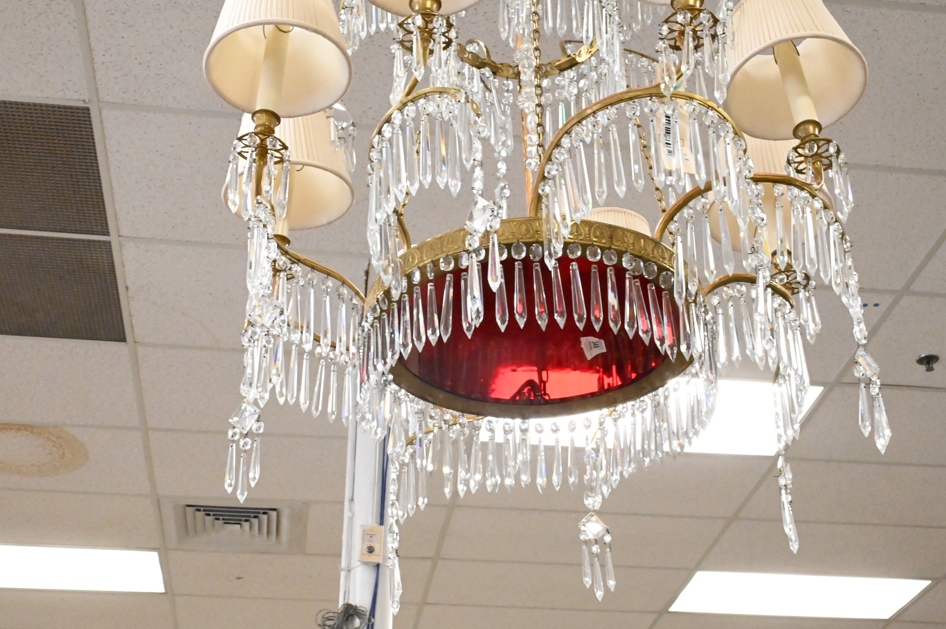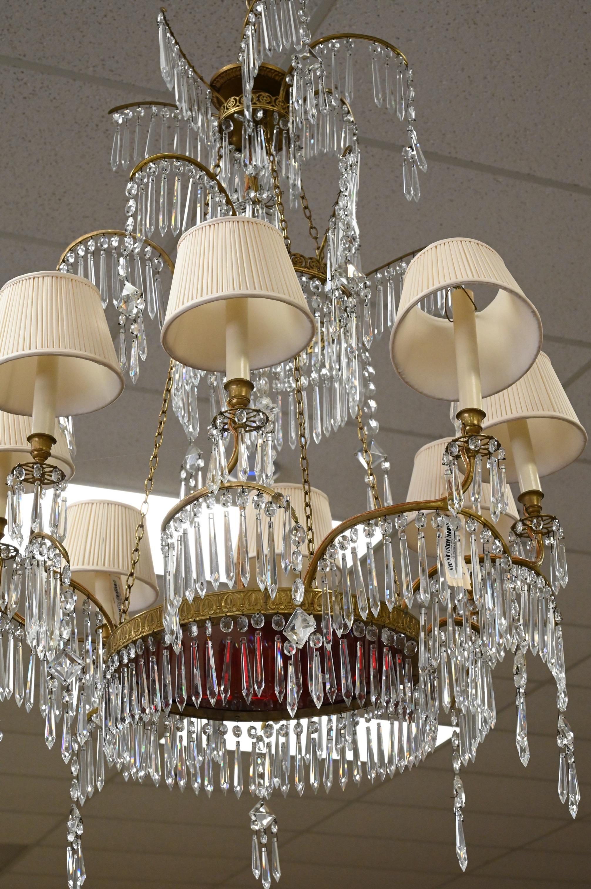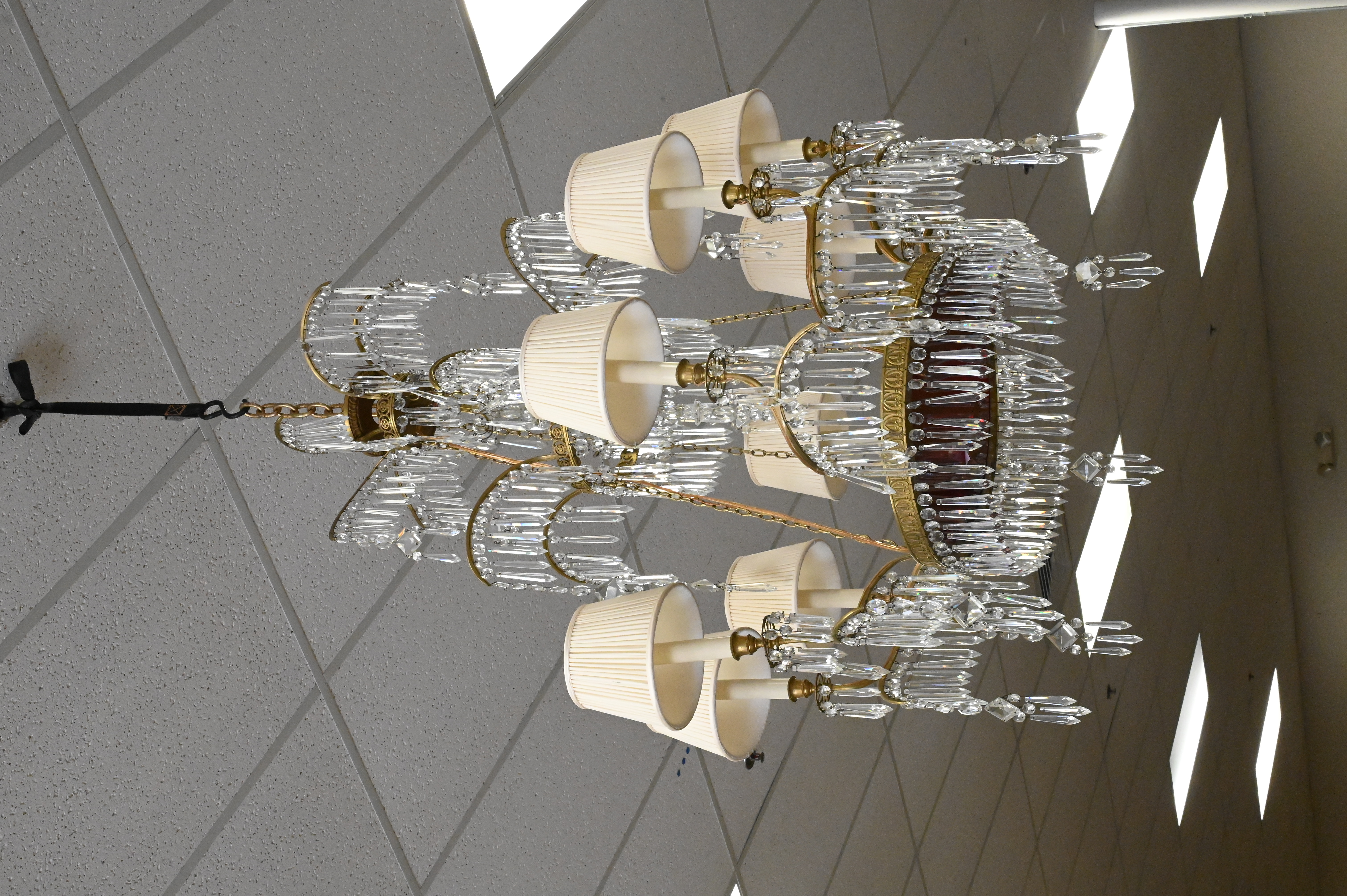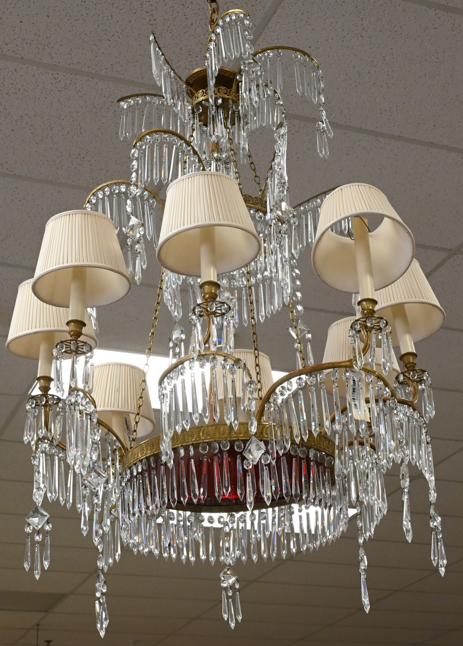 Lot 345: Baltic Gilt Metal Cut Glass and Ruby Glass Eight Light Chandelier