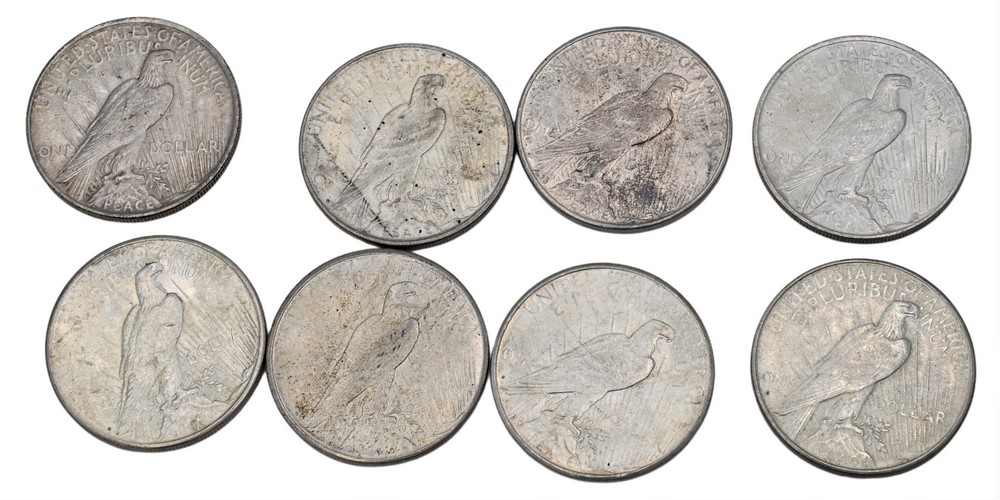 Eight Peace Silver Dollars.