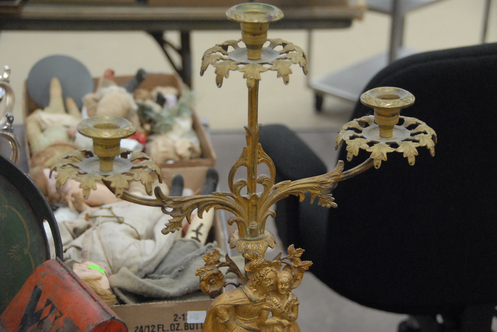Four box lots to include perfume, wood, brass, and bronze hand mirrors, tins, tole tray, brass candelabra, flatware, etc.