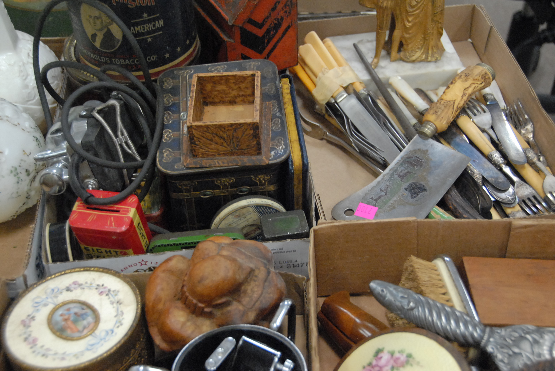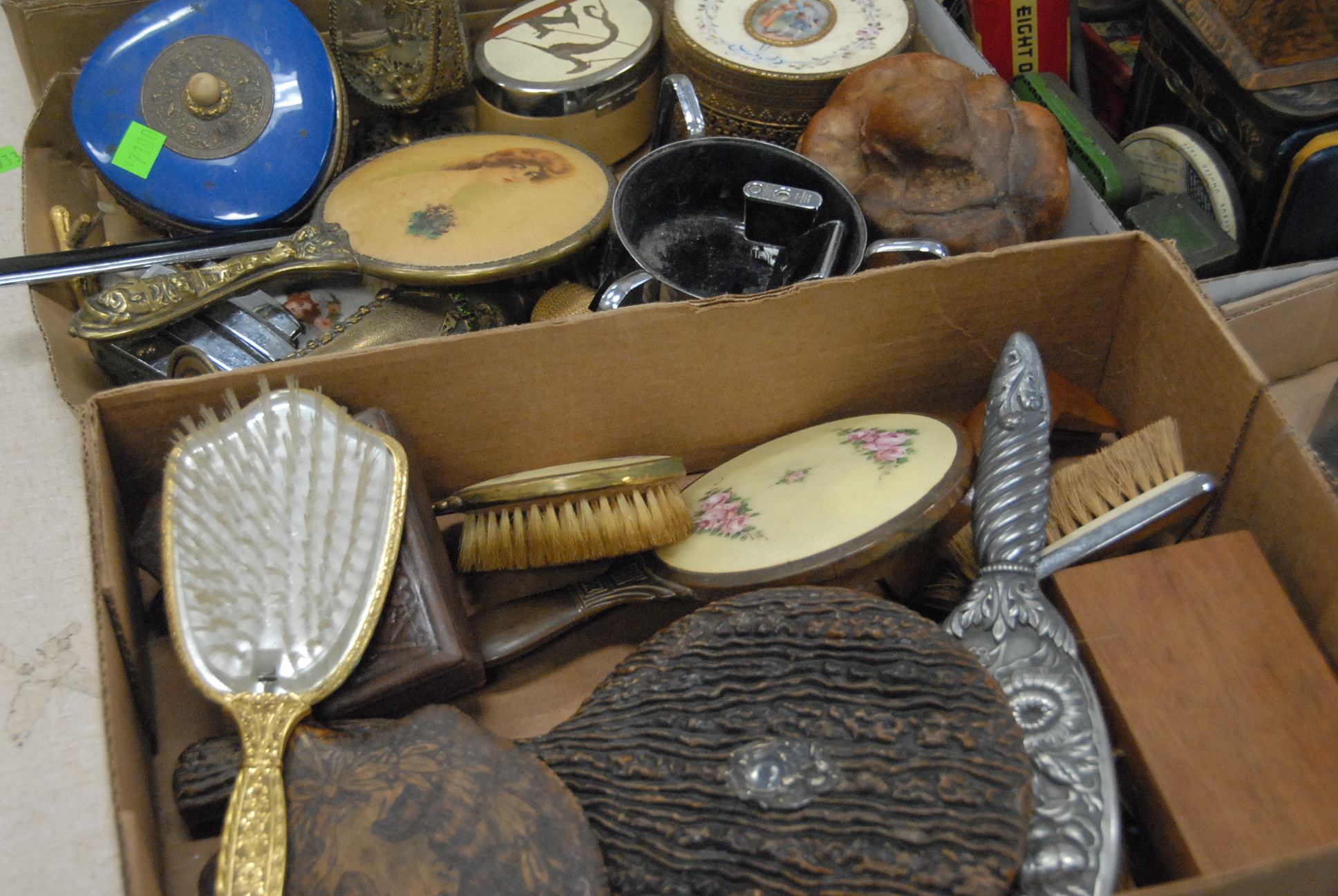 Lot 345: Four box lots to include perfume, wood, brass, and bronze hand mirrors, tins, tole tray, brass candelabra, flatware, etc.