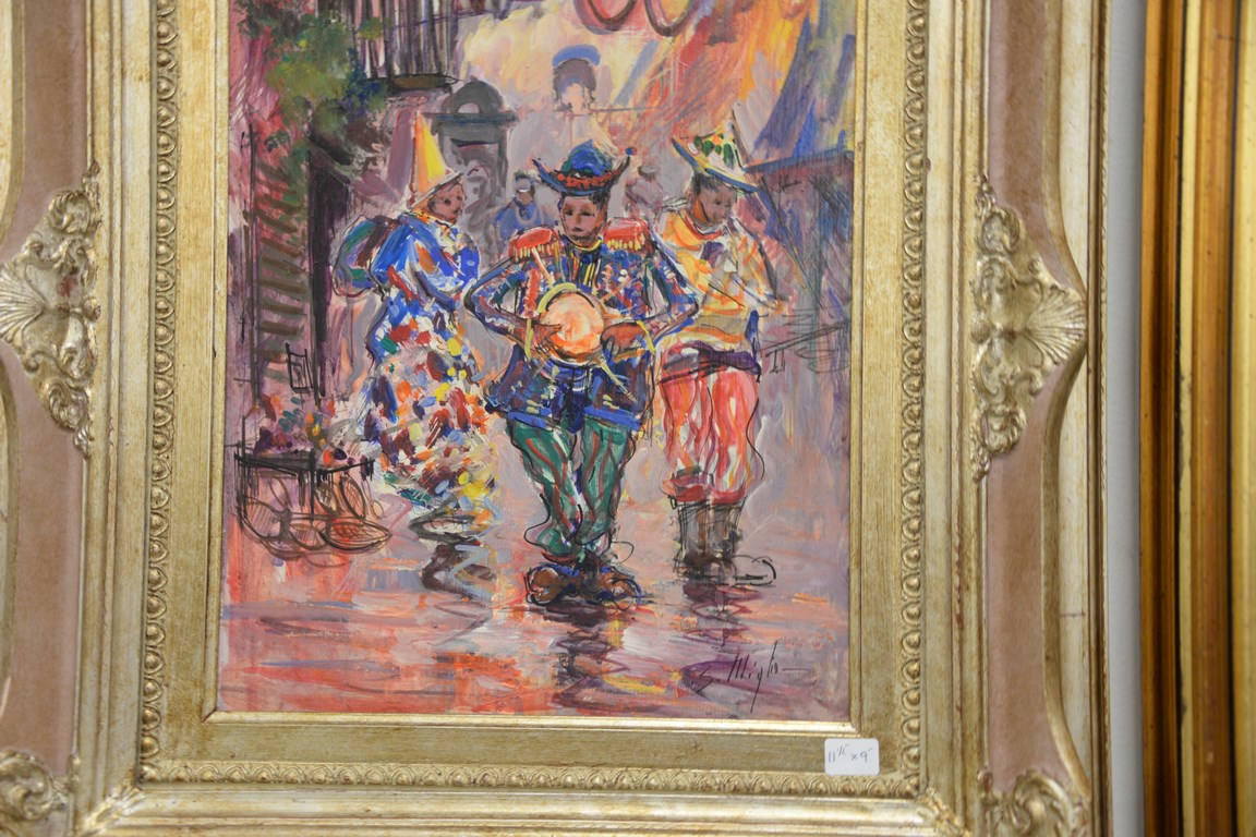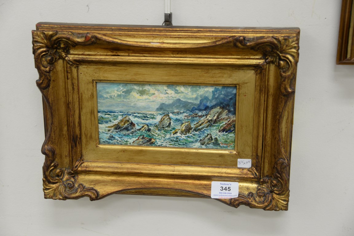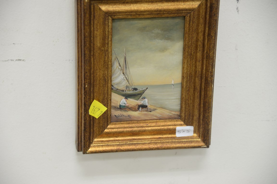 Lot 345: Group of four oil paintings including Parade signed indistinctly 11 x 9, small painting with sailboat 5 x 3, oil on board of wav…