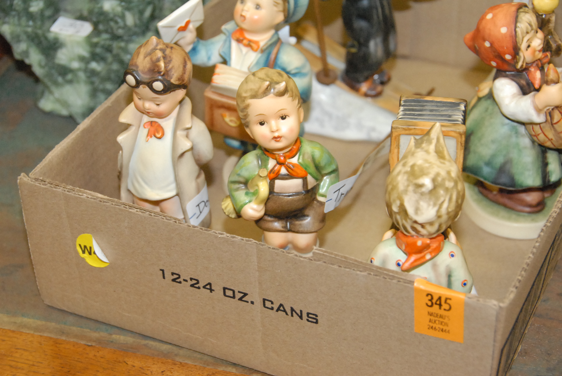 Group of six Hummels to include Doctor, Postman, Chicken Lickin, Skier, Trumpet Boy, and The Photographer, some with crowns.