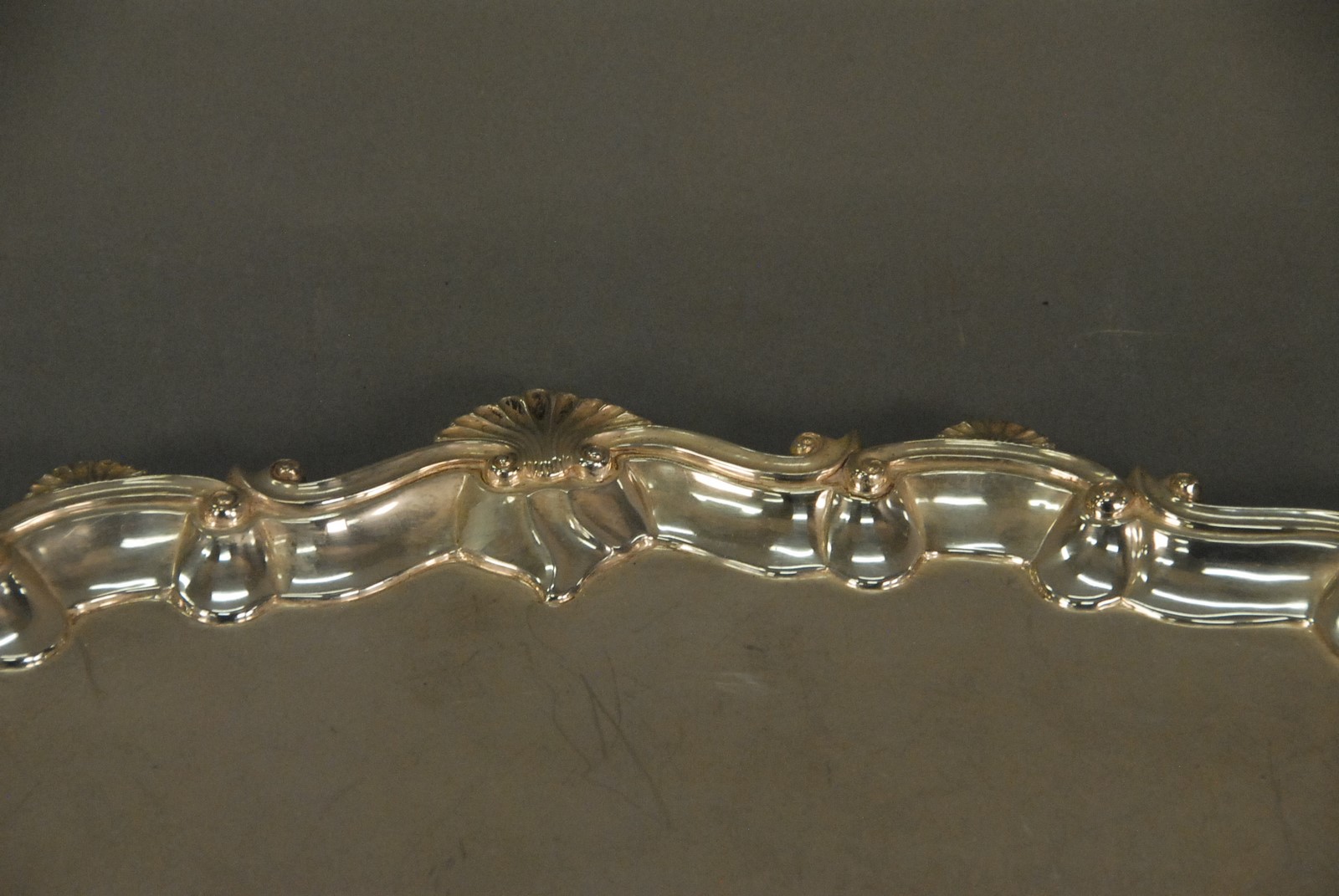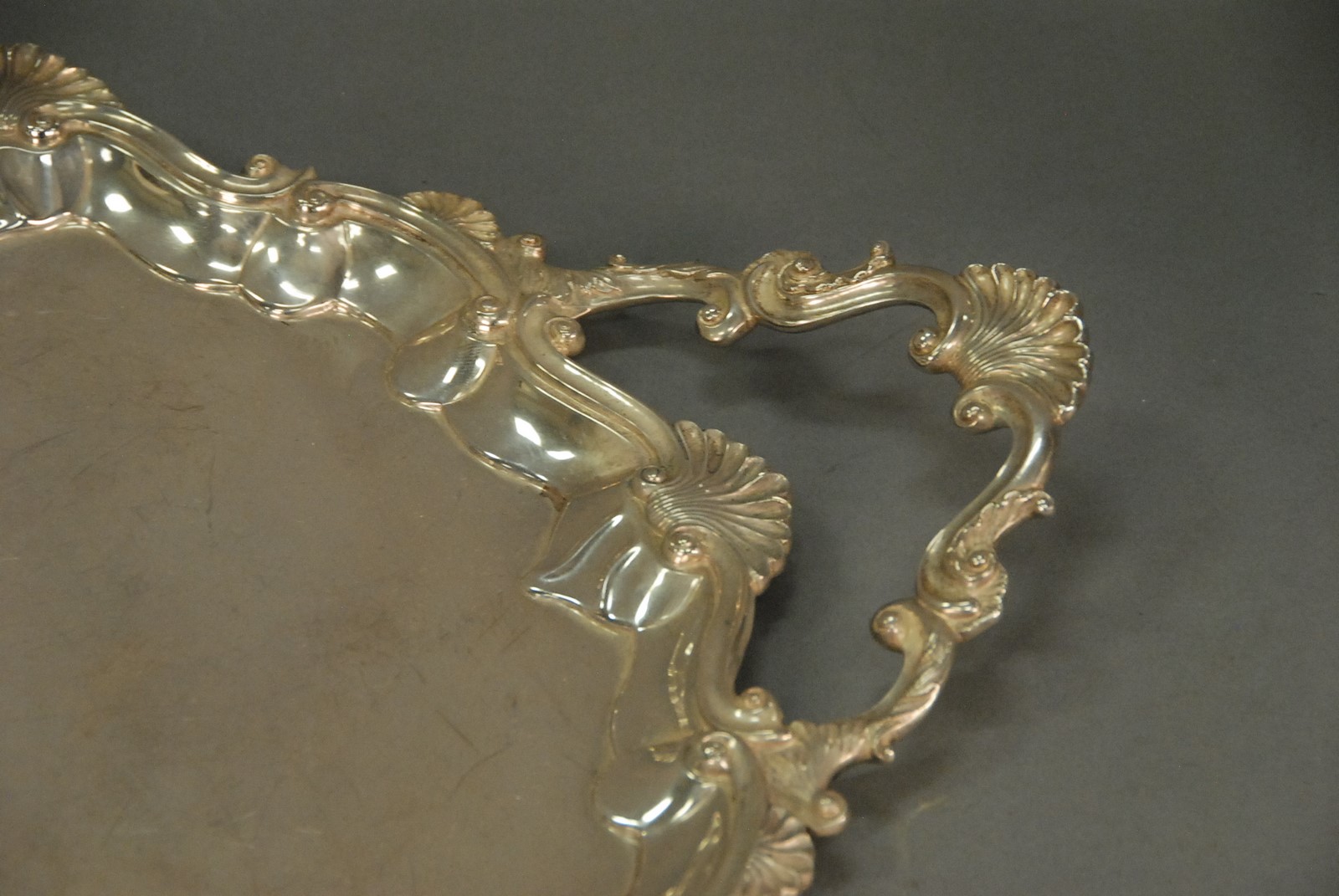 Large sterling silver two handled tray of oval shape having shell and scroll border and handles with maker’s mark CSH – Charles Stuart Harris, London. 108.1 t oz.