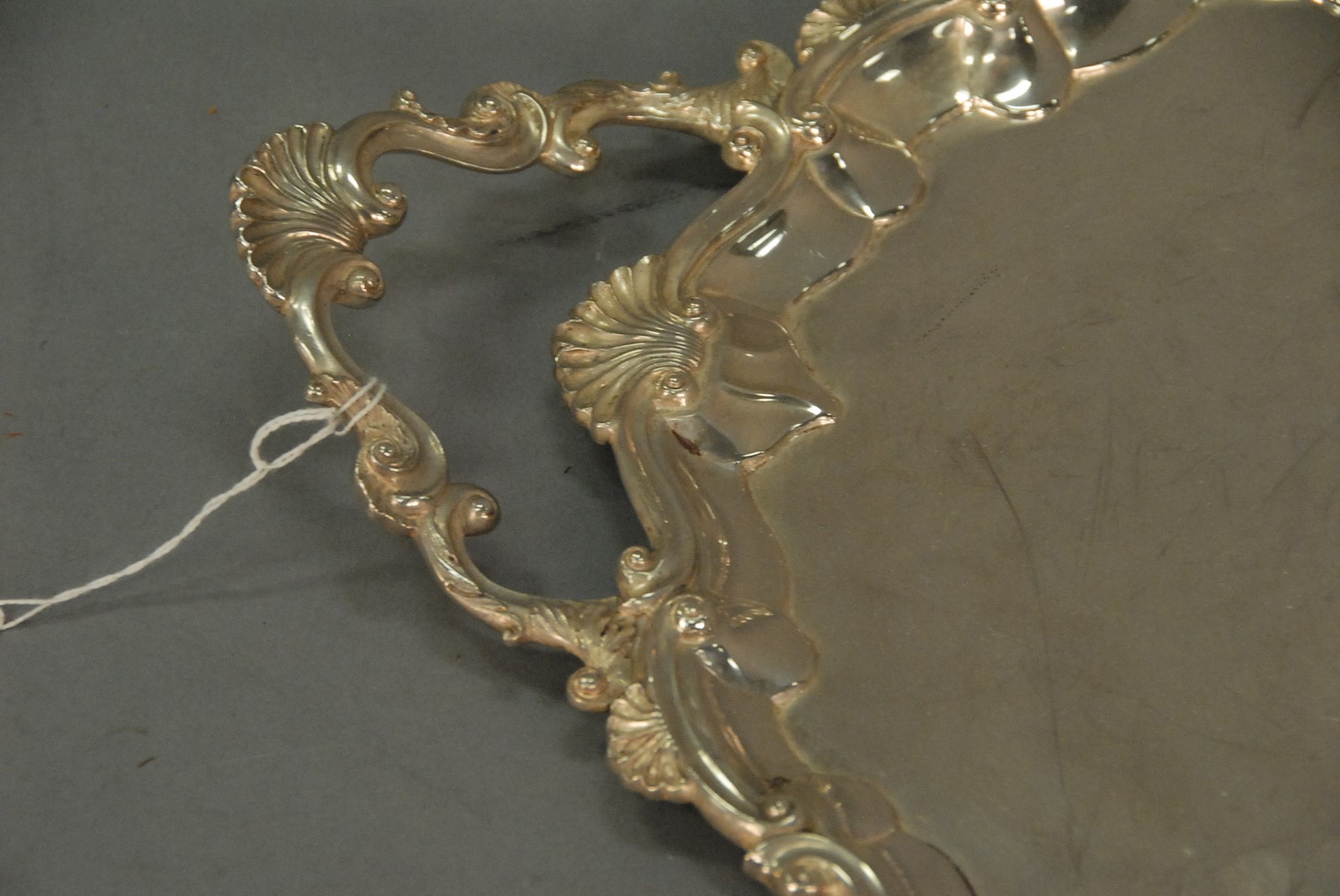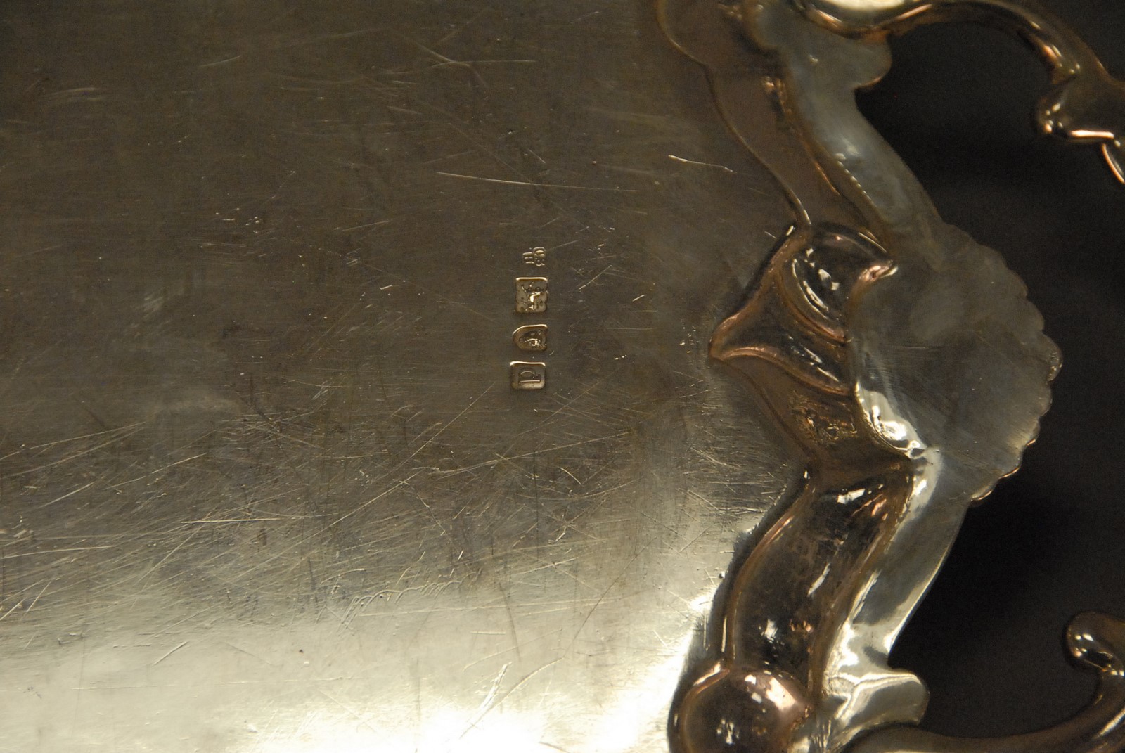 Lot 345: Large sterling silver two handled tray of oval shape having shell and scroll border and handles with maker’s mark CSH – Charles Stuart Harris, London. 108.1 t oz.