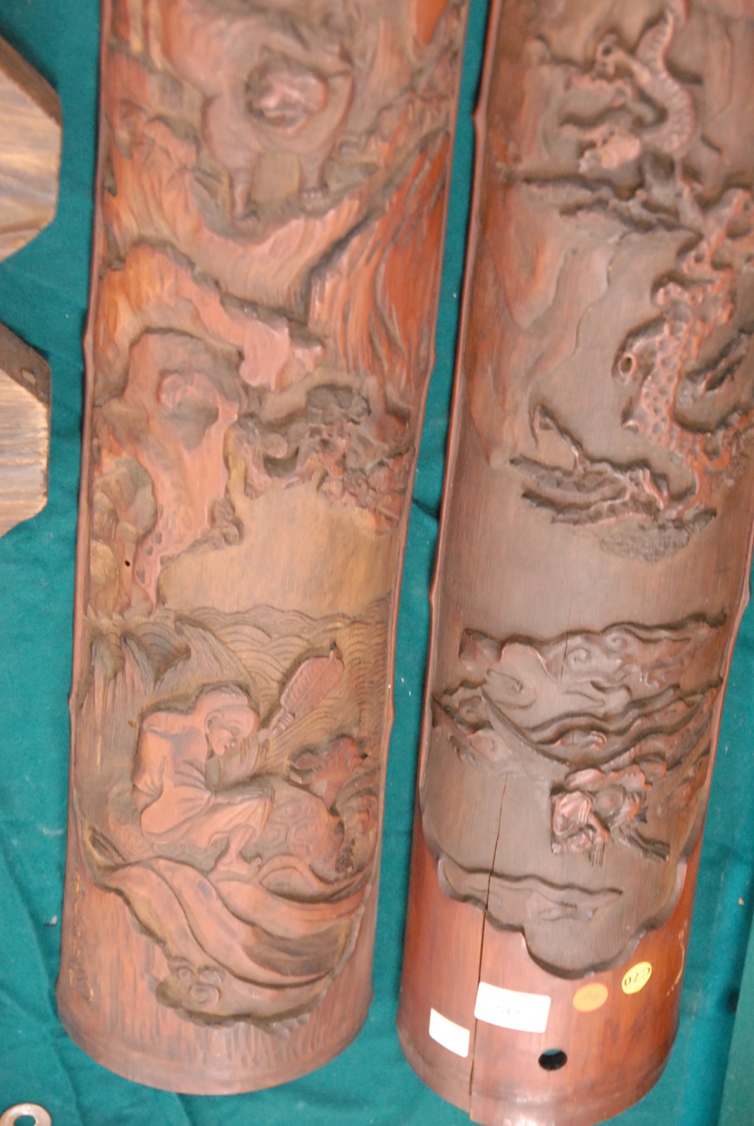 Pair of large Chinese bamboo wall columns intricately carved with tiered landscapes, 20th century.