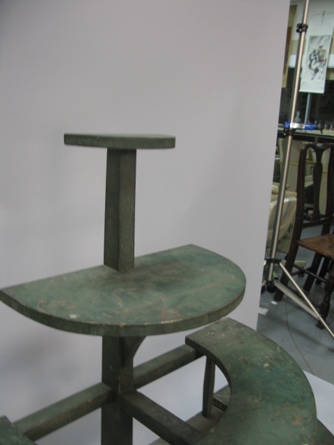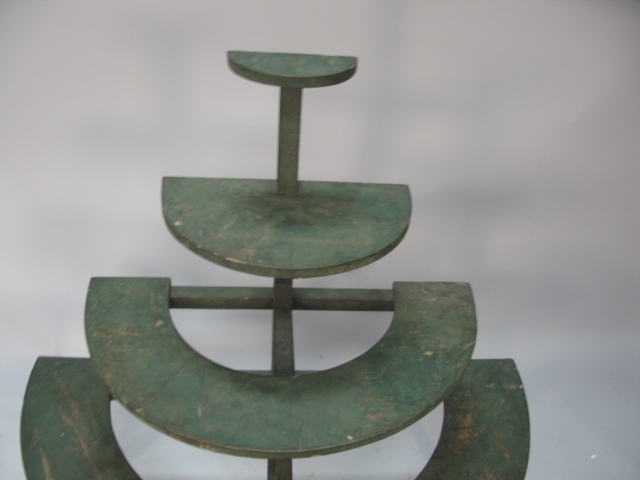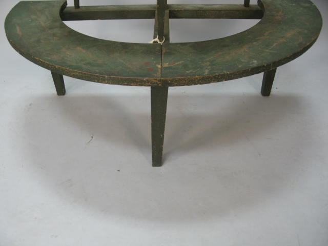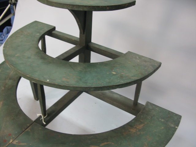 Primitive 1/2 round wooded plant shelf, four tier with old green paint.