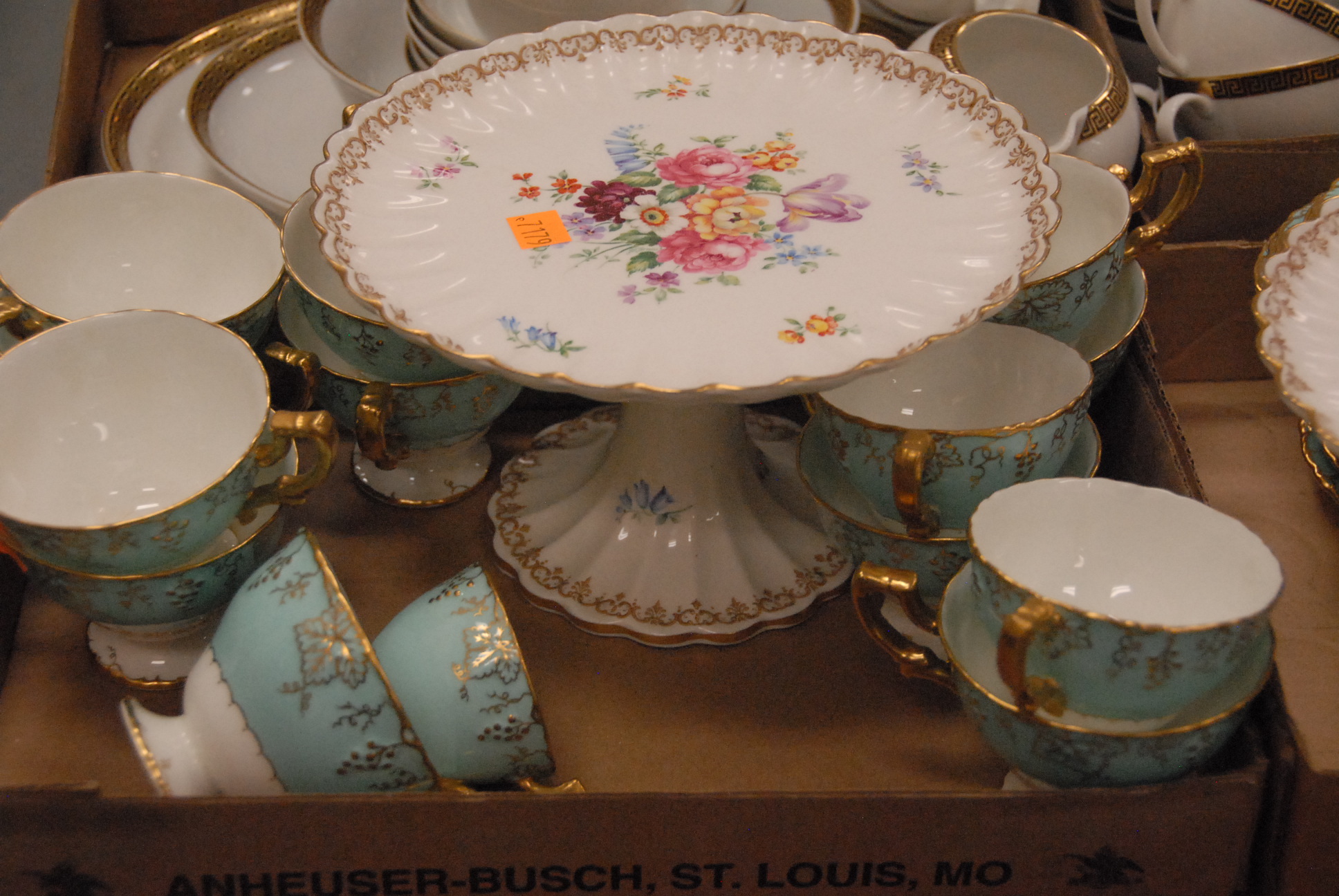 Royal Crown Derby partial dinner set and two porcelain compotes.