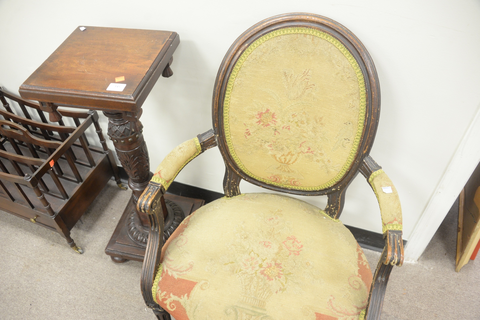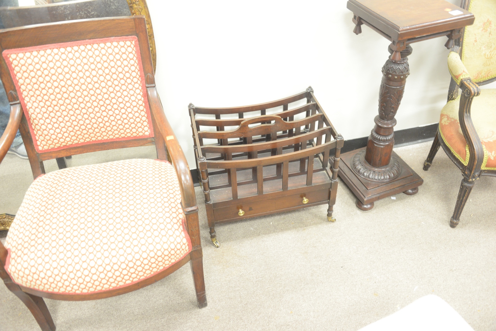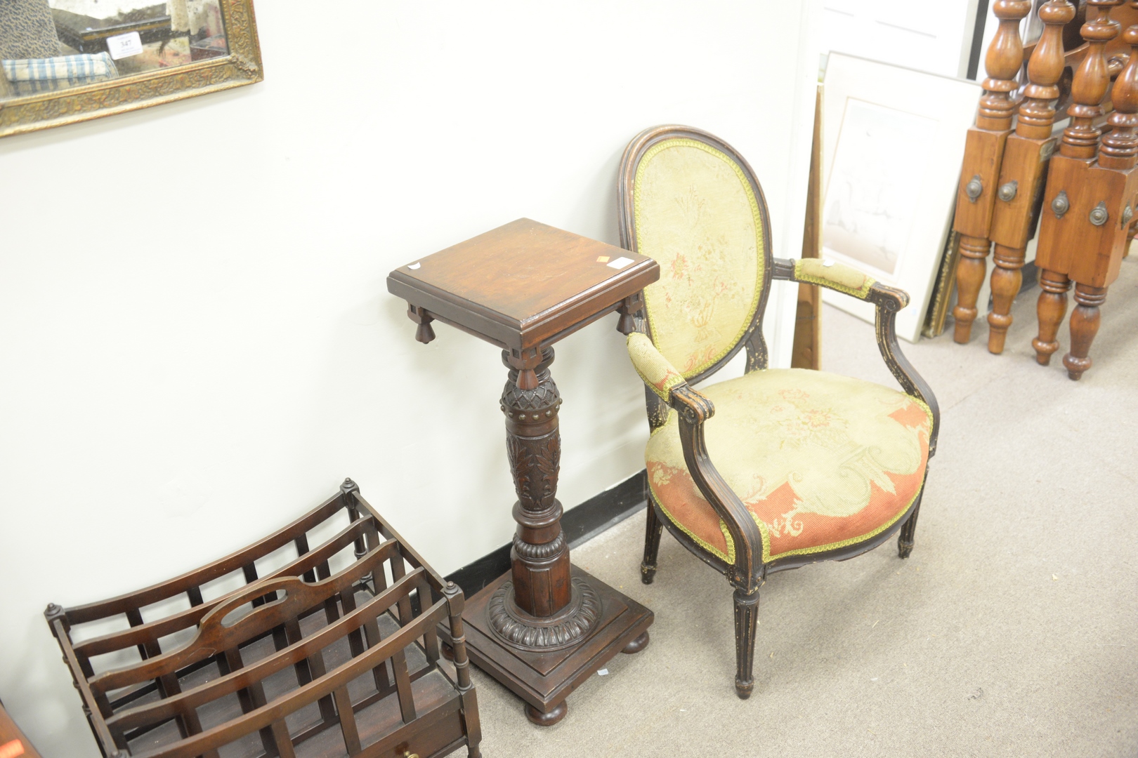 Lot 345: Seven Piece Lot, to include 2 armchairs 1 carved pedestal, height 32 1/2 inches, top 12 x 12 1 Canterbury along with two side c…