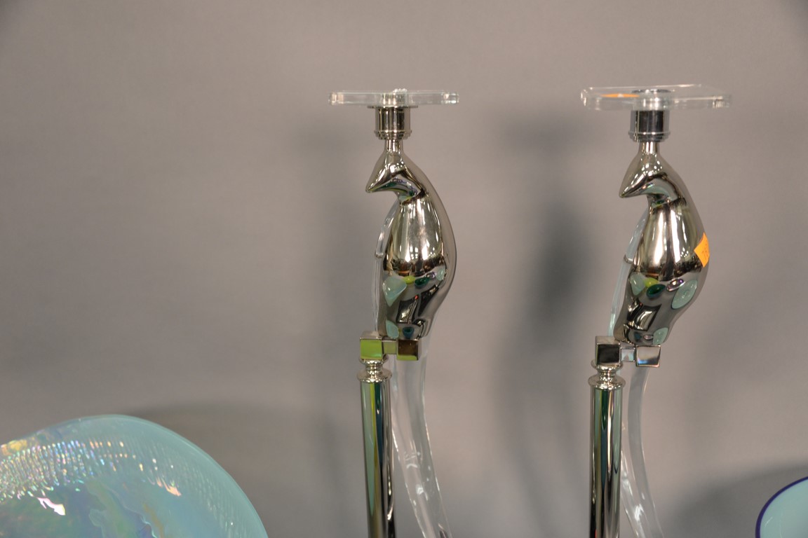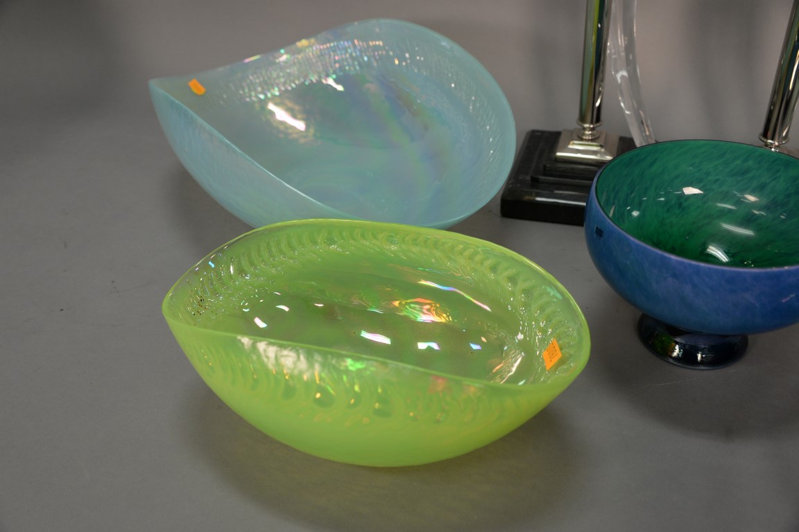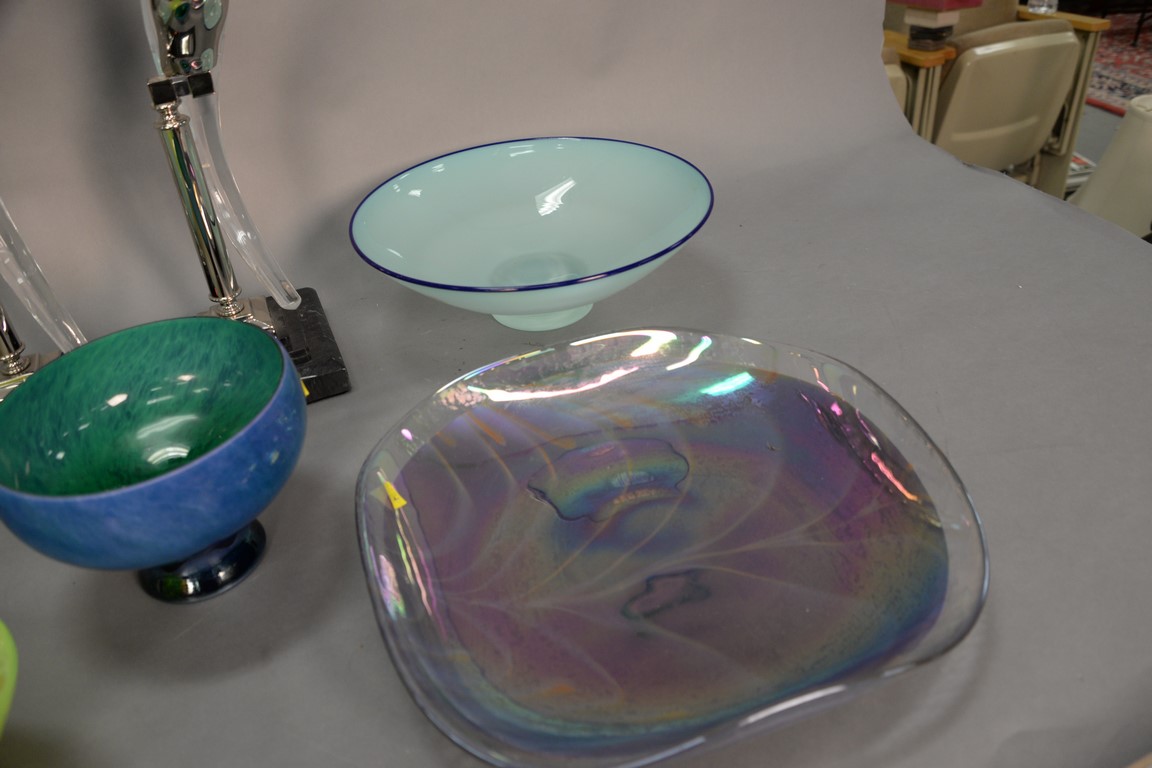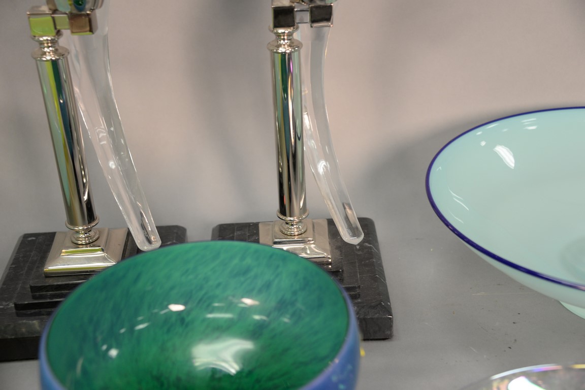 Seven piece lot to include three Yalos Casa Murano glass center bowls, Caithness green and blue bowl, pair of bird candlesticks with marble bases, and N. Kekic art glass bowl. largest bowl: lg. 20 in.