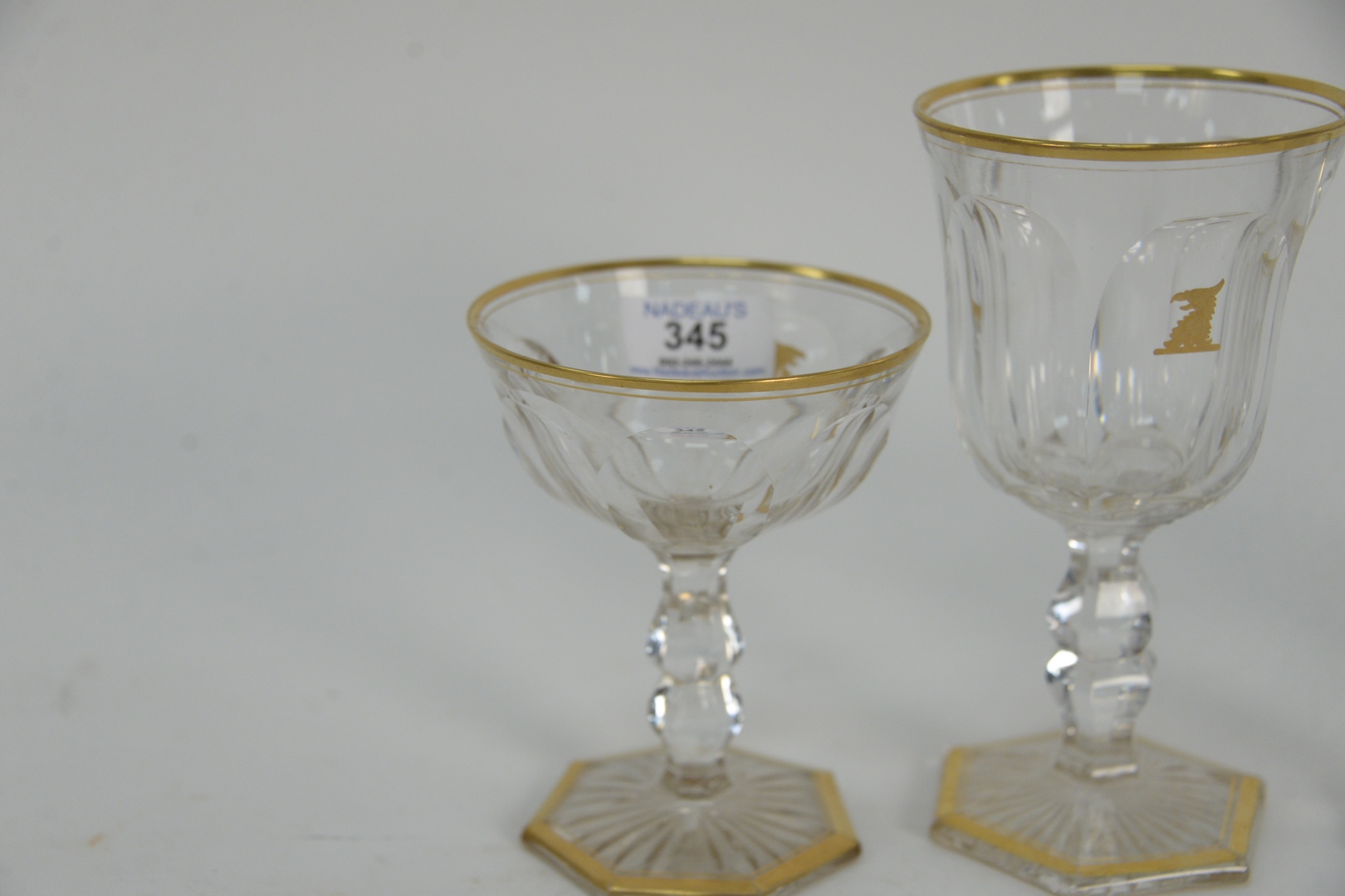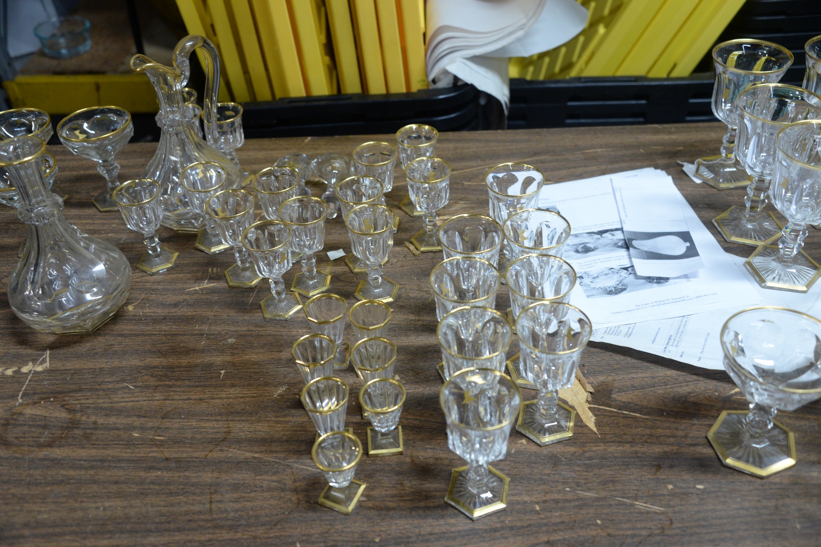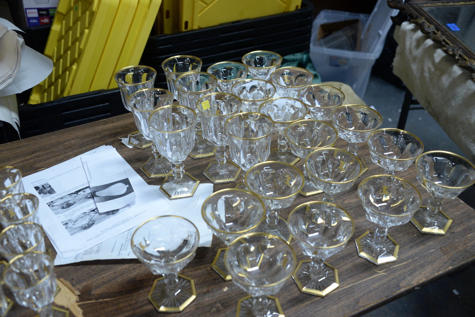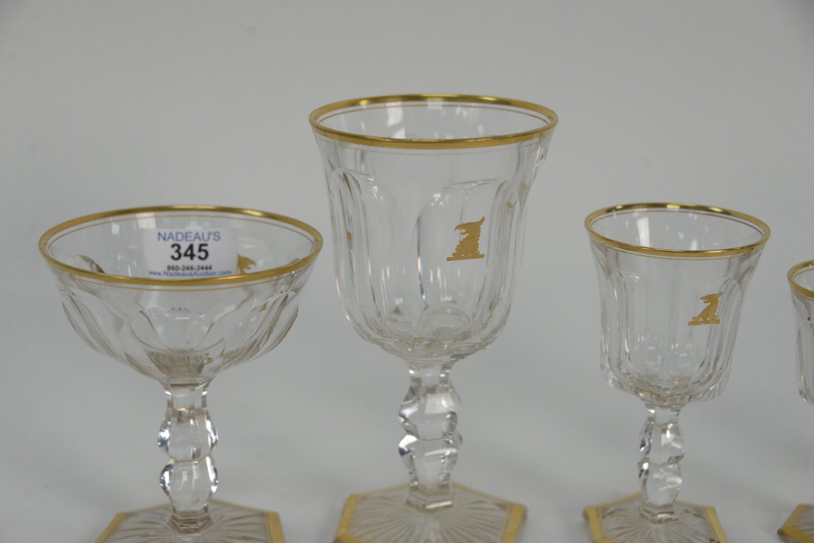 Lot 345: Sixty Three Piece Set of Crystal having gold rim on hexagonal gold rimmed bases and gilt bud cartouche, to include 8 red wine, 18 white wine, 9 sherry stemmed glasses, 15 large stemmed cordials, 3 small white wine, 8 small cordials with square foot,