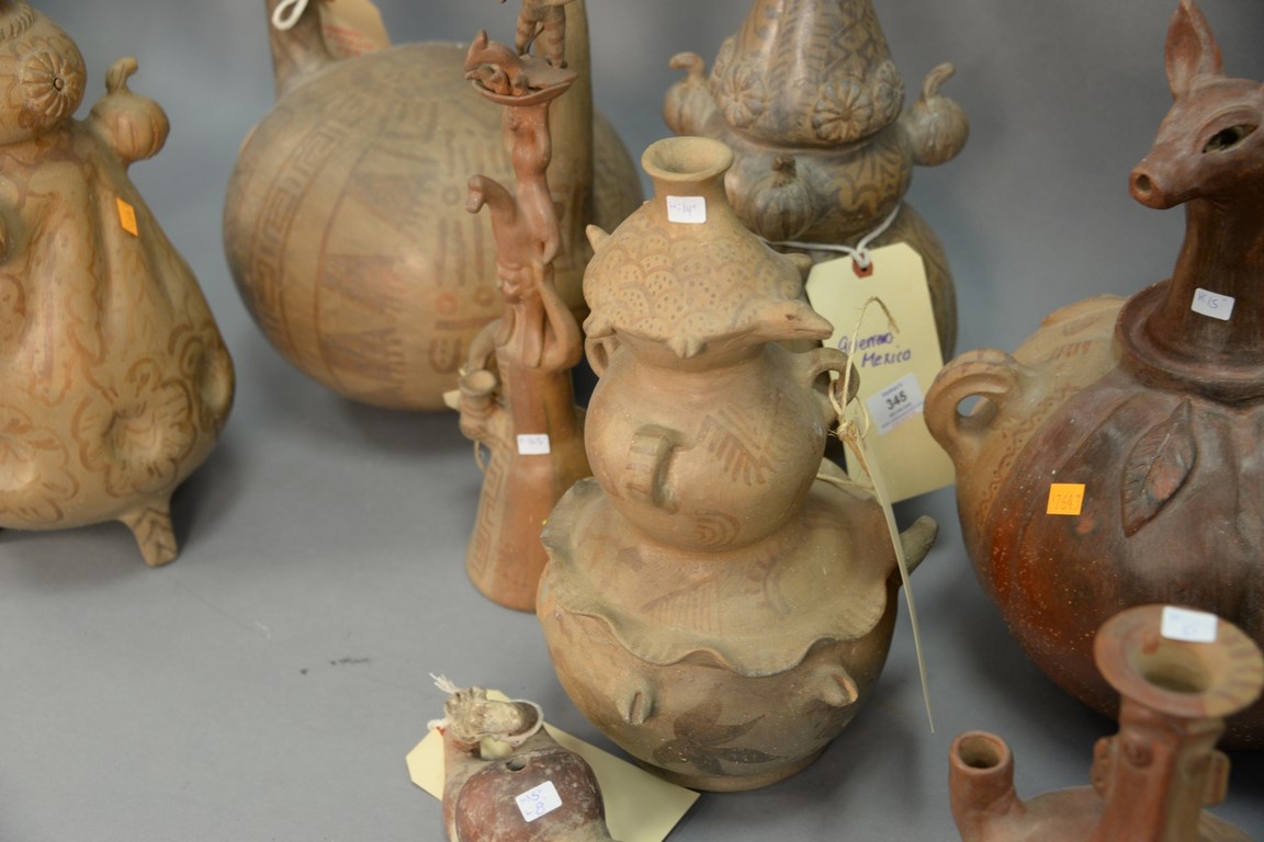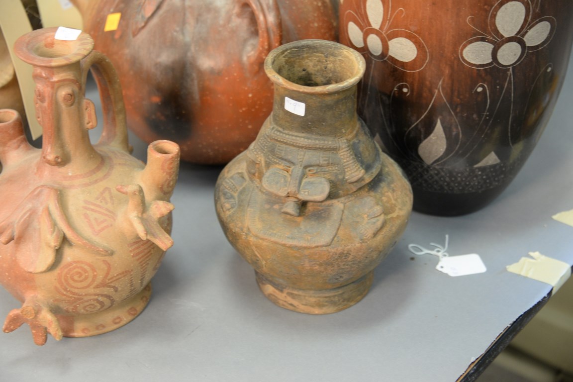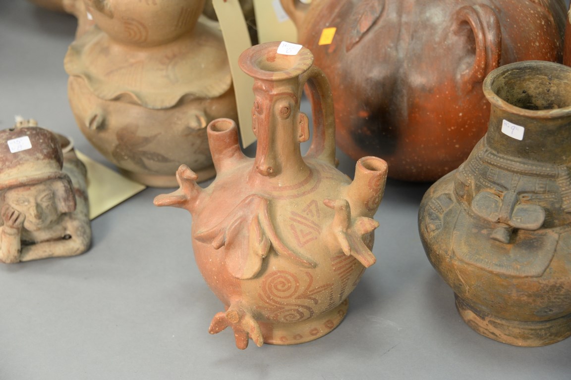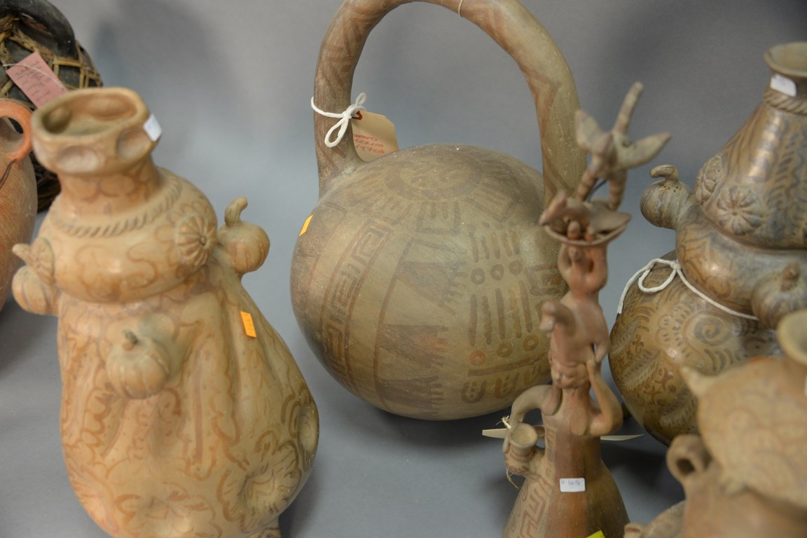 Ten South American Indian pottery vessels to include vessels with molded gourde and birds, one with gourde body and animal head spout, large vase, Ecuador figure, etc. hts. 5 in. to 19 in.