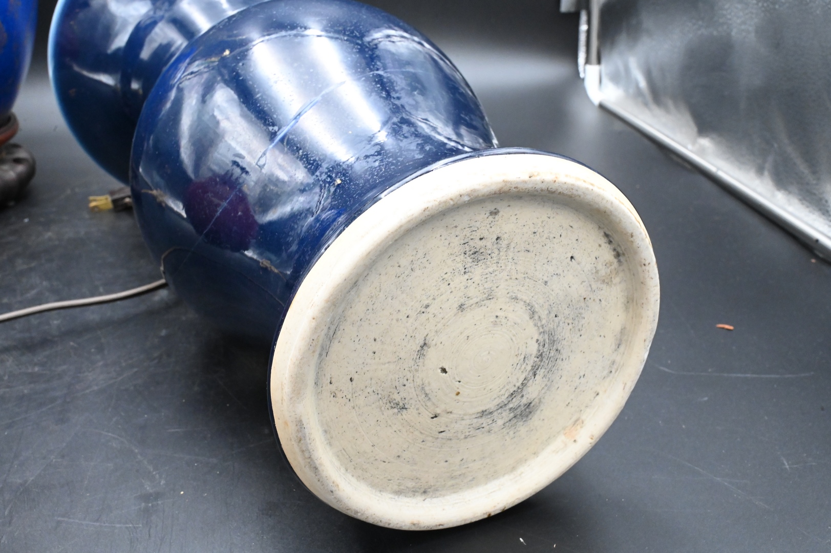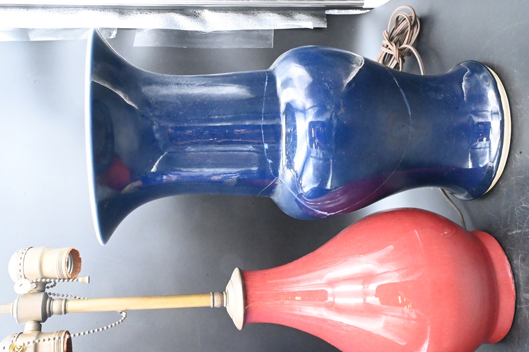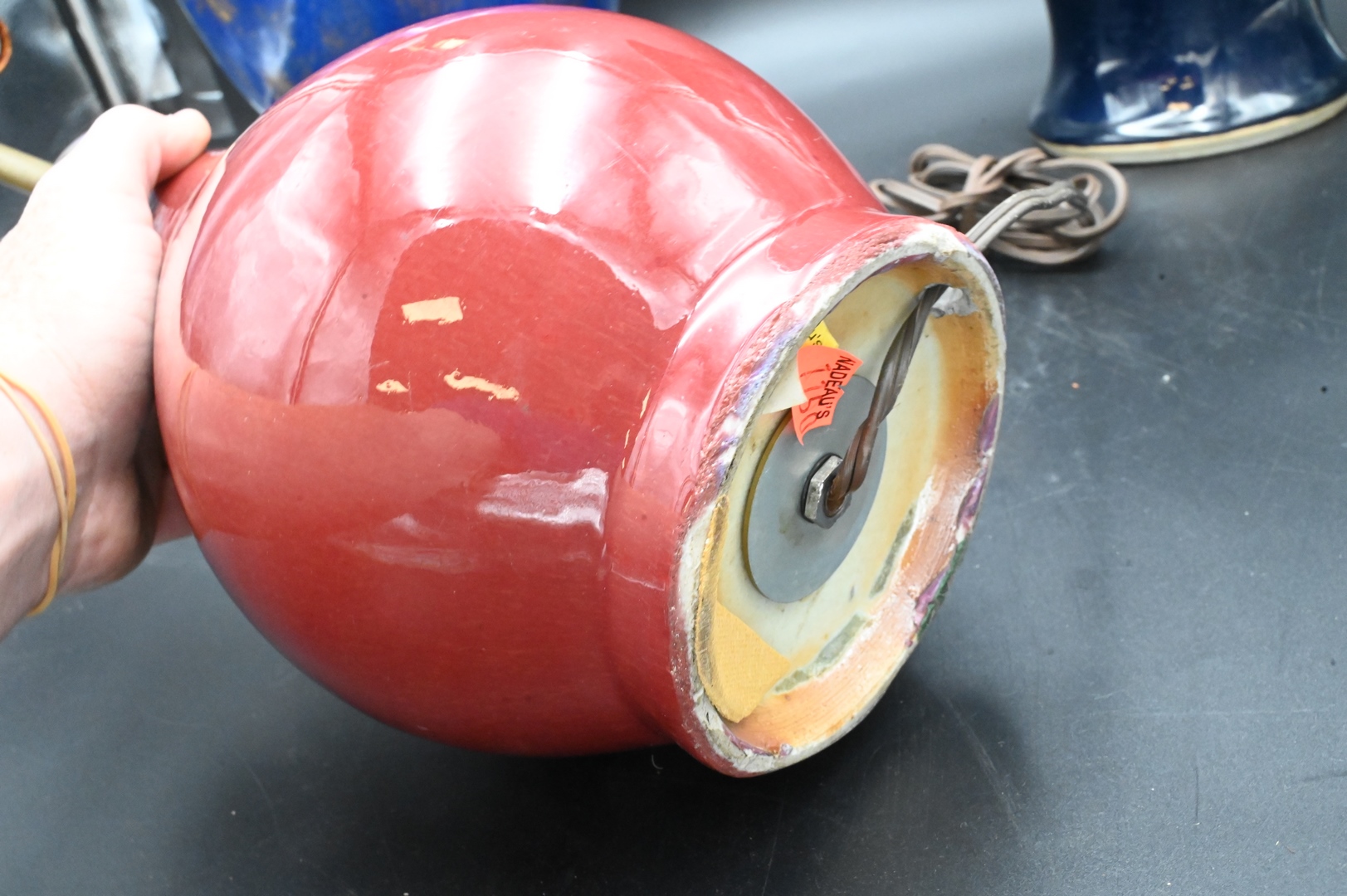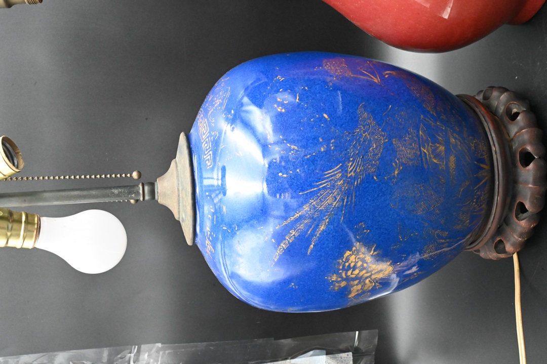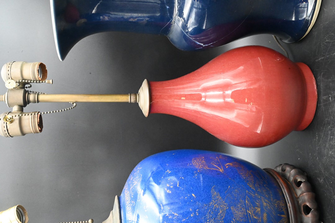 Three Chinese Porcelain Vases, to include a powder blue with gold decoration, vase height 10 inches; a red glazed pear shaped vase, height 10 1/2 inches; along with a dark blue glazed vase, made into a table lamp, (repaired), height 16 inches. Provenance: Estate of Wallace Bradway, New Haven, CT.